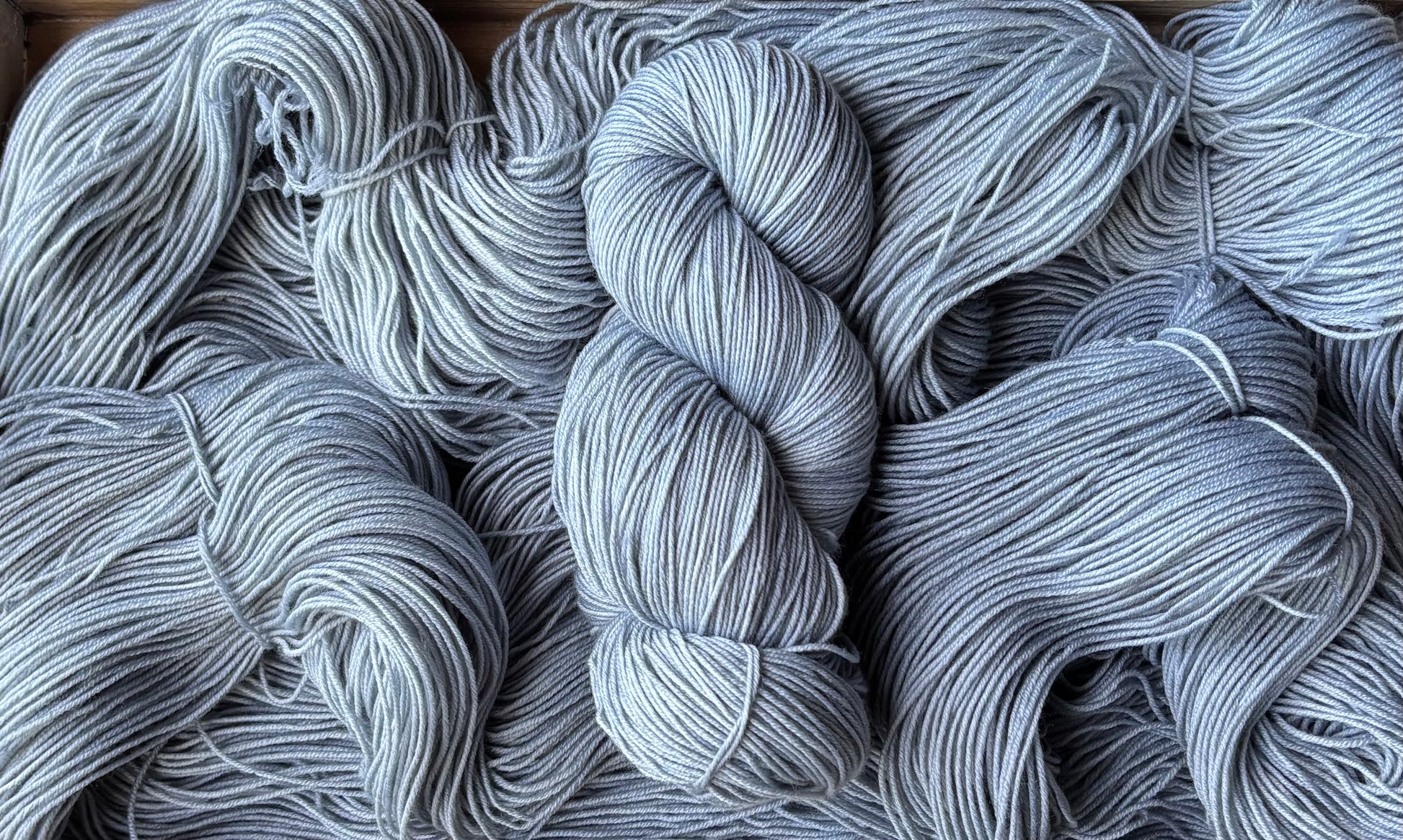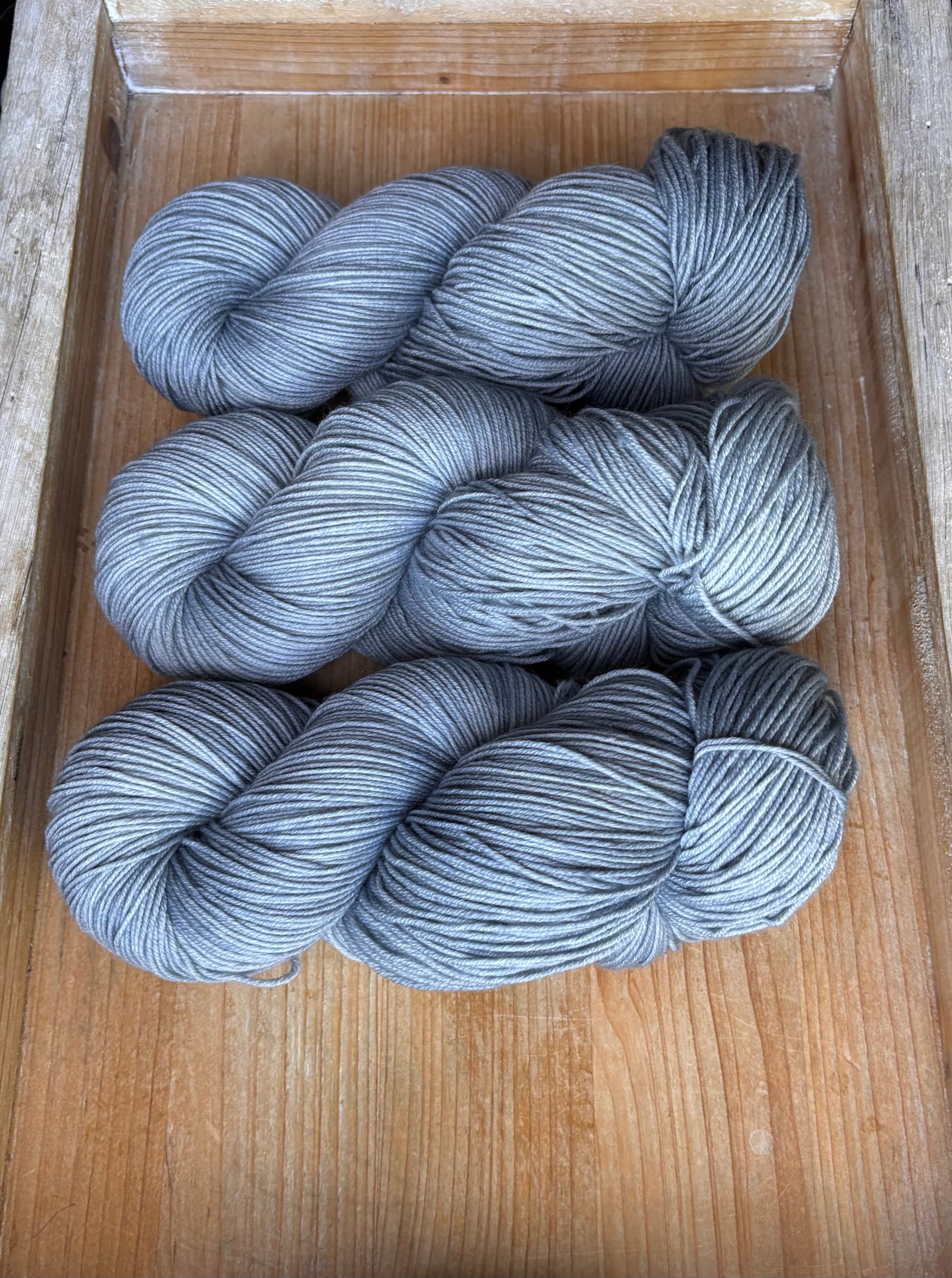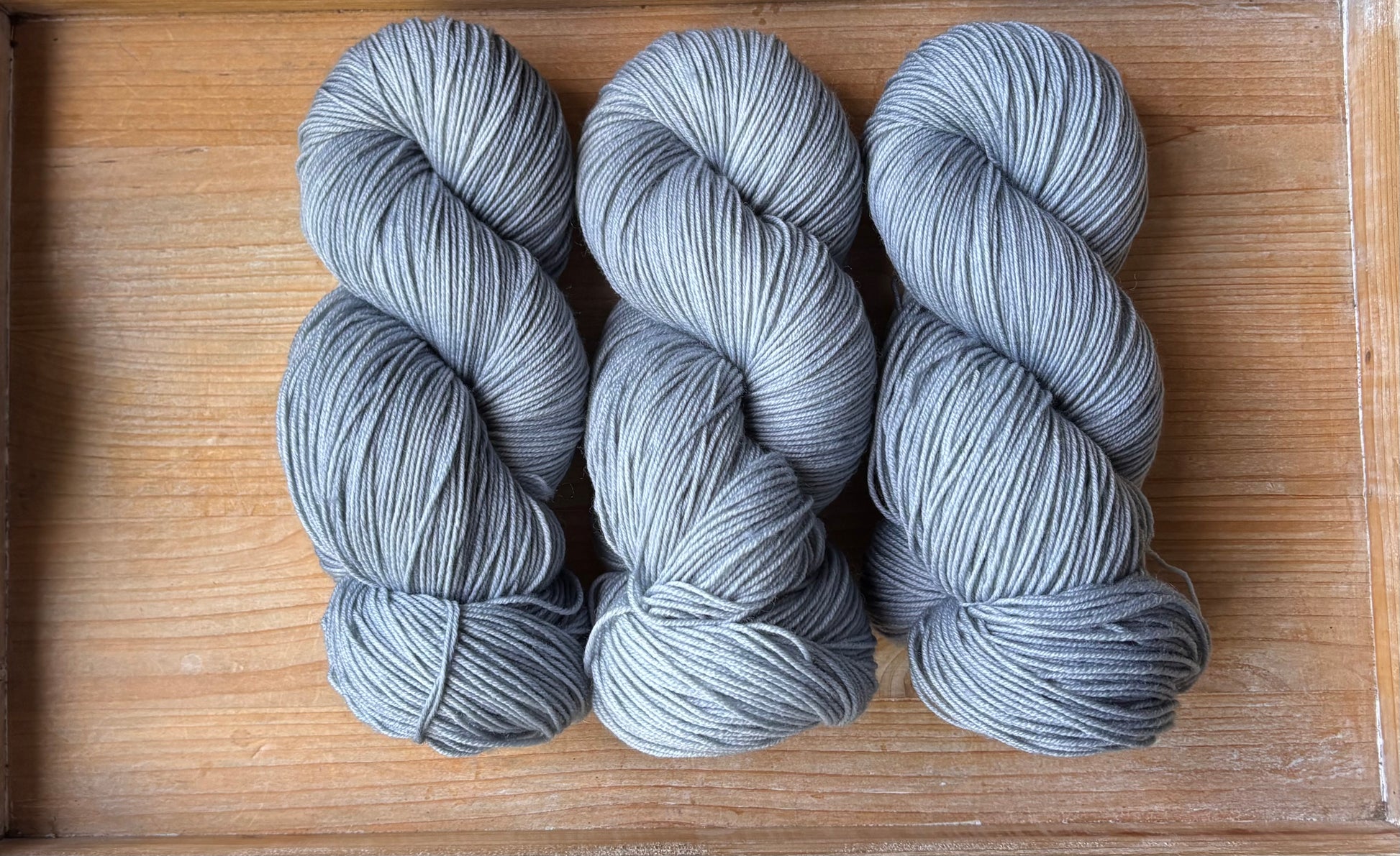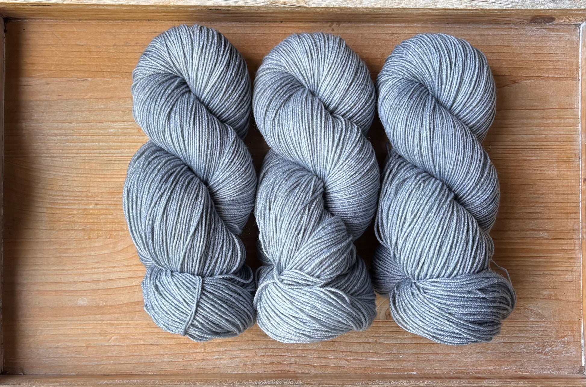 Shiver est un magnifique bleu argenté, ultra portable et qui se marie si bien avec d'autres coloris. La première photo apparaît plus grise qu'elle ne l'est en réalité, veuillez voir la photo de groupe de 3 écheveaux côte à côte pour une représentation plus précise des couleurs !