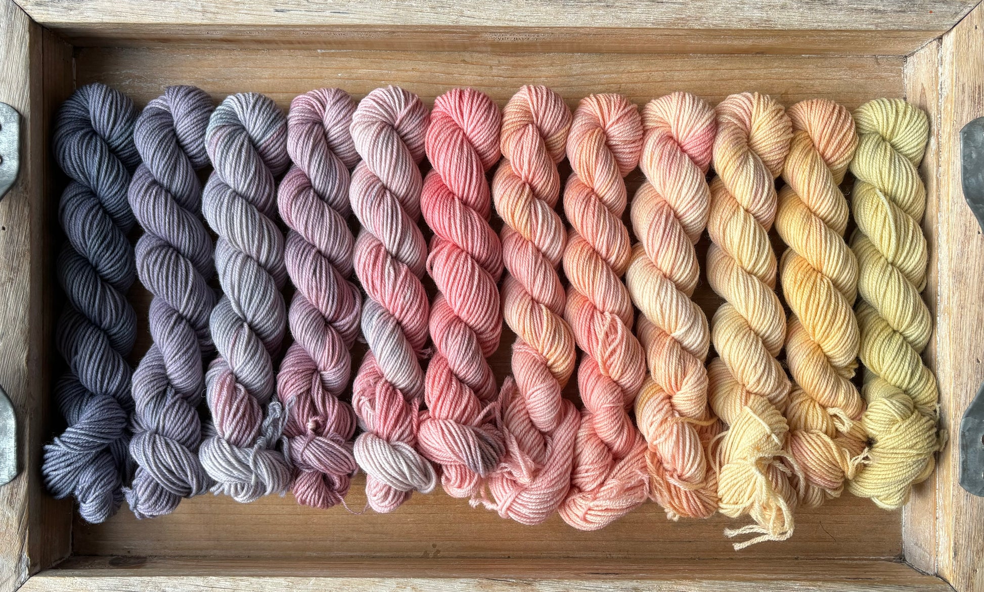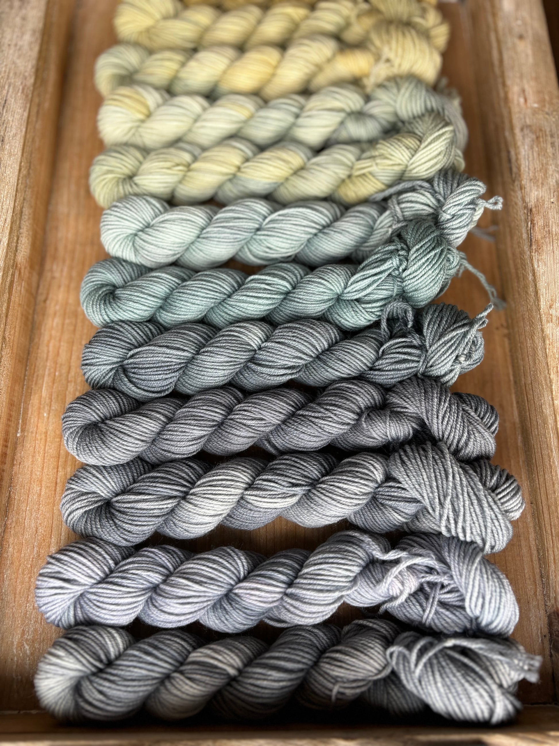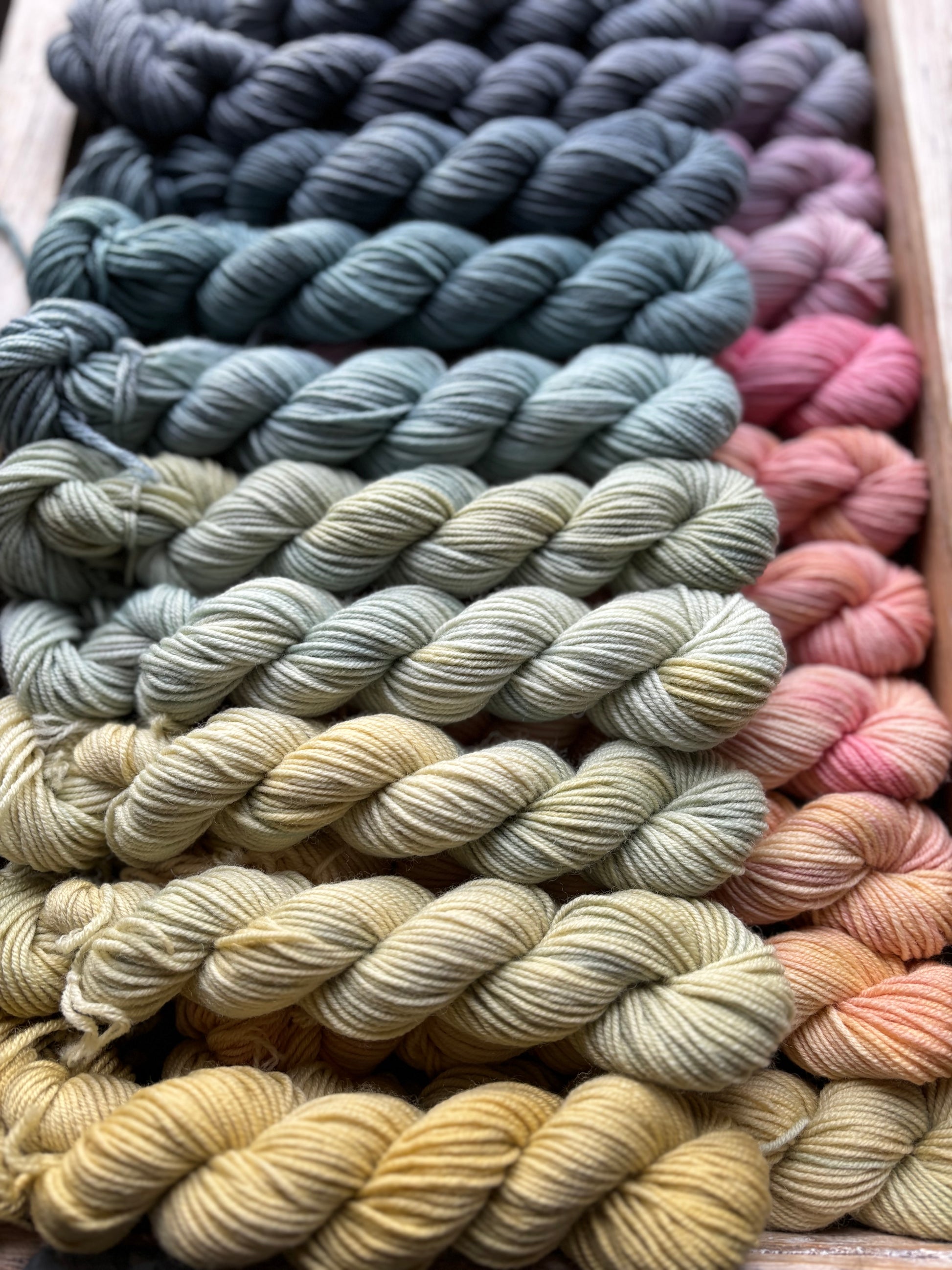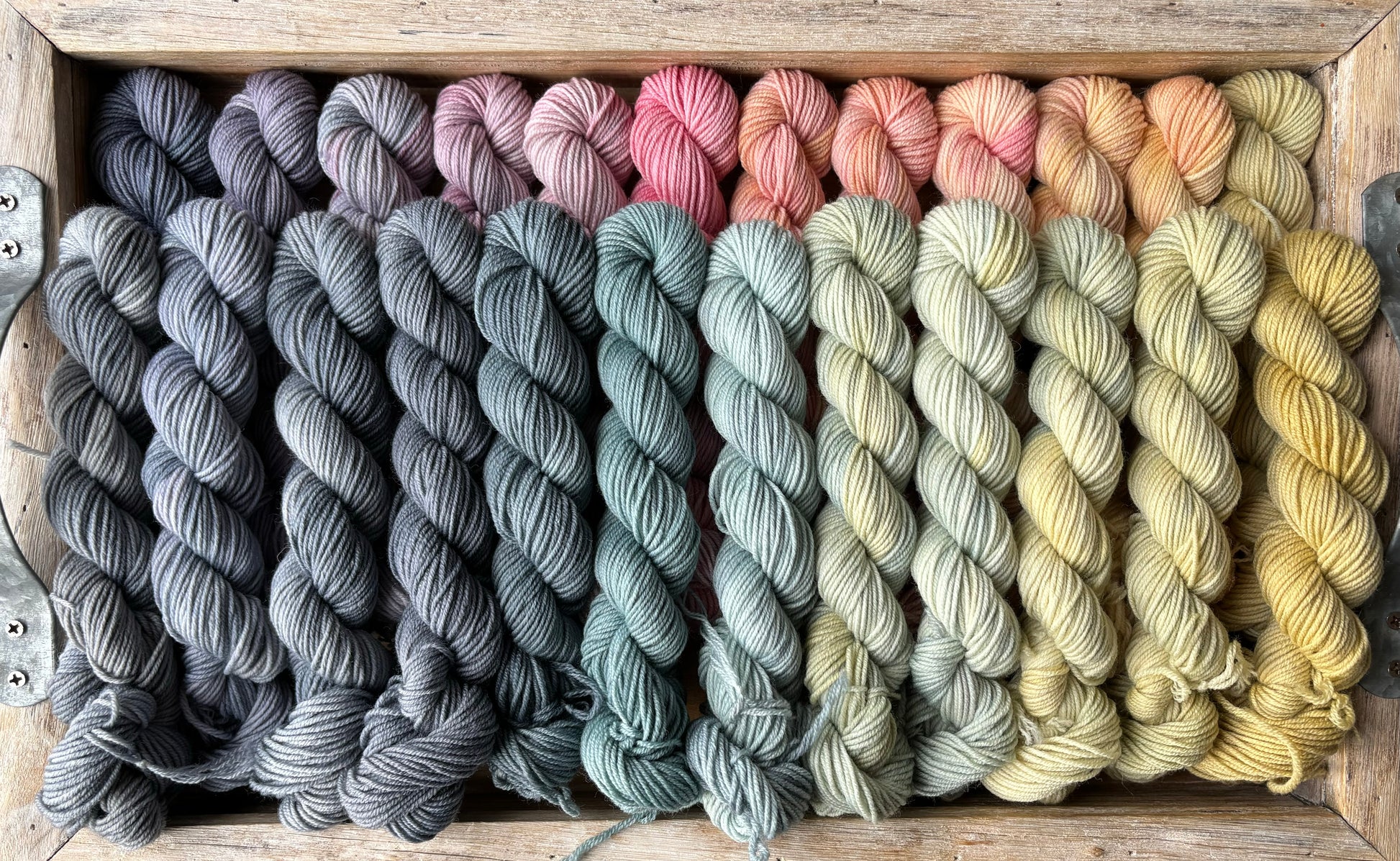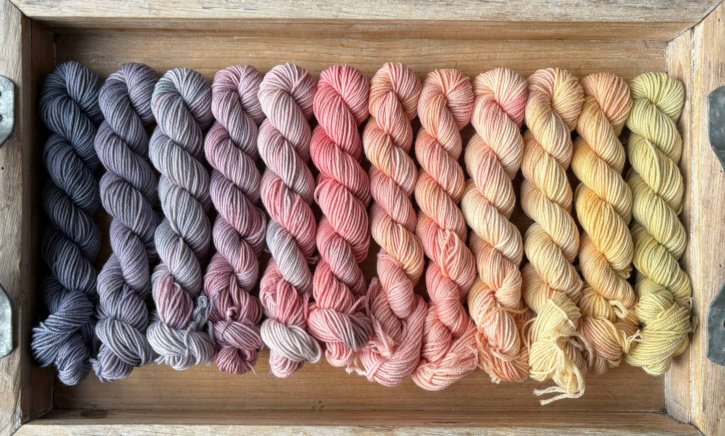 Each set comes with 24 mini skeins, each skein is 87 yards for a total of 2088 yards per set. The beauty of this colour palette is that it’s very flexible! You can line up these minis in so many different ways, depending on what you see best for your next project!