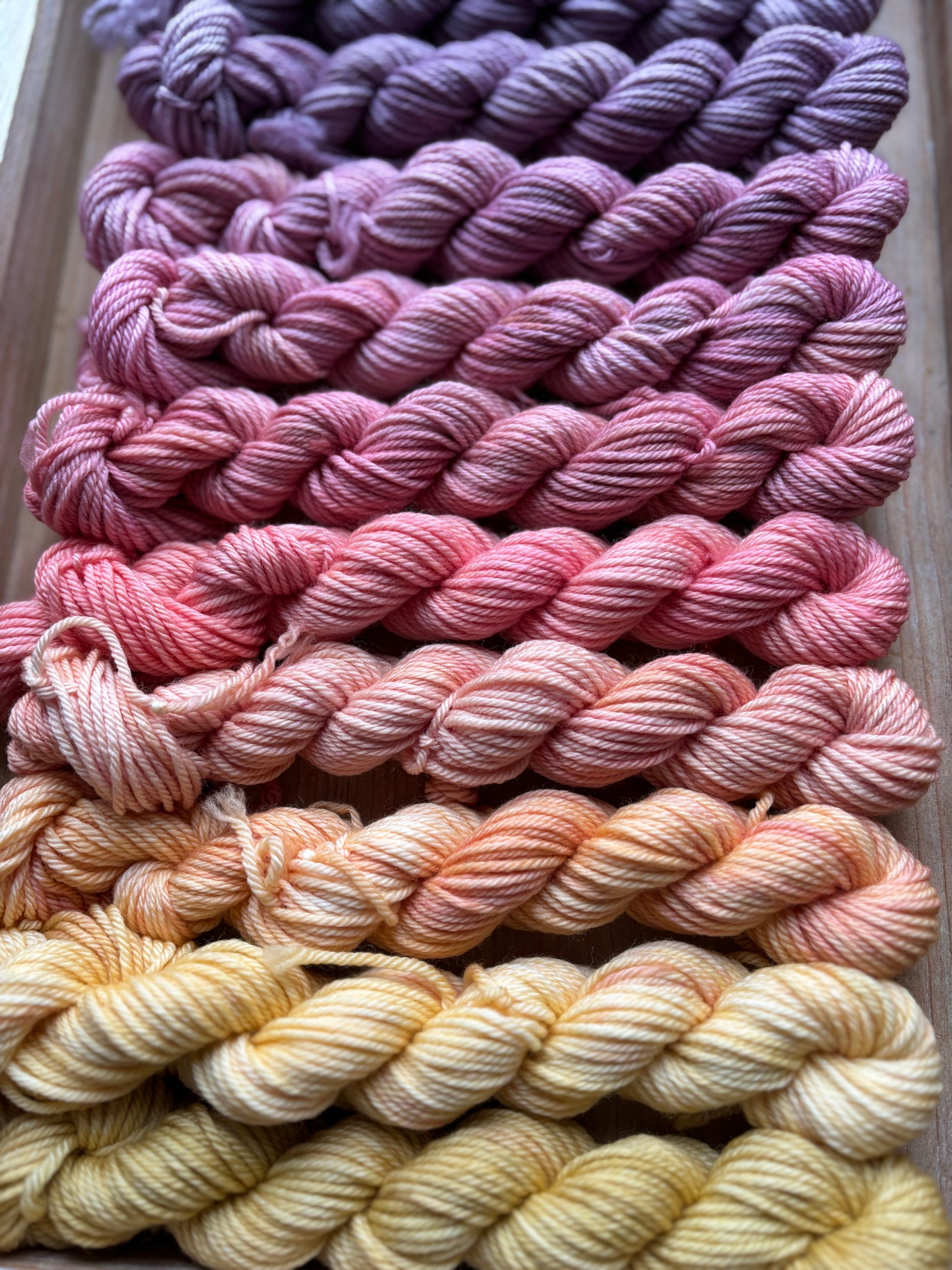This yarn fade in mini form is dyed up onto my Hidden DK Base. Each mini skein is 20 grams and 49 yards, for a total of 1,176 yards per set.