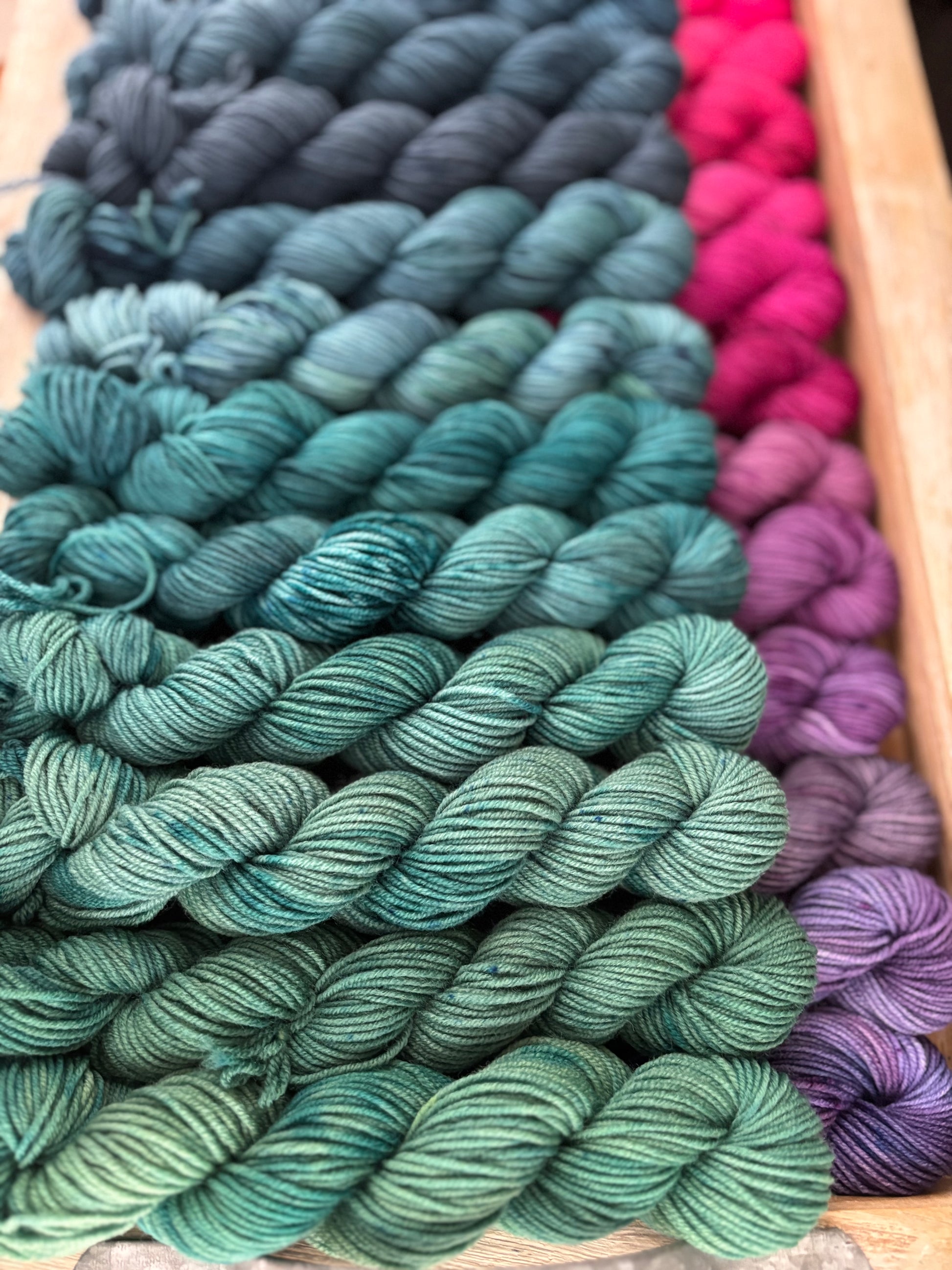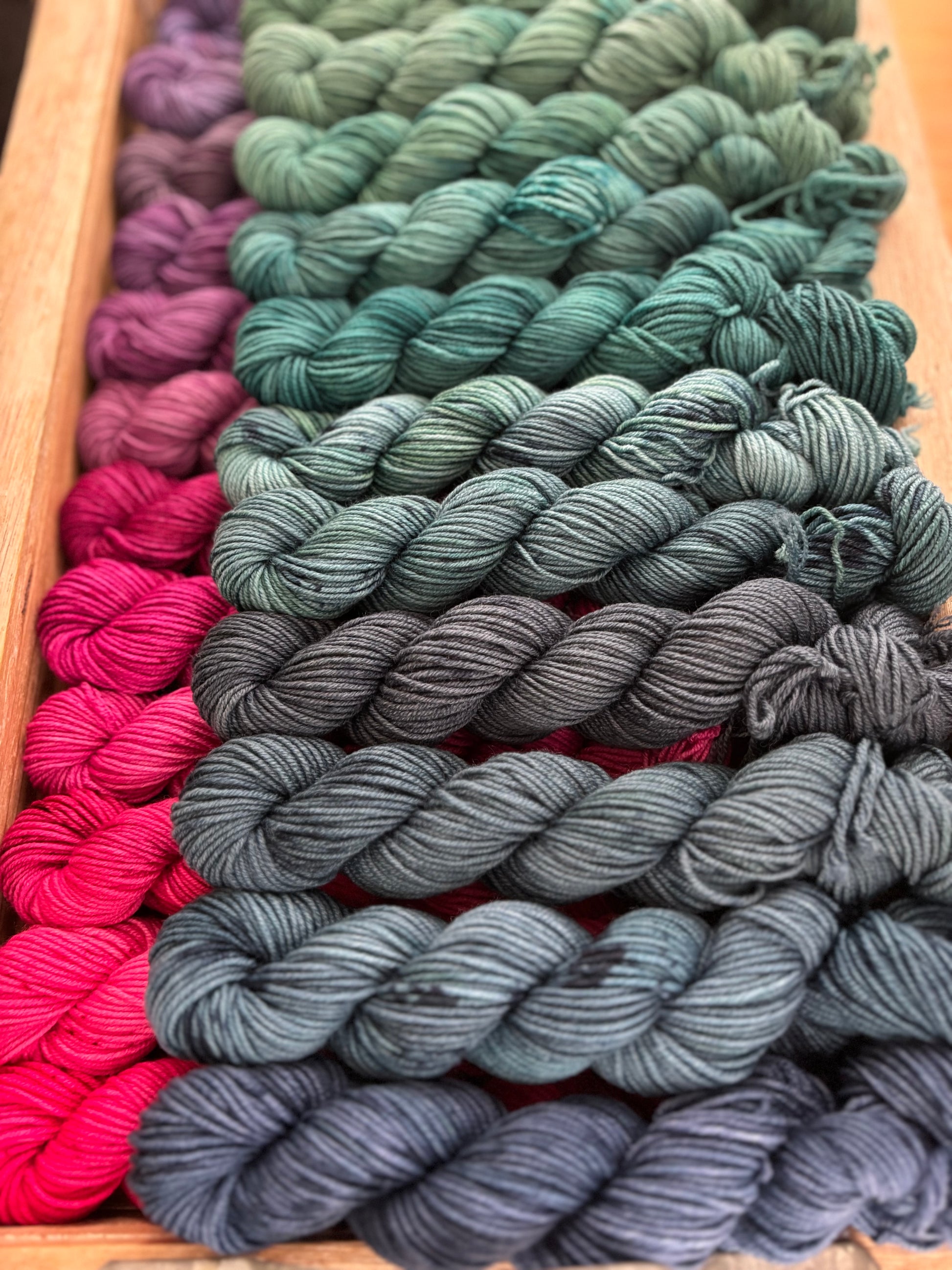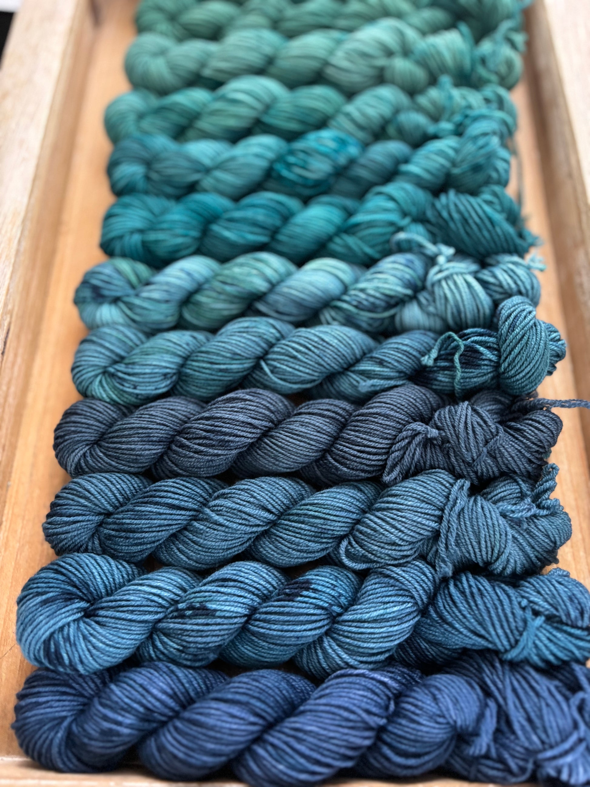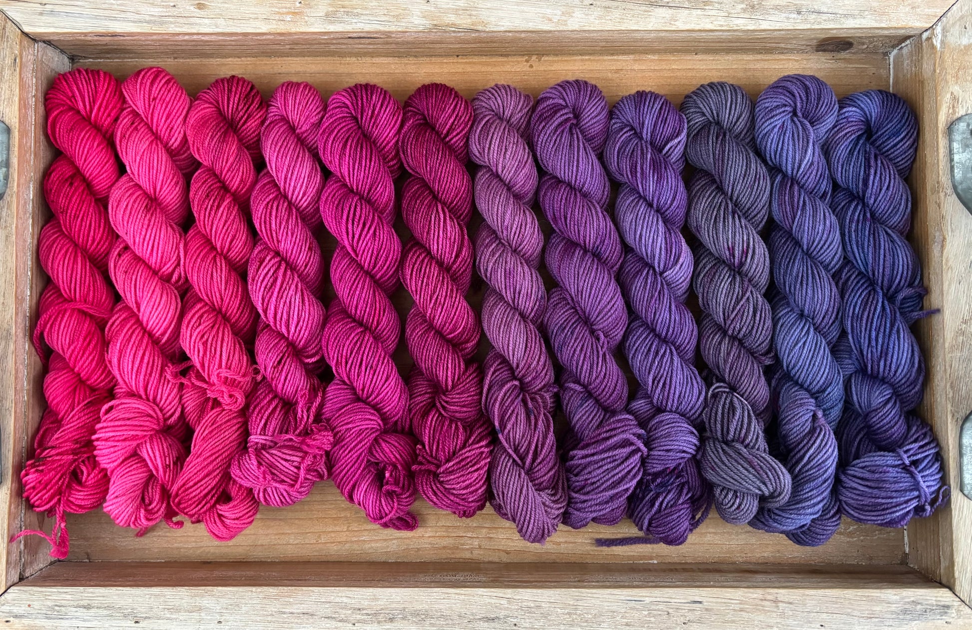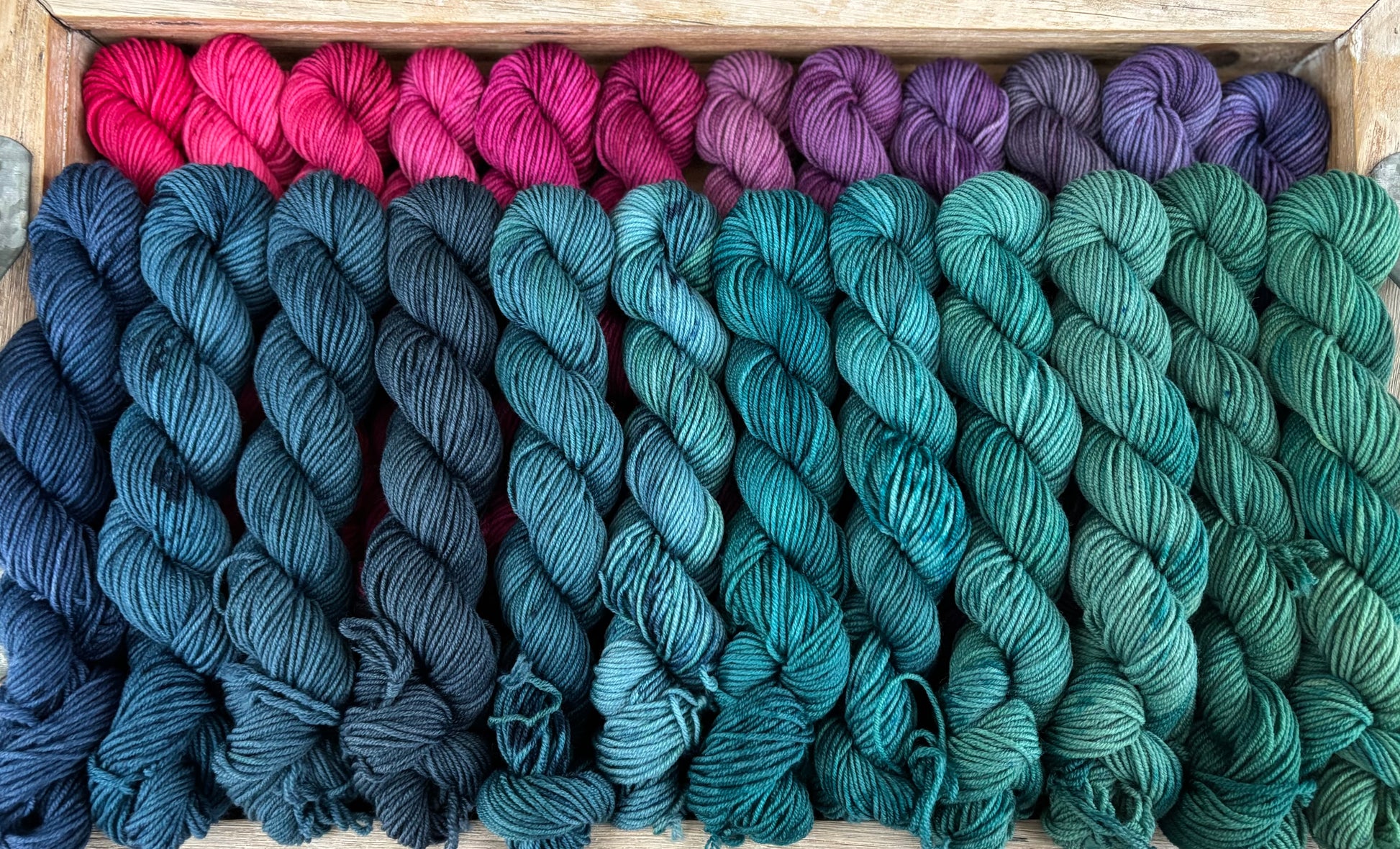 Each set comes with 24 mini skeins, each skein is 87 yards for a total of 2088 yards per set. The beauty of this colour palette is that it’s very flexible! You can line up these minis in so many different ways, depending on what you see best for your next project!