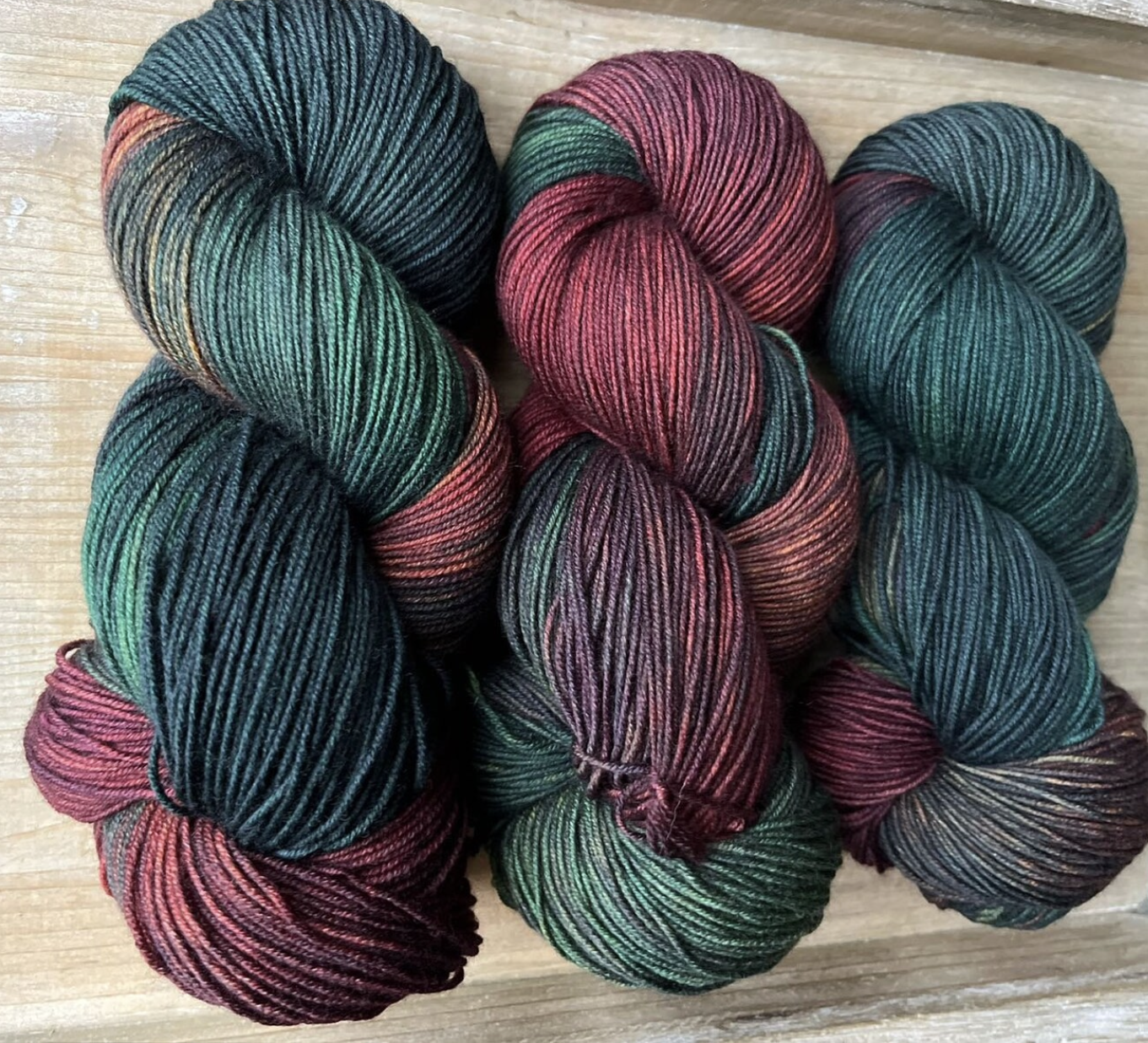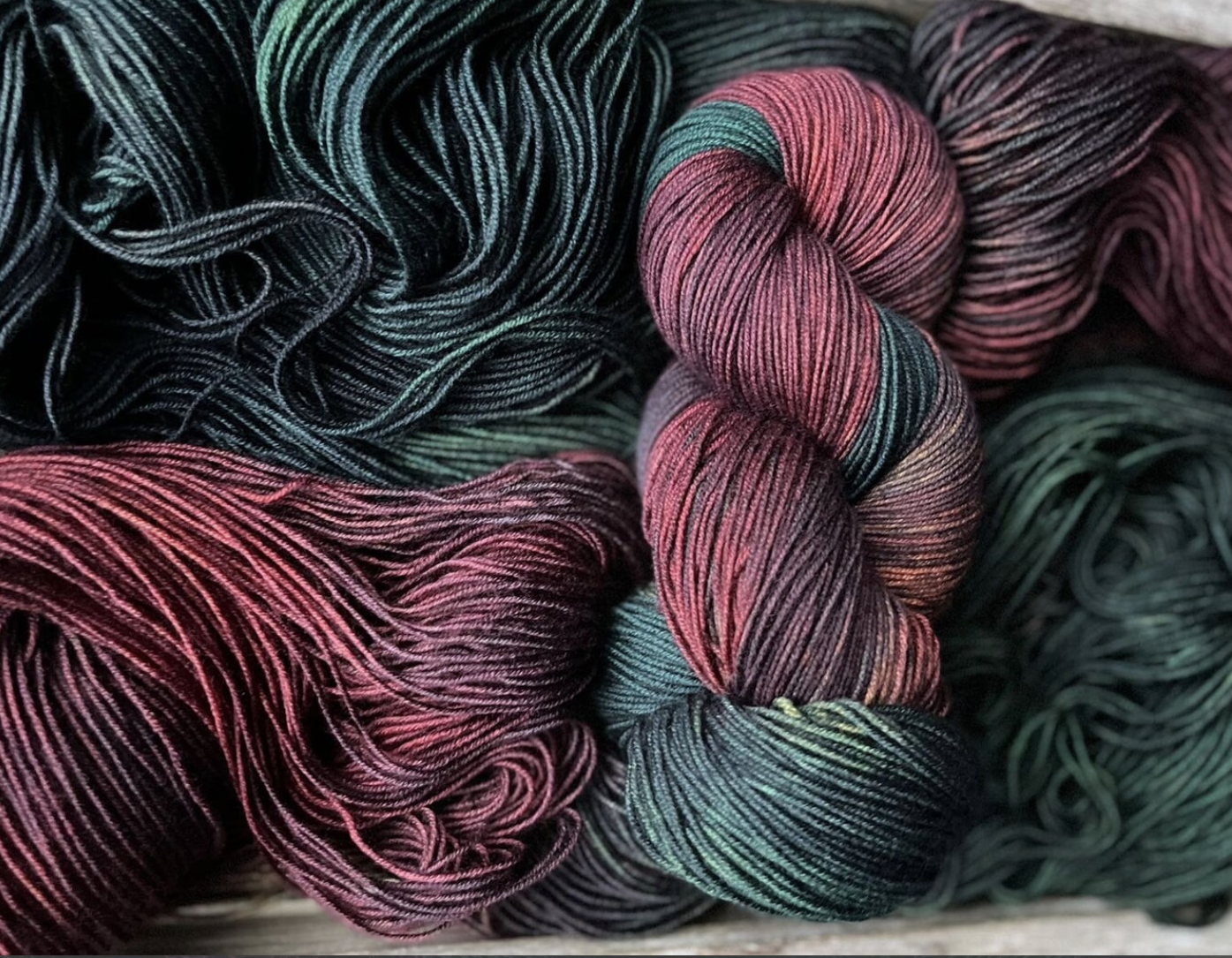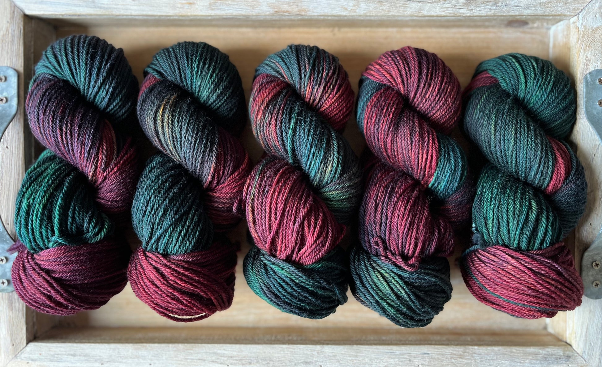 A Very Canadian Christmas is a magical swirling blend of all of our favourite holiday colours. Rich burnt reds and mauves, deep forest greens, and hints of warm gold within, this yarn will speak to any lover of Christmas time.