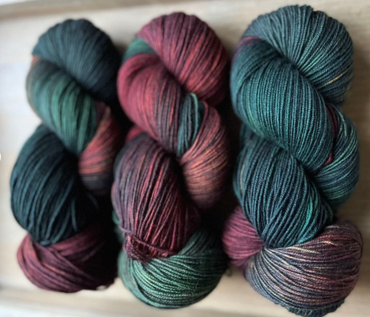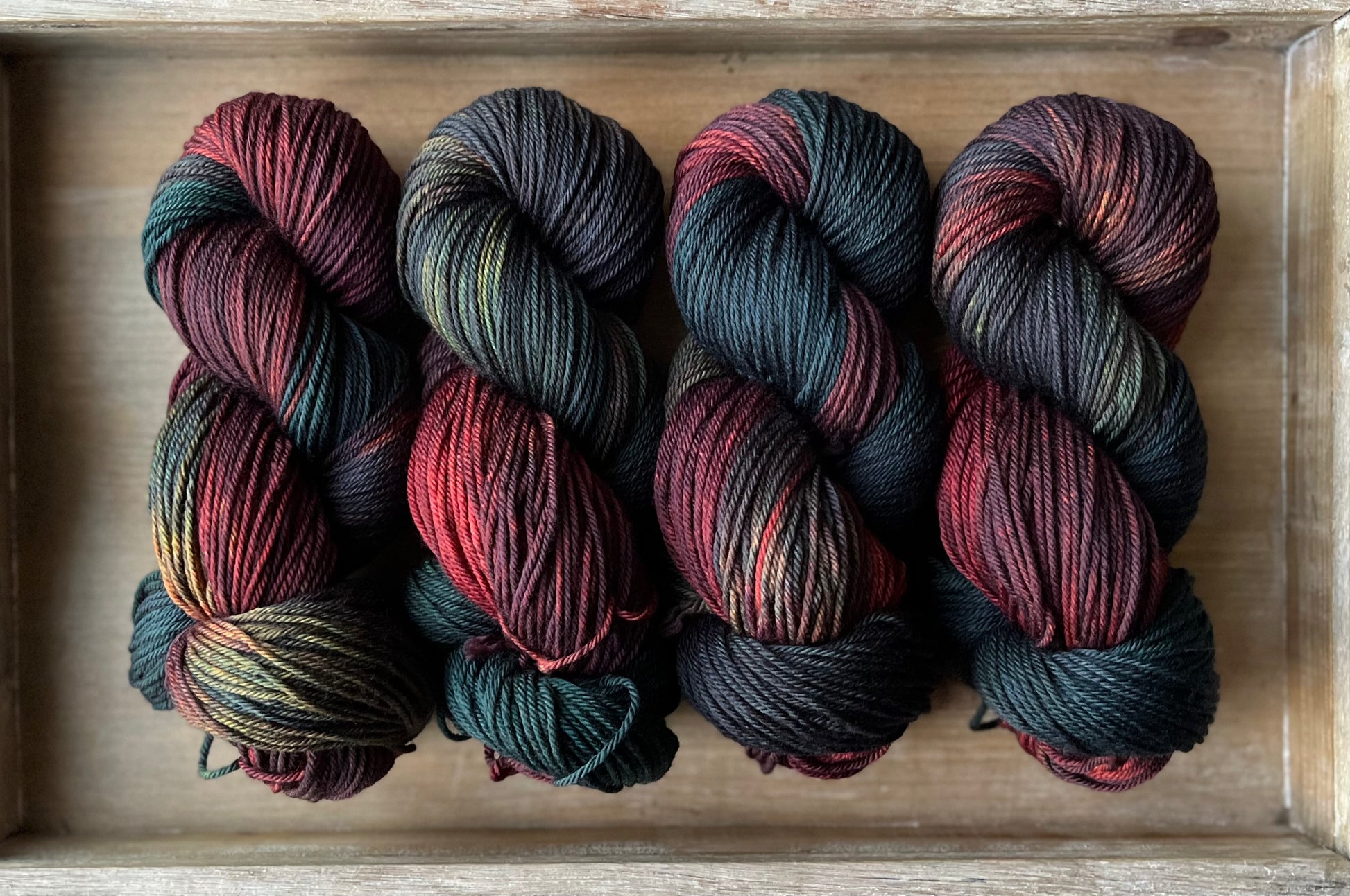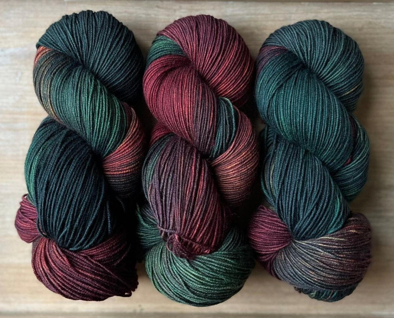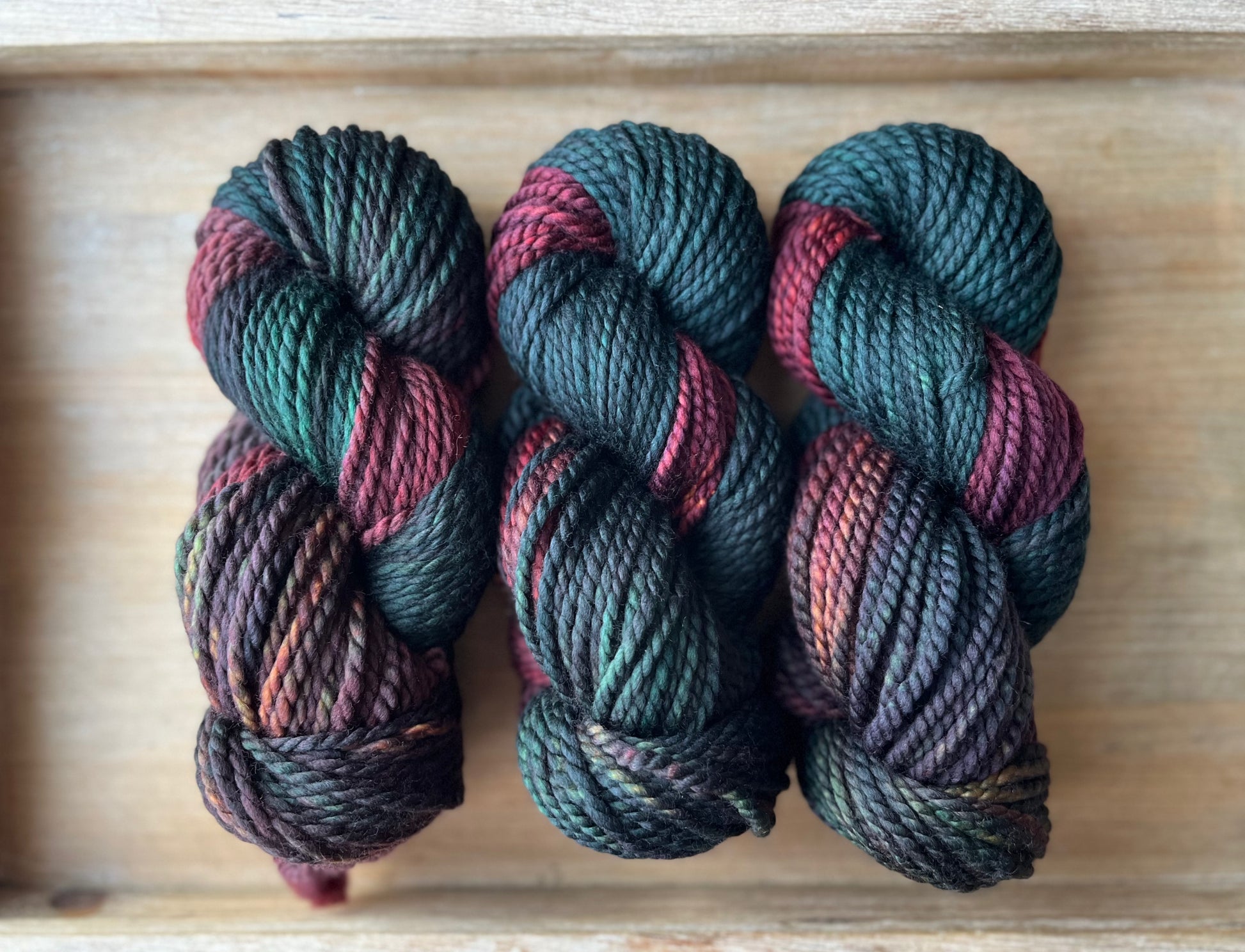 A Very Canadian Christmas is a magical swirling blend of all of our favourite holiday colours. Rich burnt reds and mauves, deep forest greens, and hints of warm gold within, this yarn will speak to any lover of Christmas time.