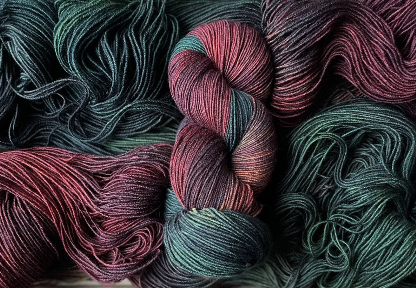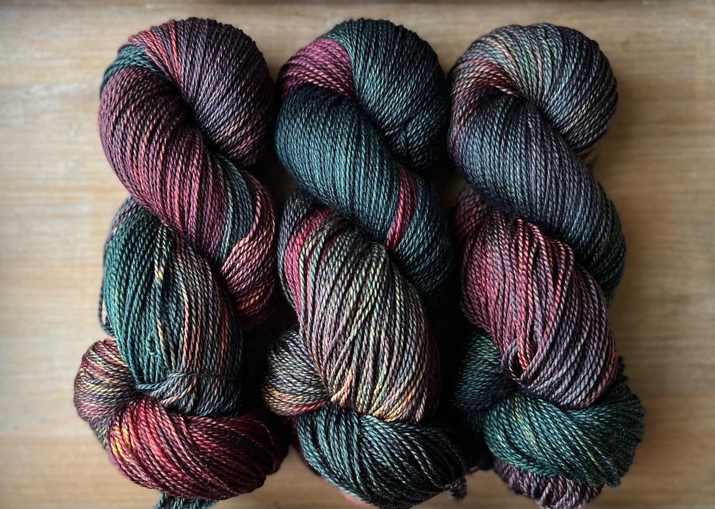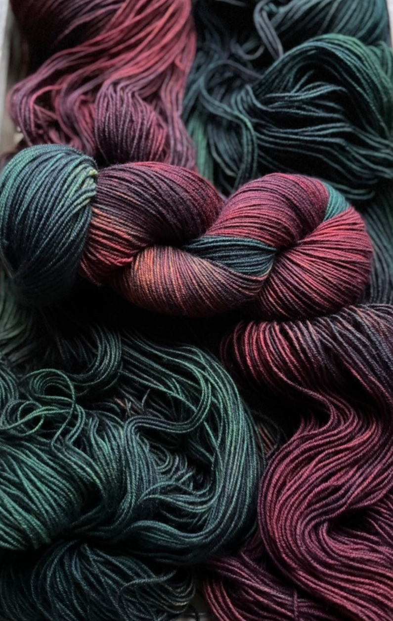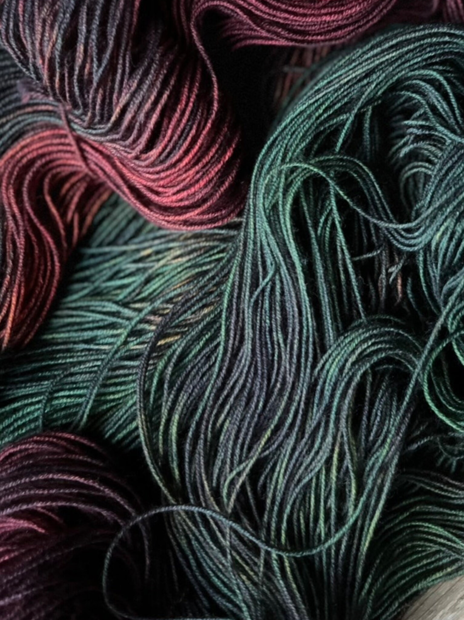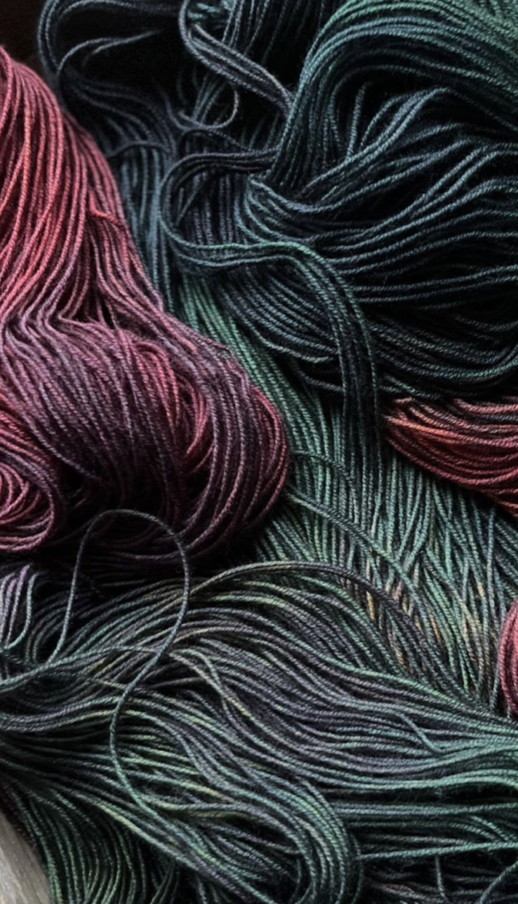 Luxe Sock Base: Luxe Sock is made up of 75% Ultra Fine Merino Wool, 15% Mulberry Silk, and 10% Cashmere. Each skien is 100 grams and 437 yards, 2ply construction. This yarn base is heavenly soft against the skin, and perfect for a special project calling for a high end fingering weight yarn. The Mulberry Silk adds drape and lustre, and the cashmere creates a fuzzy halo effect as you work with it. The colours of dye tend to shine through, looking much more striking and rich compared to some of my samples on Superwash bases. Fibres in this base are sourced from Australia, the wool used in this yarn is ethically produced from sheep that have NOT been mulesed. Hand wash only, lay flat to dry.