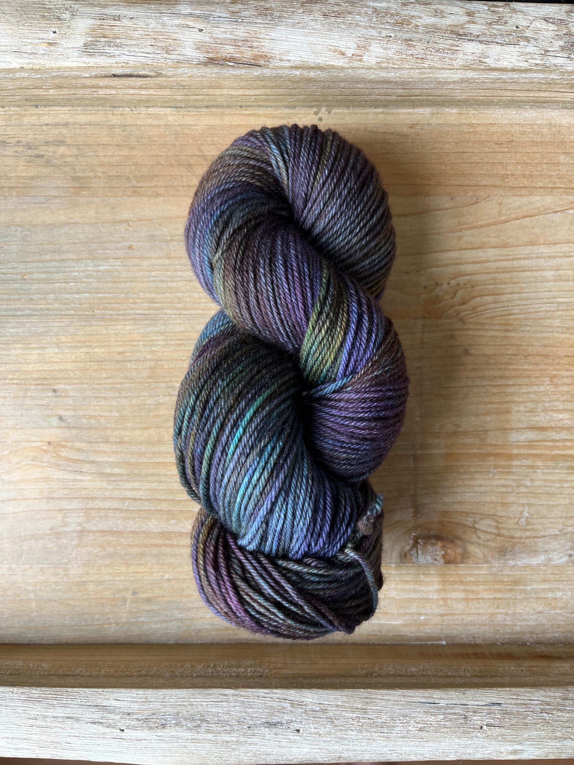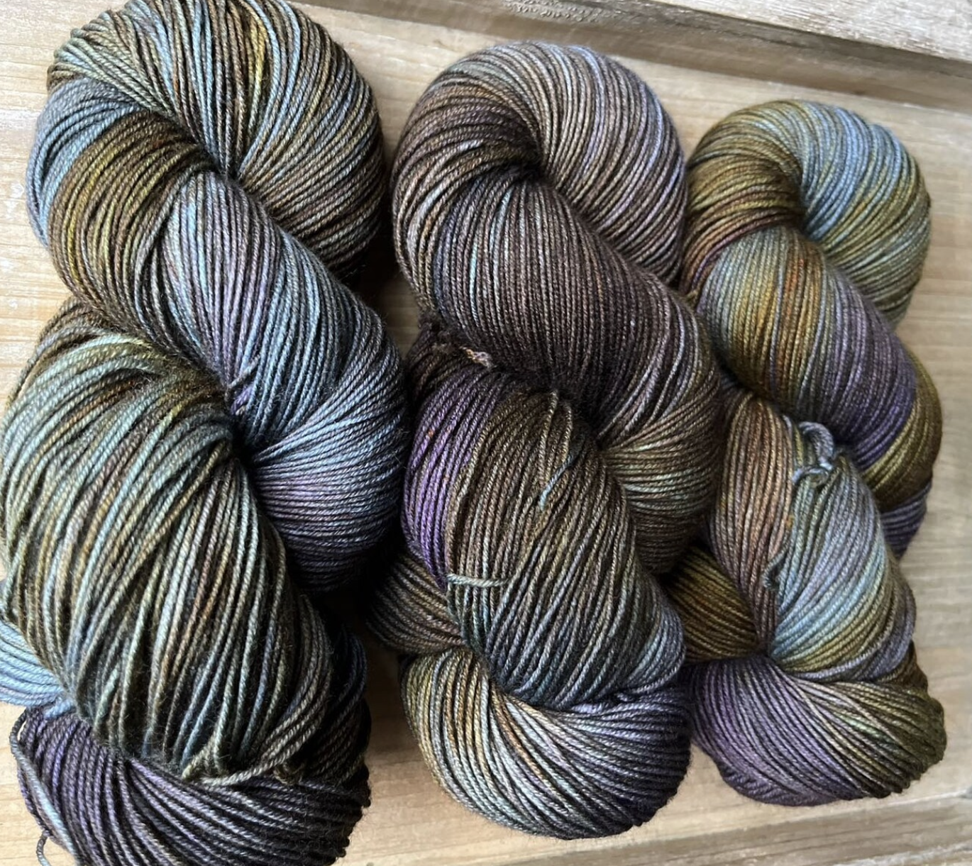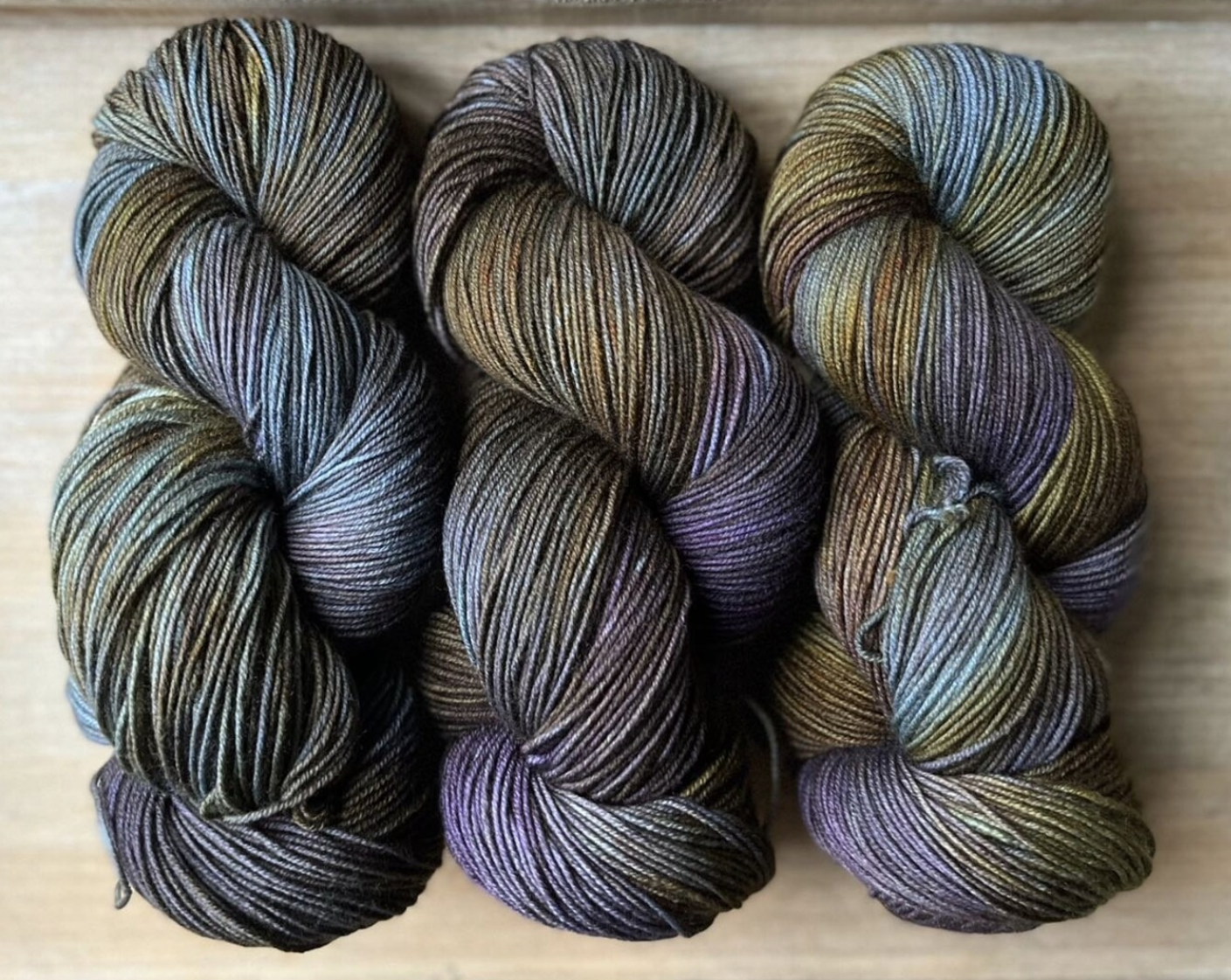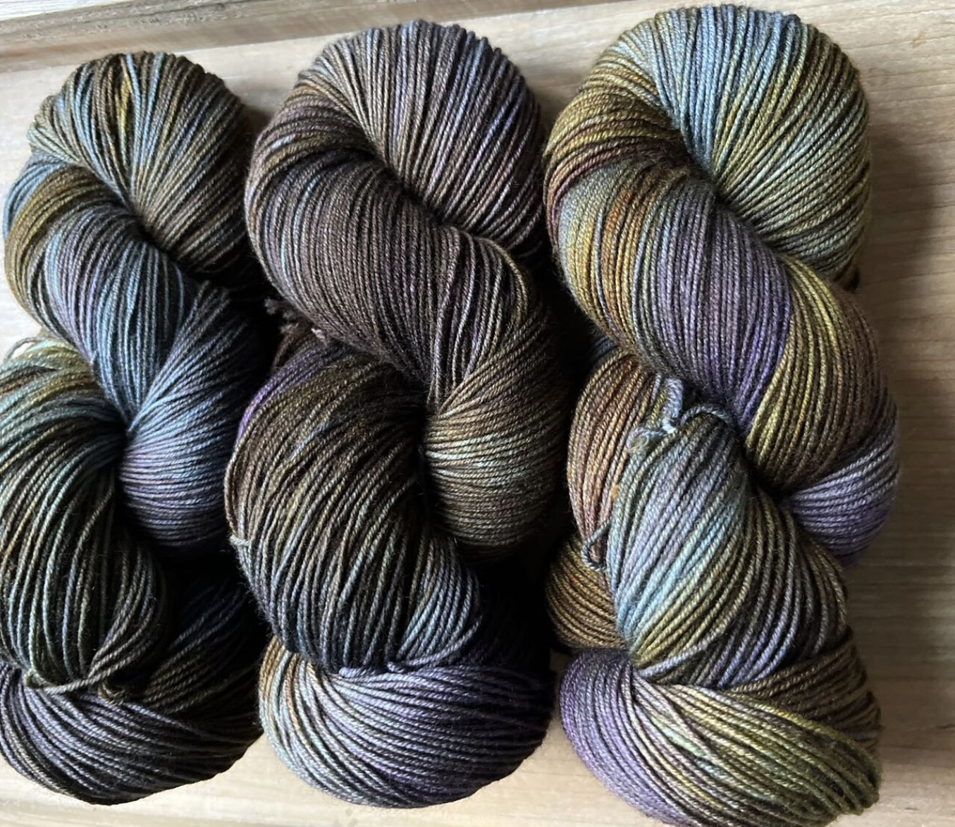 Atlantis is a gorgeous, unexpectedly mysterious colourway. Very similar to Map of the World, with a few key difference. You will find more gold and green hues within Atlantis. Each skein in the photos was dyed in the same pan, at the same time, and yet turned out fabulously unique. Murky blues, brilliant violets, hints of rusty greens and gritty bronze. There's a little bit of everything within this colourway!