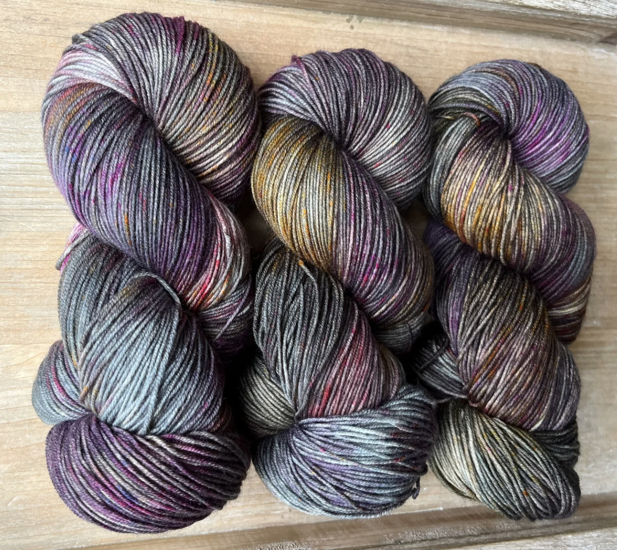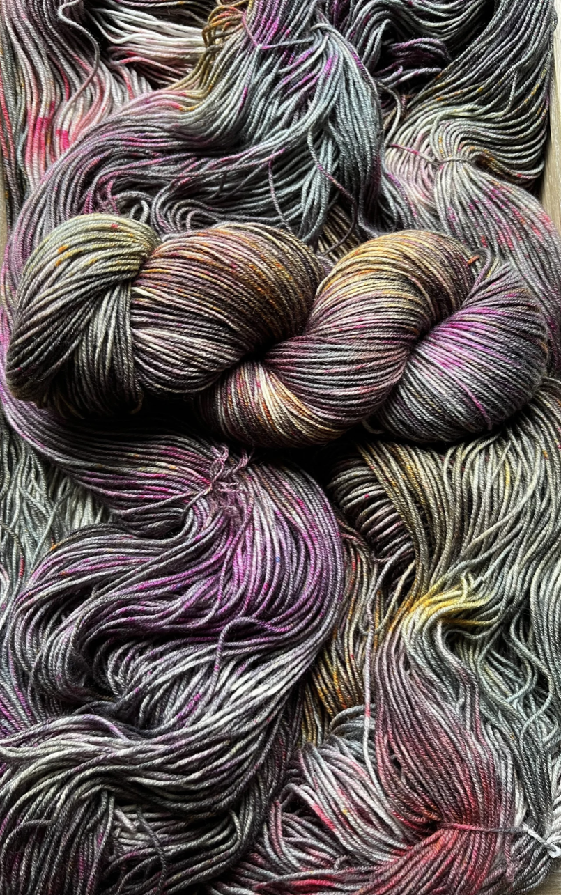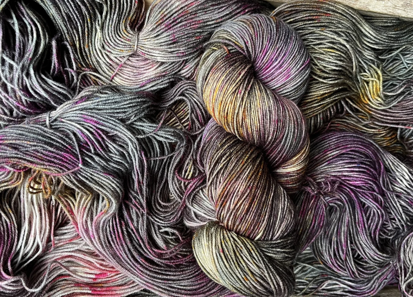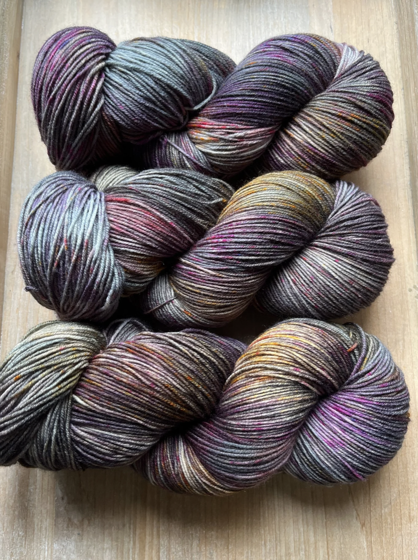 Baby Please Don’t Go is an exciting variegated yarn, with greys, blues, fuschias, scarlets, golds and swirling together to create hues of other colours throughout. Photographing these colourways was challenging, because it's difficult to capture how truly special each skein is. Even when dyed in the same batch, in the same pan, each skein is truly one of a kind. And once twisted into a skein, we loose a lot of visibility of the swirling blends of colours and speckles. Once you unwrap the yarn, all the beauty is released and you can really see how special these colourways are.
