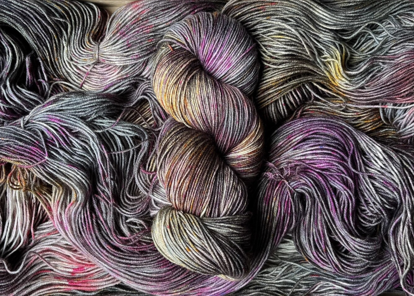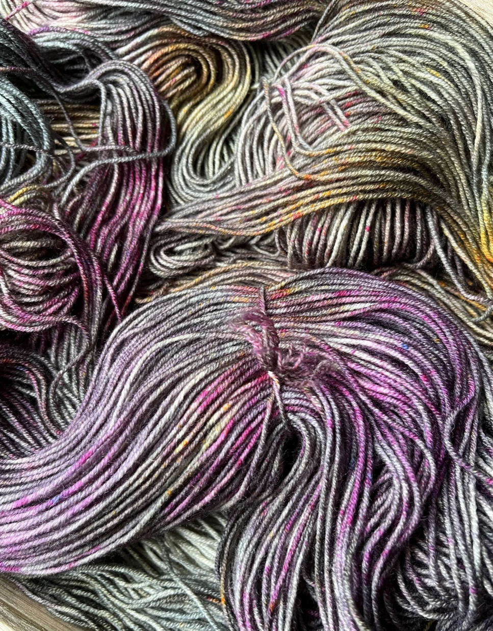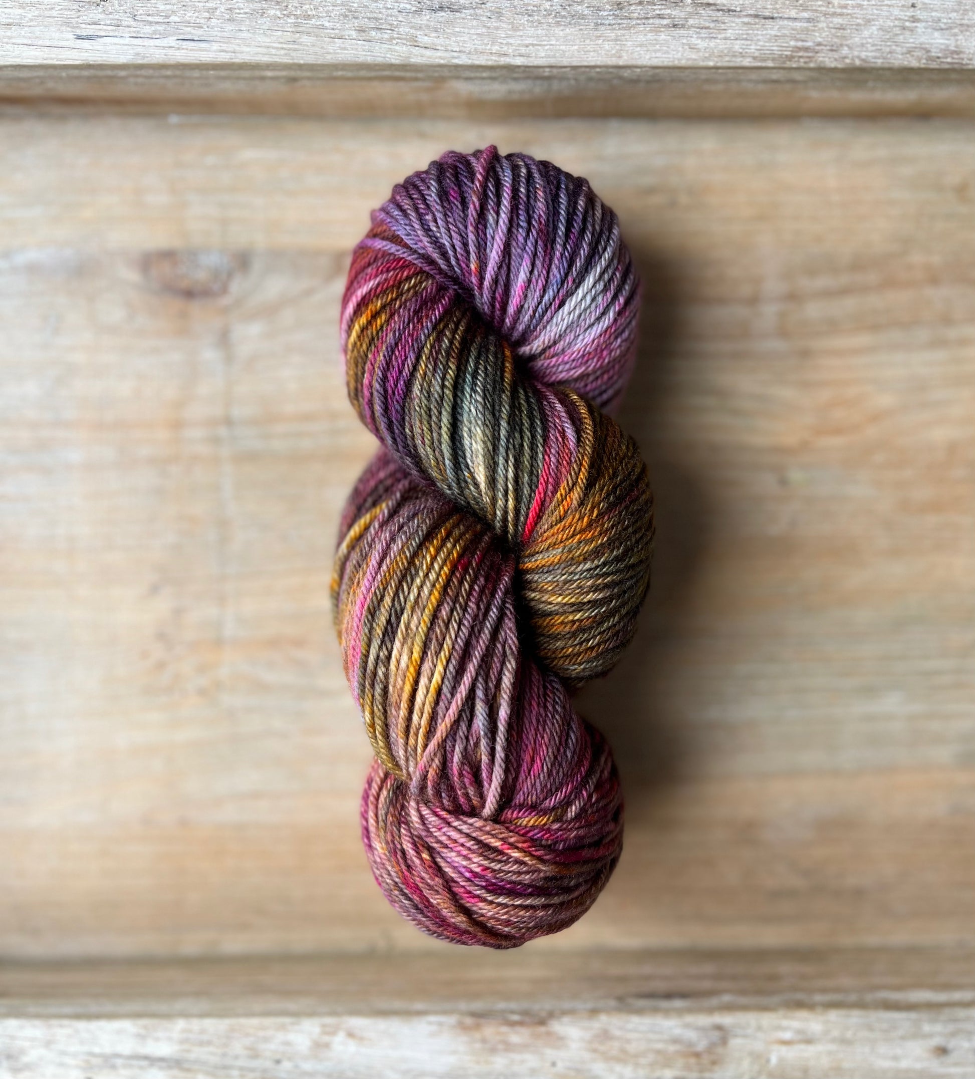 Baby Please Don’t Go is an exciting variegated yarn, with greys, blues, fuschias, scarlets, golds and swirling together to create hues of other colours throughout. Photographing these colourways was challenging, because it's difficult to capture how truly special each skein is. Even when dyed in the same batch, in the same pan, each skein is truly one of a kind. And once twisted into a skein, we loose a lot of visibility of the swirling blends of colours and speckles. Once you unwrap the yarn, all the beauty is released and you can really see how special these colourways are.