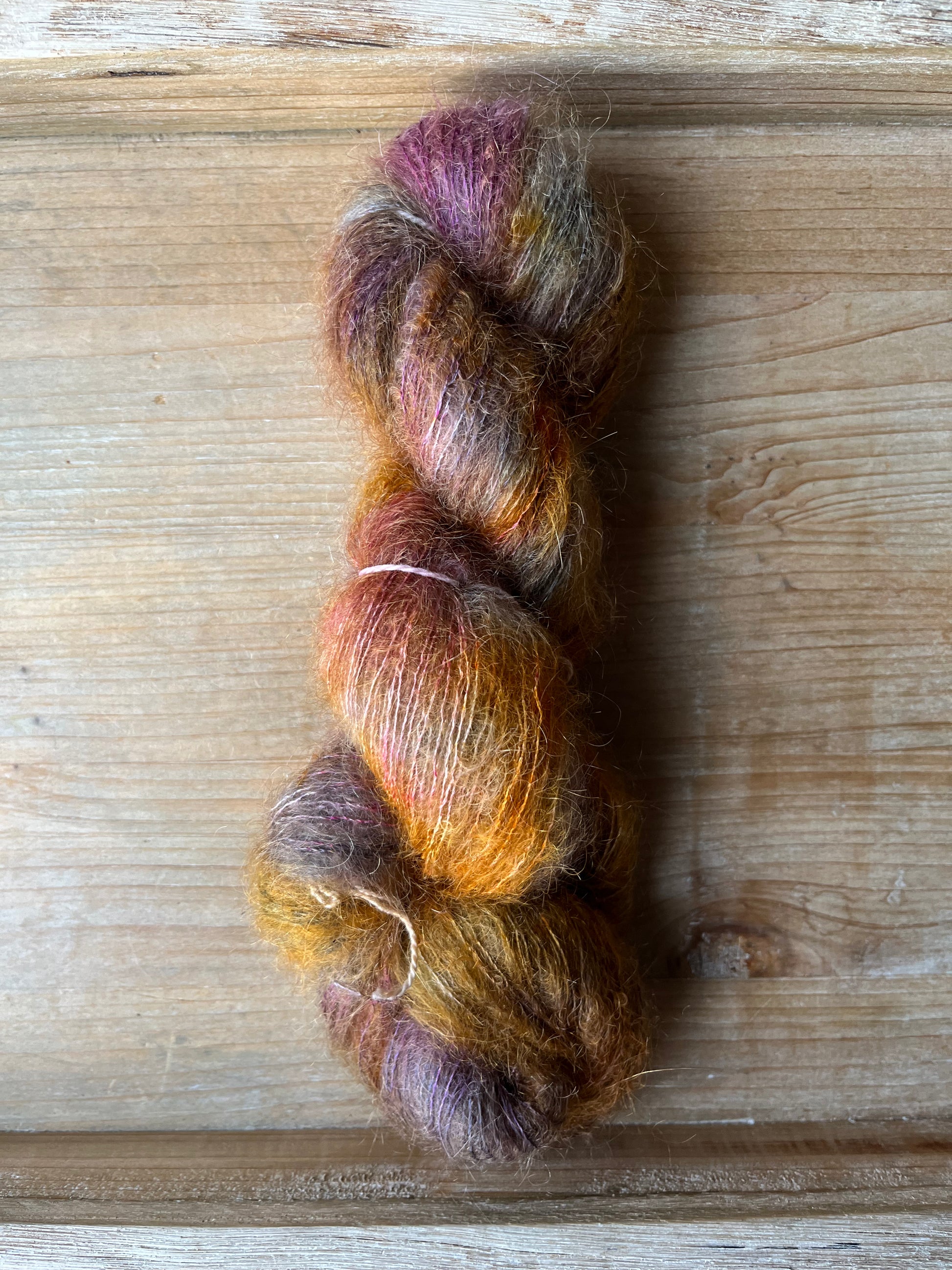 Mohair Halo Base: A delicate, lace weight yarn made up of 72% Superkid Mohair and 28% Mulberry Silk. Each skein is 50 grams and 460 yards, single ply construction. This yarn is lovely on it’s own, but is also amazing when held together with another yarn base. The fuzziness of the mohair creates a halo of colour within your project. Fibres in this base are sourced from South Africa. Hand wash only, lay flat to dry.