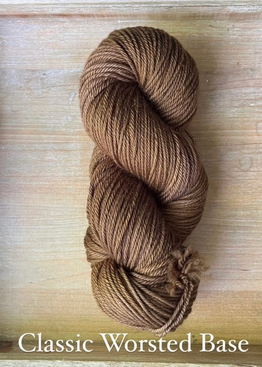 Classic Worsted Base: A soft and full Worsted Base yarn, made up of 100% Superwash Merino Wool. Each skein is 110 grams and 205 yards, with a 4 ply construction. It is plush, and versatile, with terrific stitch definition. And thanks to it’s superwash treatment, it is also machine washable on a delicate cycle. A great, practical choice for any project calling for a Worsted Weight base. Fibres in this base are sourced from Australia.