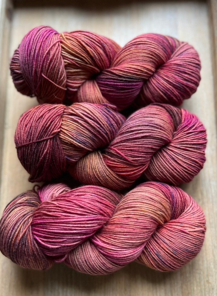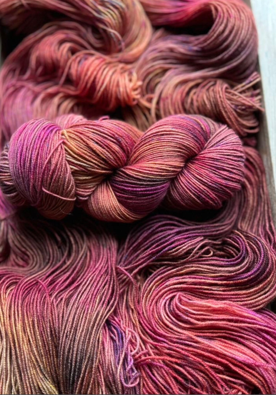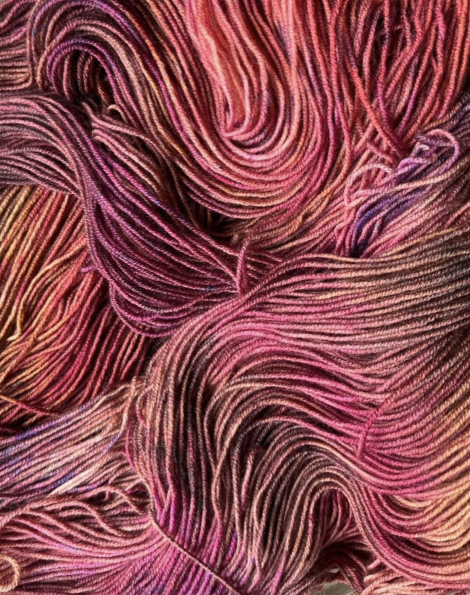 Luxe Sock Base: Luxe Sock is made up of 75% Ultra Fine Merino Wool, 15% Mulberry Silk, and 10% Cashmere. Each skien is 100 grams and 437 yards, 2ply construction. This yarn base is heavenly soft against the skin, and perfect for a special project calling for a high end fingering weight yarn. The Mulberry Silk adds drape and lustre, and the cashmere creates a fuzzy halo effect as you work with it. The colours of dye tend to shine through, looking much more striking and rich compared to some of my samples on Superwash bases. Fibres in this base are sourced from Australia, the wool used in this yarn is ethically produced from sheep that have NOT been mulesed. Hand wash only, lay flat to dry.