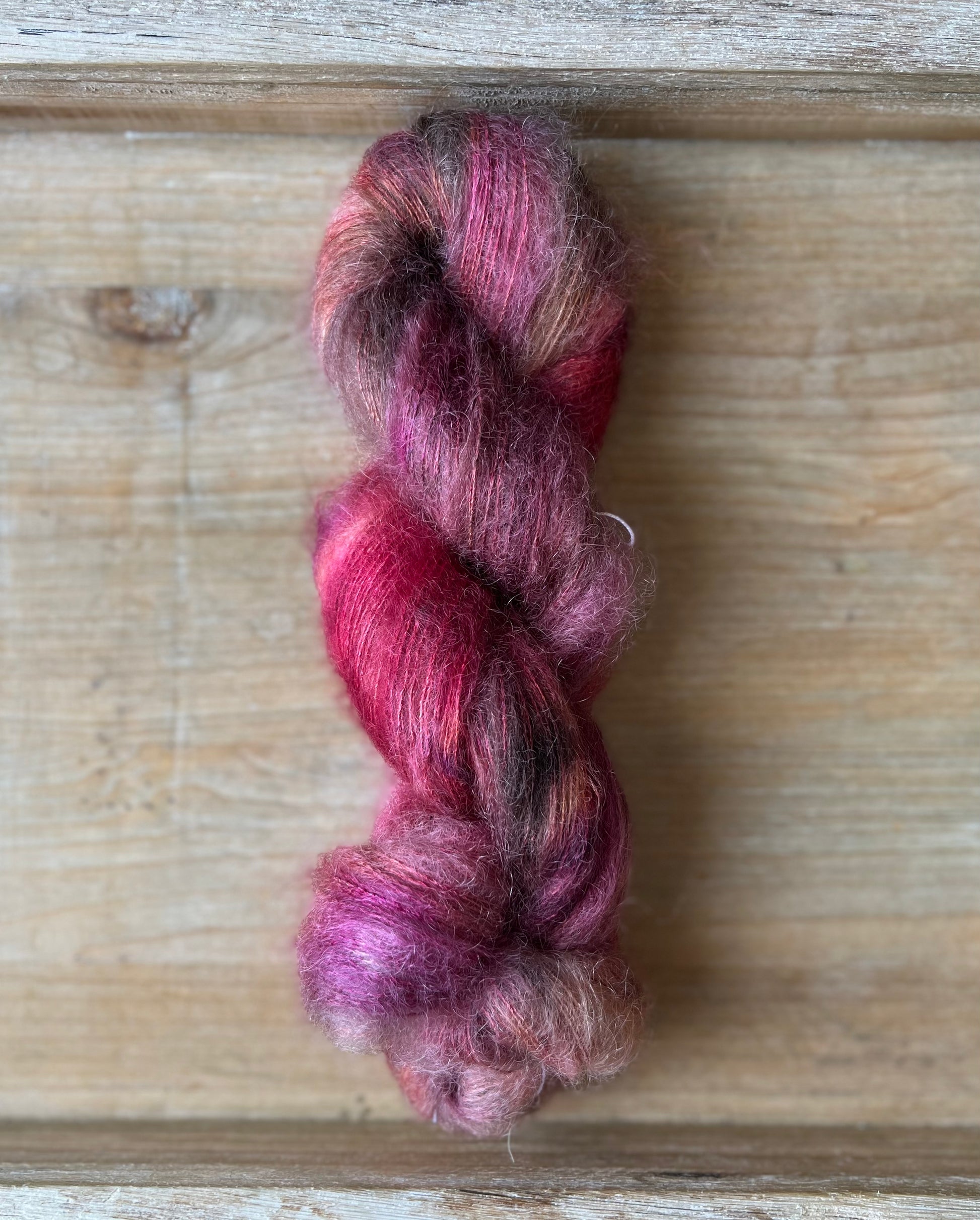 Yes, Suri! Lace Base: Take your project to the next level of luxury with this gorgeous lace weight yarn base! Made up of 75% Brushed Baby Suri Alpaca, and 25% Mulberry Silk, each 50 gram skein comes with 328 yards of fluffy magic. This base can be somewhat of a wild card when it comes to dye recipe consistency, as is often the case with Alpaca blends, so please do not hesitate to reach out to me as I’m always happy to send ‘preview photos’ before shipping, just to make sure we get it right! Yes, Suri! is significantly softer than Mohair Halo and is a great choice for anyone who wants something less itchy for next to skin wear. This base has a bit more drape and creates a less stiff fabric than Mohair Halo. Fibres in this yarn base are sourced from South America. Hand wash only, lay flat to dry, and colour bleeding is quite typical for the first few washes, so swatching to test for colour transfer is recommended