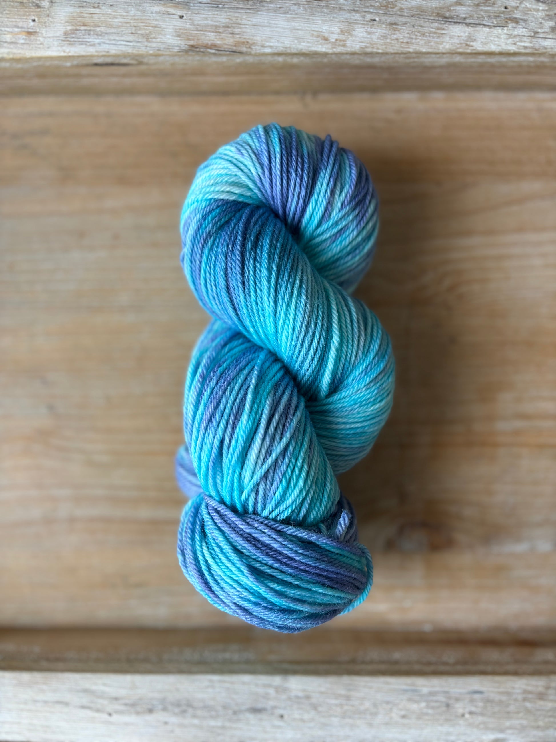 Blue Crush is a vibrant, bold mix of aquas and purples. A happy, fun colour just waiting for a spot in that yarn stash!