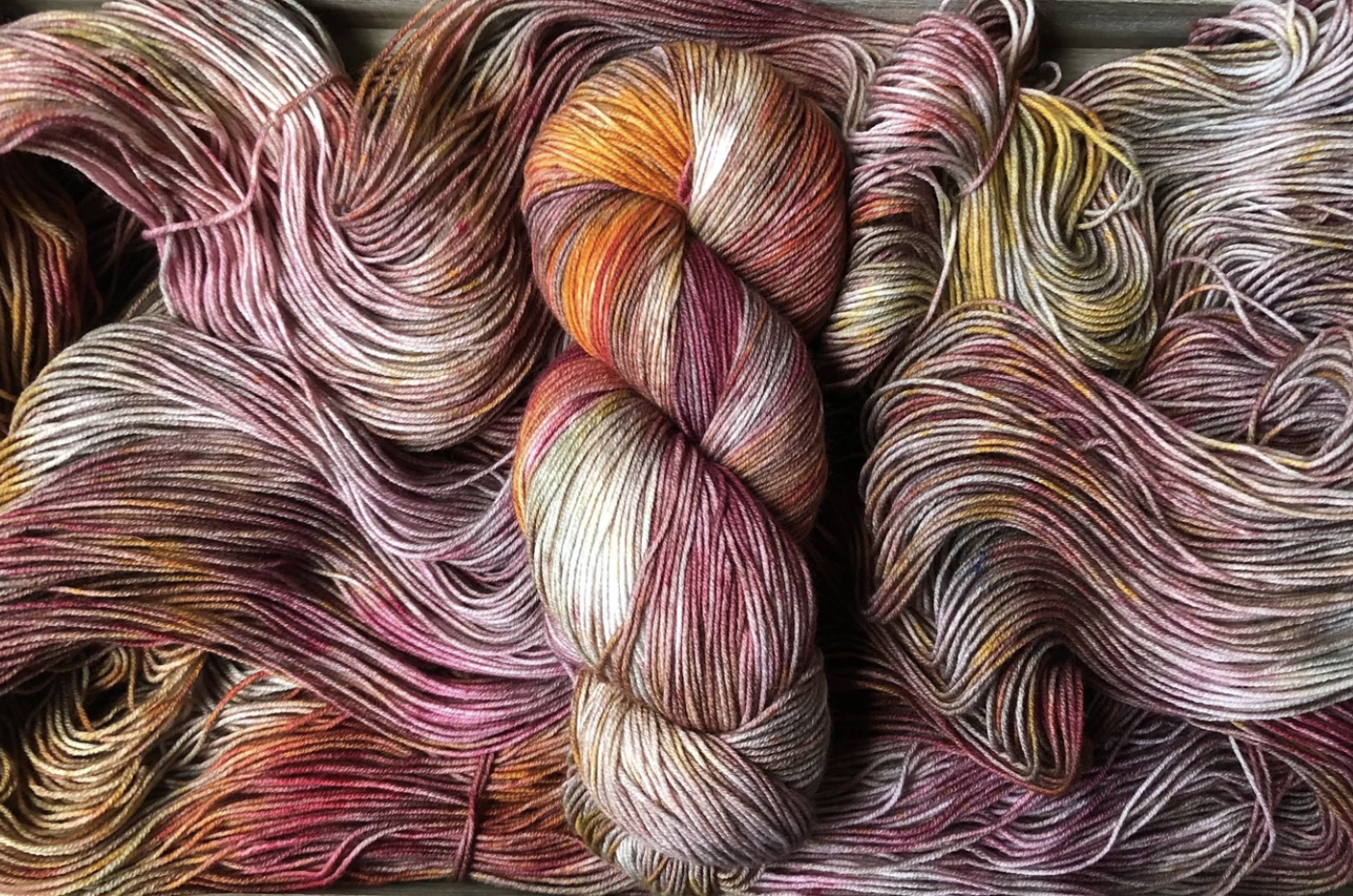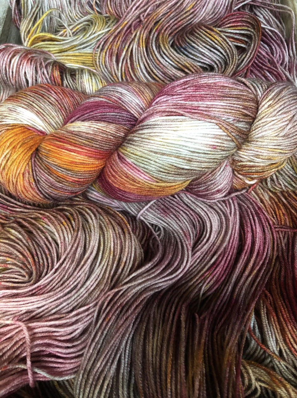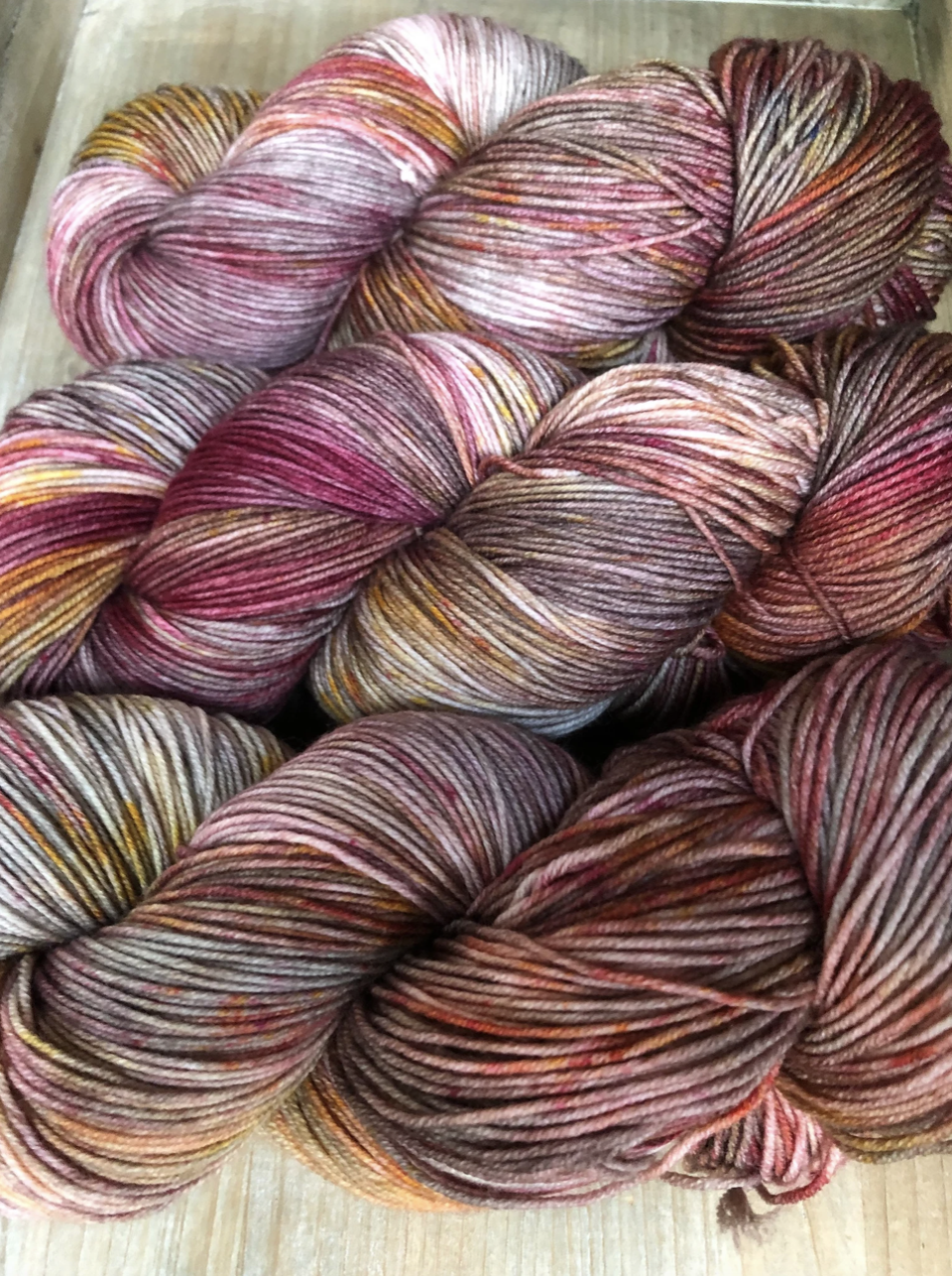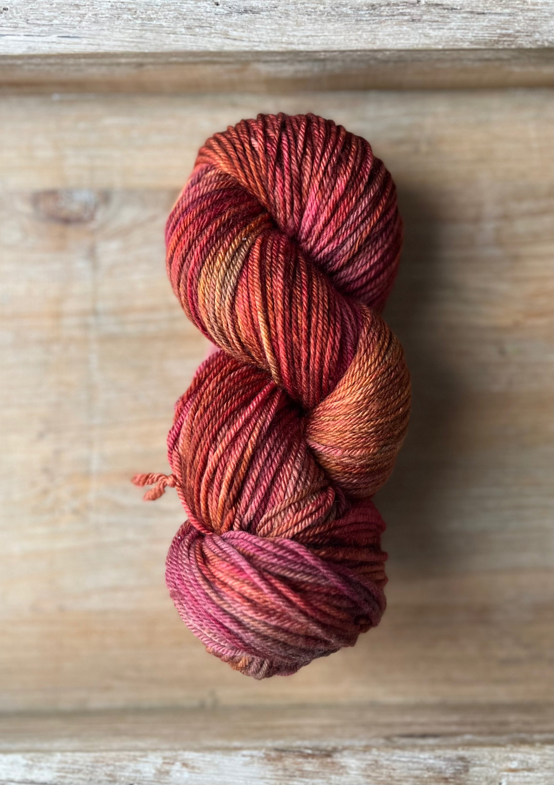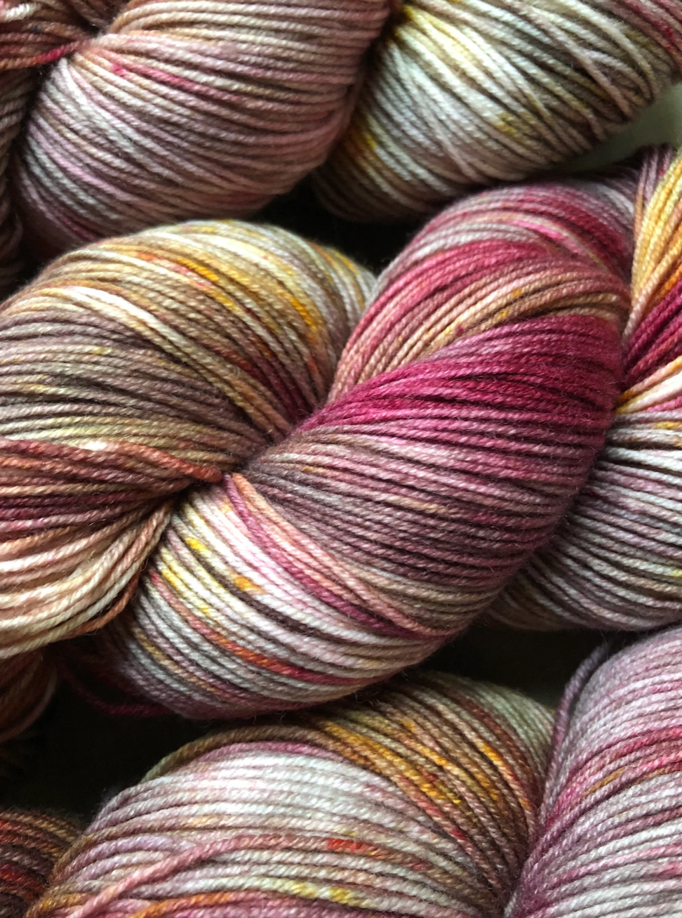 Brand New Day is a strikingly rich colourway from my Van Morrison Collection. Burnt raspberry red, rusty golds with medium caramel tones throughout. Photographing these colourways was challenging, because it's difficult to capture how truly special each skein is. Even when dyed in the same batch, in the same pan, each skein is truly one of a kind. And once twisted into a skein, we loose a lot of visibility of the swirling blends of colours and speckles. Once you unwrap the yarn, all the beauty is released and you can really see how special these colourways are. Alternating skeins in between rows is suggested when using any colourway like this one.