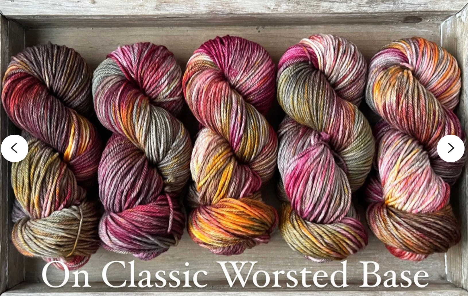 Classic Worsted Base: A soft and full Worsted Base yarn, made up of 100% Superwash Merino Wool. Each skein is 110 grams and 205 yards, with a 4 ply construction. It is plush, and versatile, and thanks to its superwash treatment, it is also machine washable on a delicate cycle. A great, practical choice for any project calling for a Worsted Weight base.