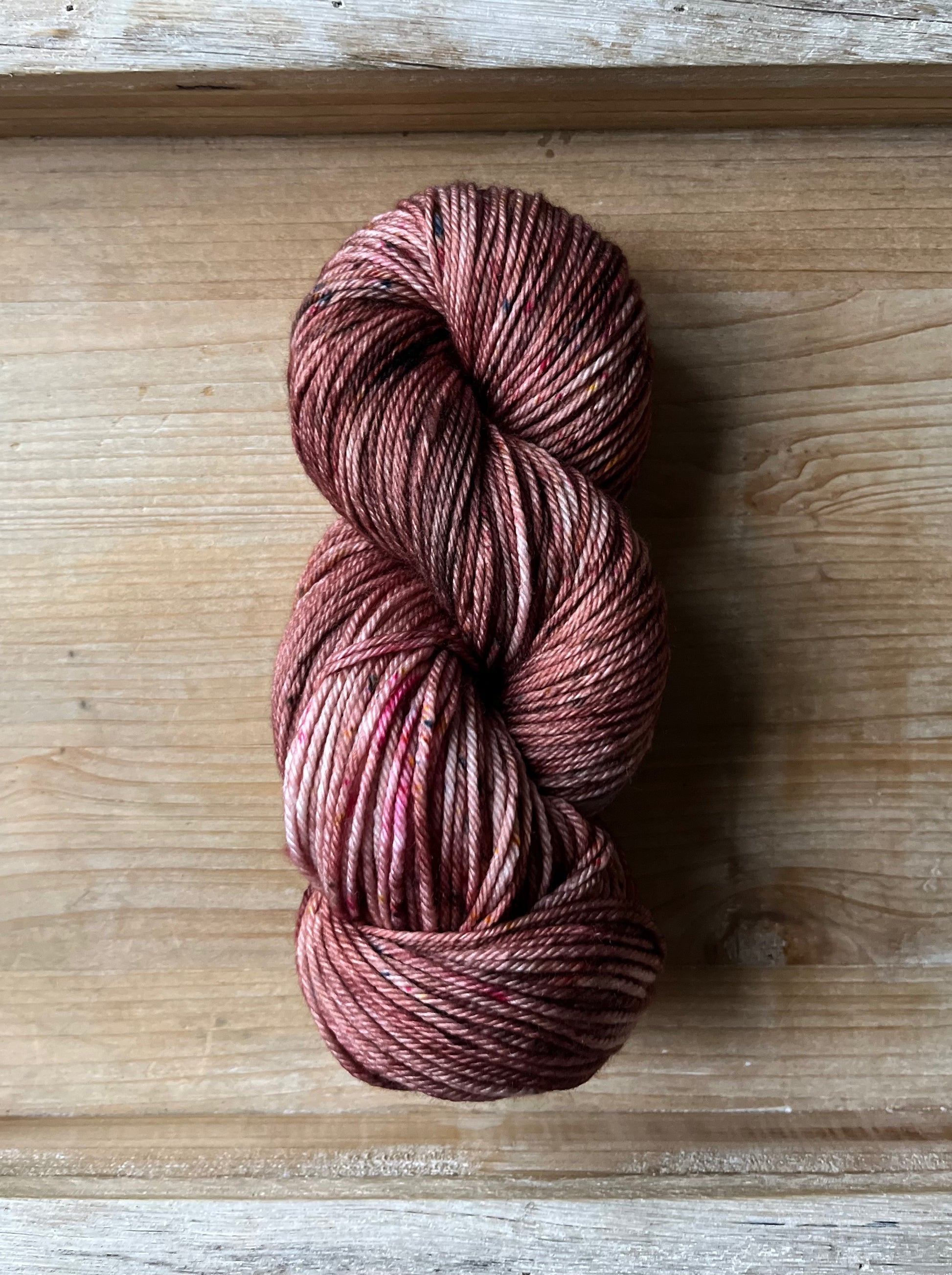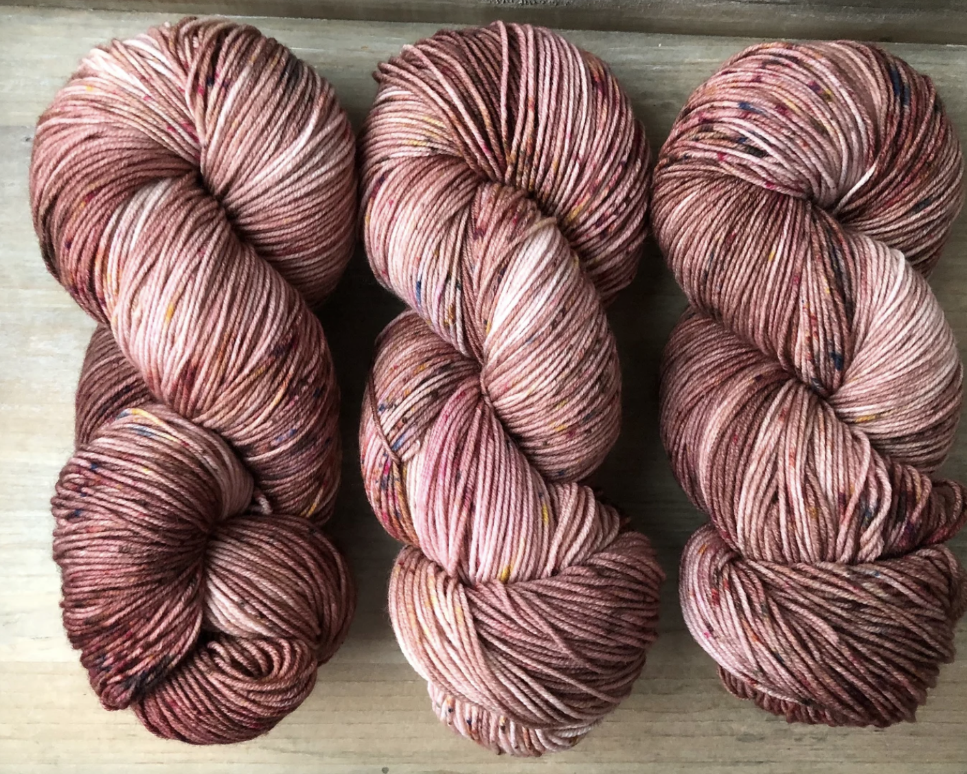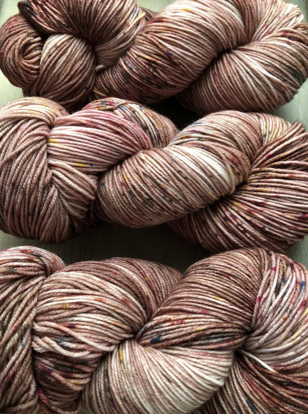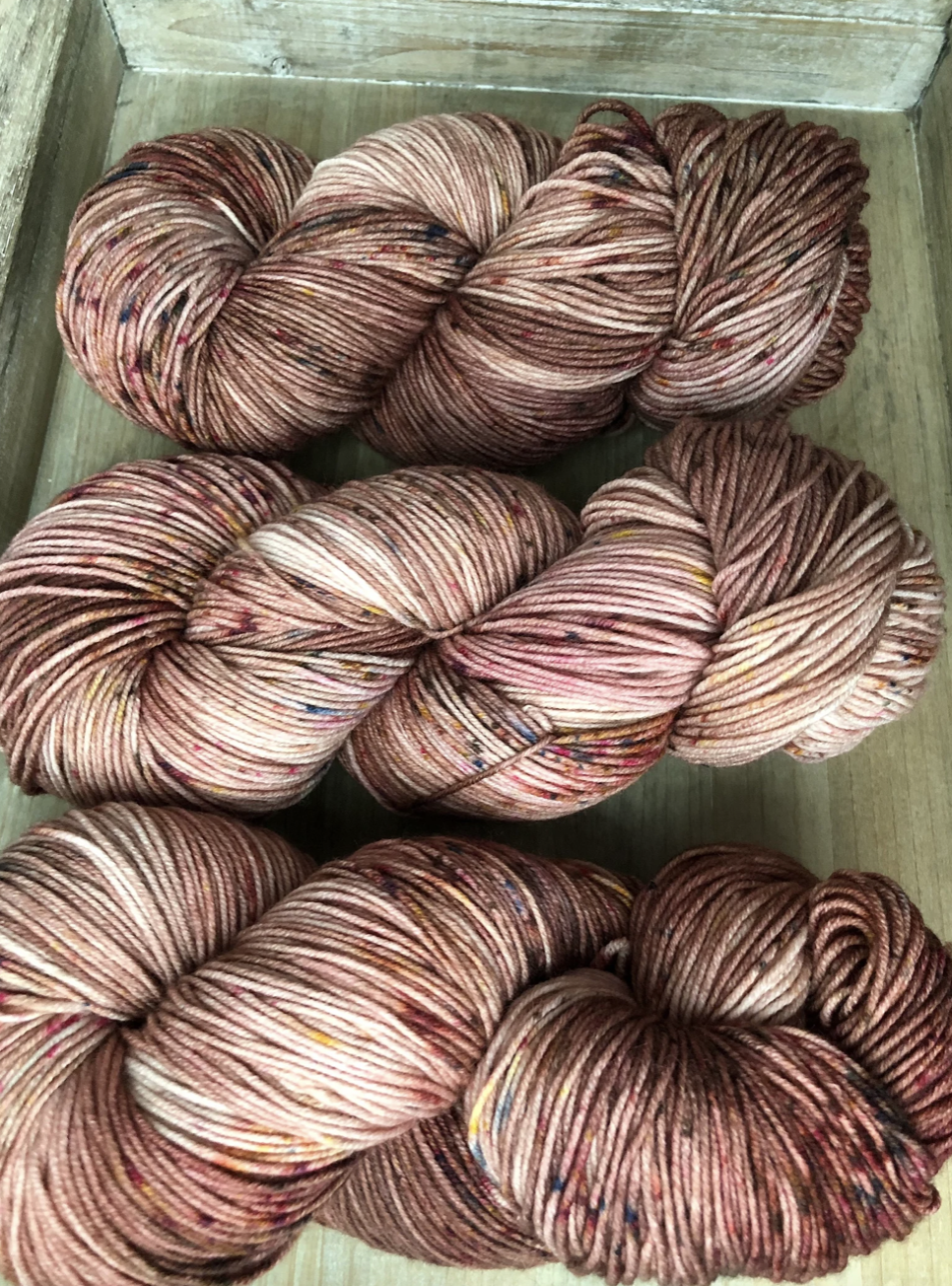 Brown Eyed Girl is a fan favourite, in both yarn and in song! This fabulous hand dyed yarn has the best of browns, rose-y pinks, and all the speckles in between! Some batches have more pink than others, but I will only ship you multiple skeins from the same dye pans for consistency. Alternating skeins in between rows is especially recommended with colourways like this one.