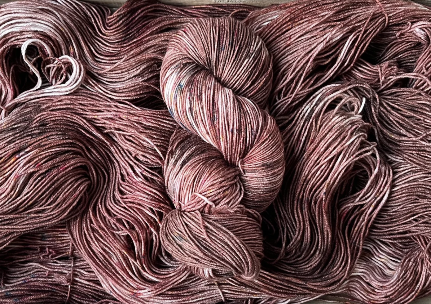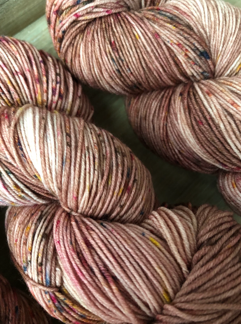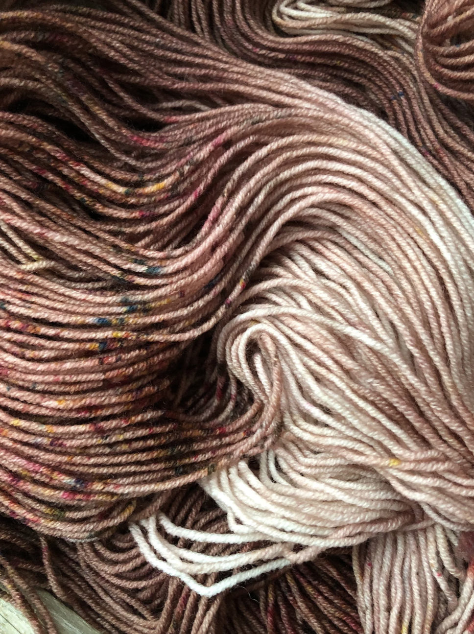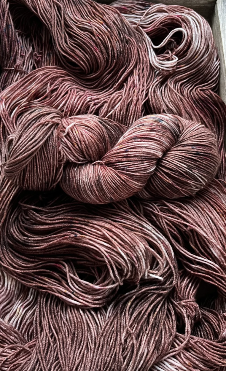 Brown Eyed Girl is a fan favourite, in both yarn and in song! This fabulous hand dyed yarn has the best of browns, rose-y pinks, and all the speckles in between! Some batches have more pink than others, but I will only ship you multiple skeins from the same dye pans for consistency. Alternating skeins in between rows is especially recommended with colourways like this one.