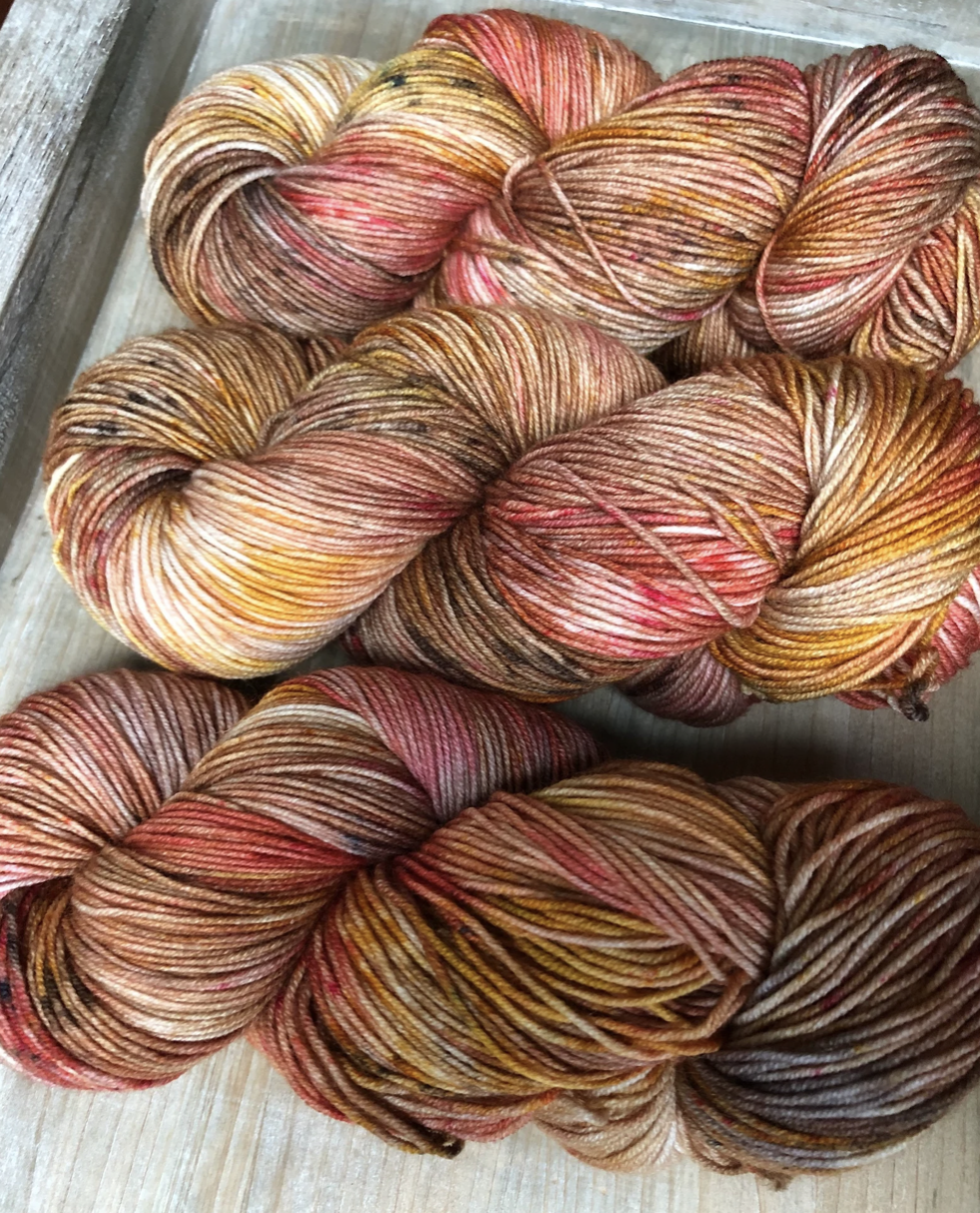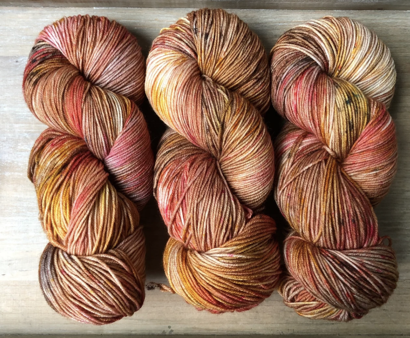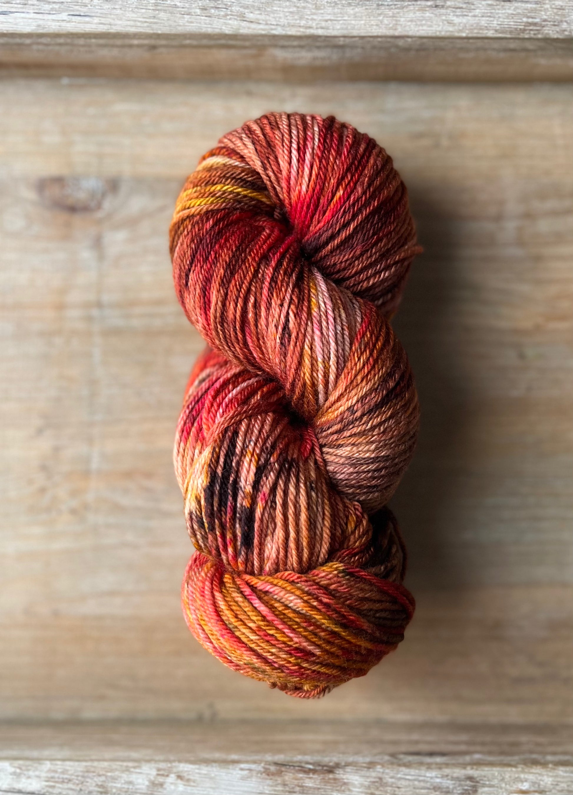 Burning Ground is a bold and fierce colourway. Rusty oranges and burnt golds, mild reds and brown speckles, this is a gorgeous palette of colours, reminiscent of autumn leaves. Photographing these colourways was challenging, because it's difficult to capture how truly special each skein is. Even when dyed in the same batch, in the same pan, each skein is truly one of a kind. And once twisted into a skein, we loose a lot of visibility of the swirling blends of colours and speckles. Once you unwrap the yarn, all the beauty is released and you can really see how special these colourways are. Alternating skeins in between rows is suggested when using any colourway like this one.