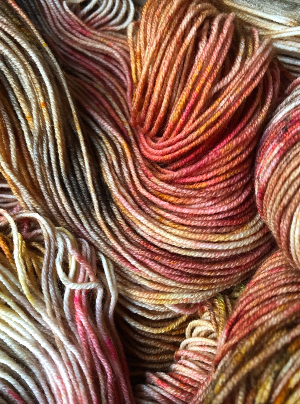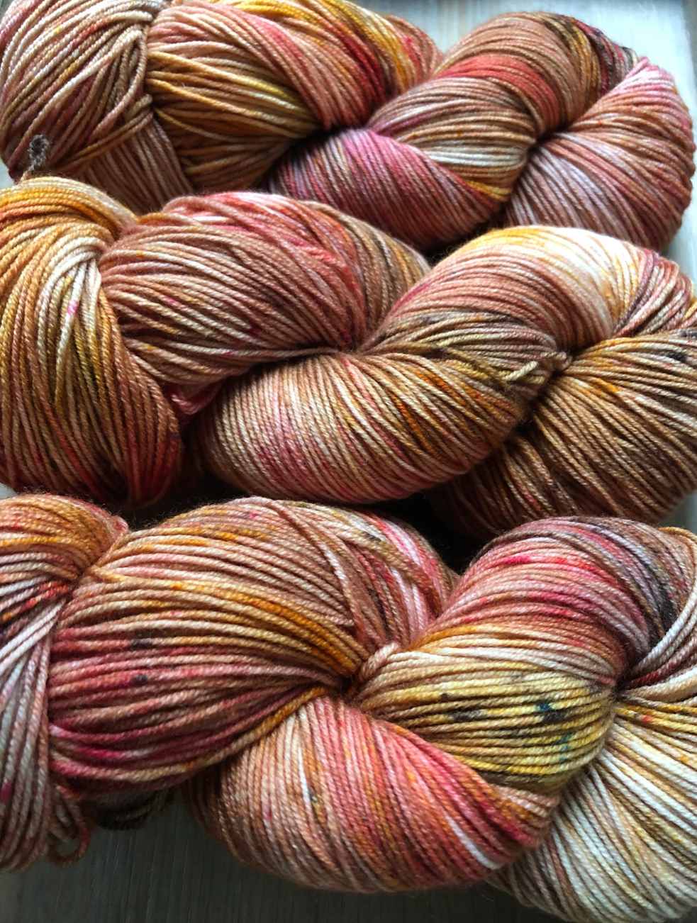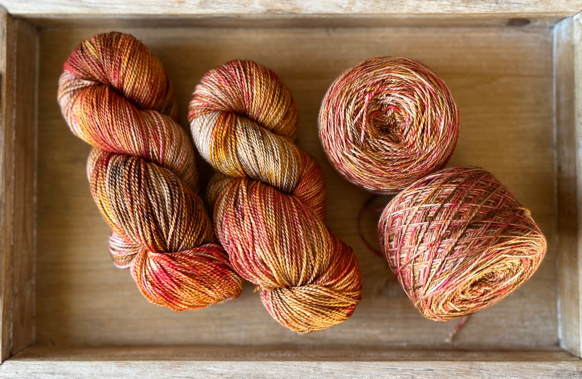 Burning Ground is a bold and fierce colourway. Rusty oranges and burnt golds, mild reds and brown speckles, this is a gorgeous palette of colours, reminiscent of autumn leaves. Photographing these colourways was challenging, because it's difficult to capture how truly special each skein is. Even when dyed in the same batch, in the same pan, each skein is truly one of a kind. And once twisted into a skein, we loose a lot of visibility of the swirling blends of colours and speckles. Once you unwrap the yarn, all the beauty is released and you can really see how special these colourways are. Alternating skeins in between rows is suggested when using any colourway like this one.