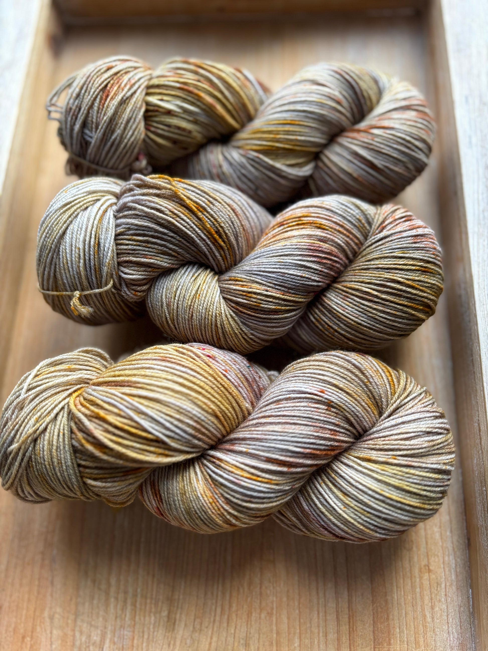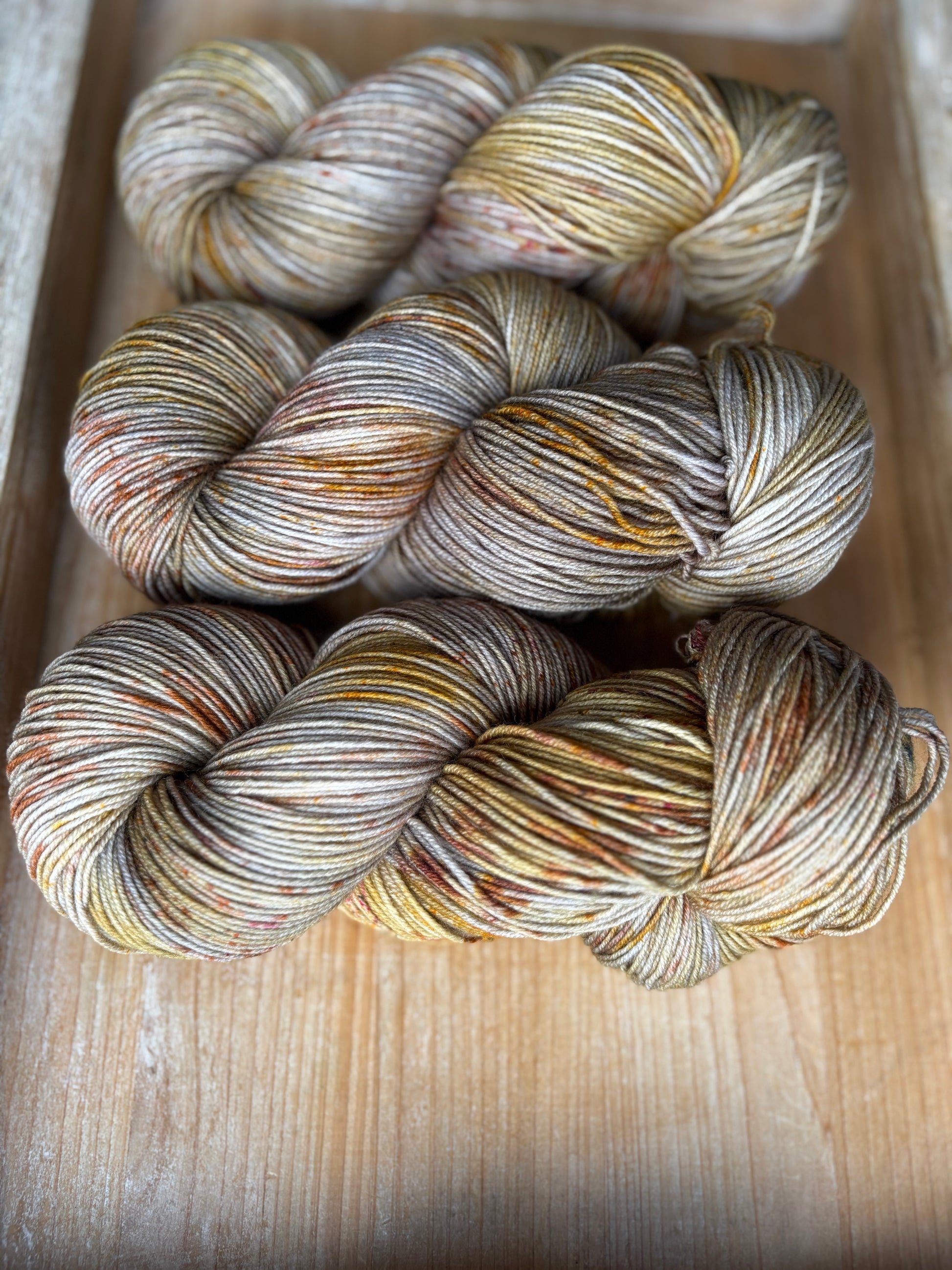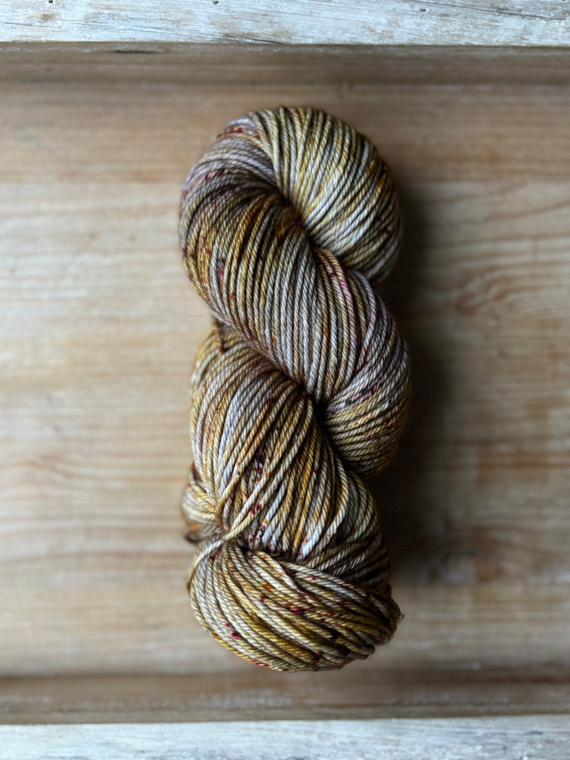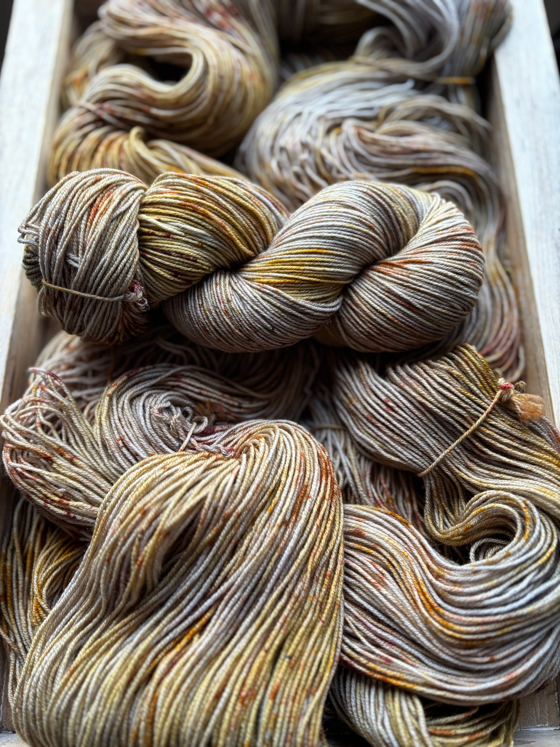 Catching Fireflies is a colourway full of sparkle and glow, with notes of silver and gold, speckles of bronze-y caramel and brown. Catching Fireflies will spark a love for hand dyed yarn, as each skein is truly a unique and one of a kind creation. You'll want to make sure to alternate skeins in between rows of larger projects to melt each skein into the next!