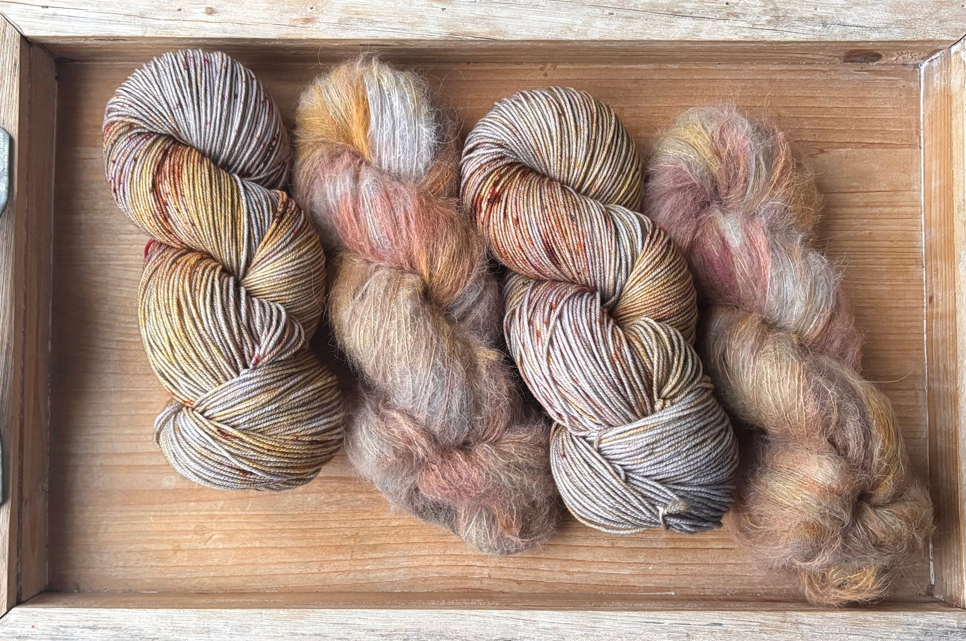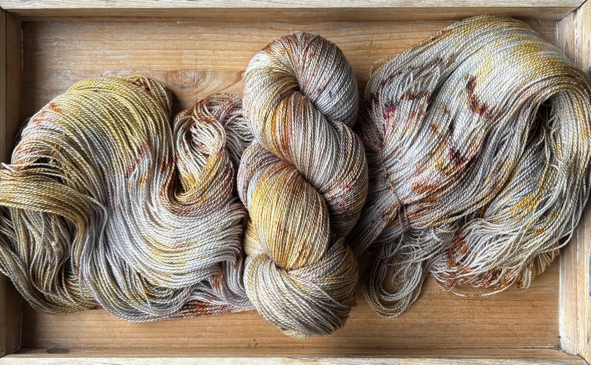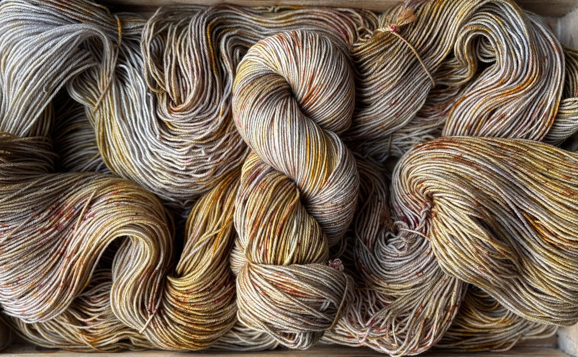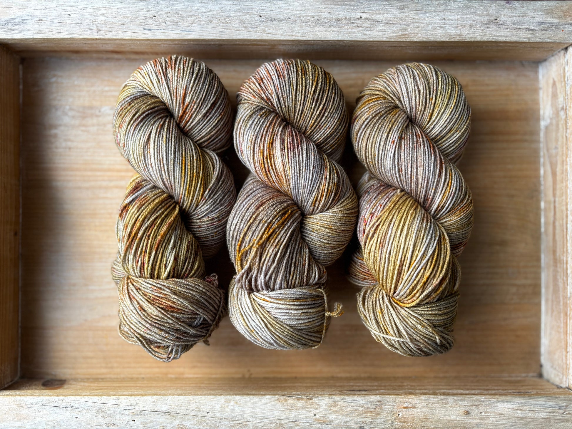 Catching Fireflies is a colourway full of sparkle and glow, with notes of silver and gold, speckles of bronze-y caramel and brown. Catching Fireflies will spark a love for hand dyed yarn, as each skein is truly a unique and one of a kind creation. You'll want to make sure to alternate skeins in between rows of larger projects to melt each skein into the next!