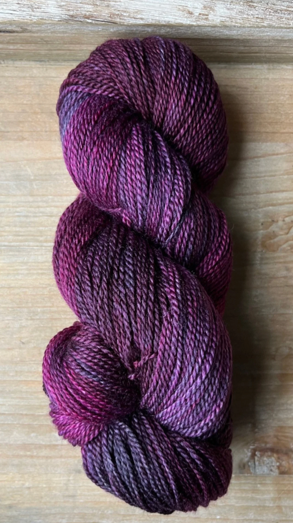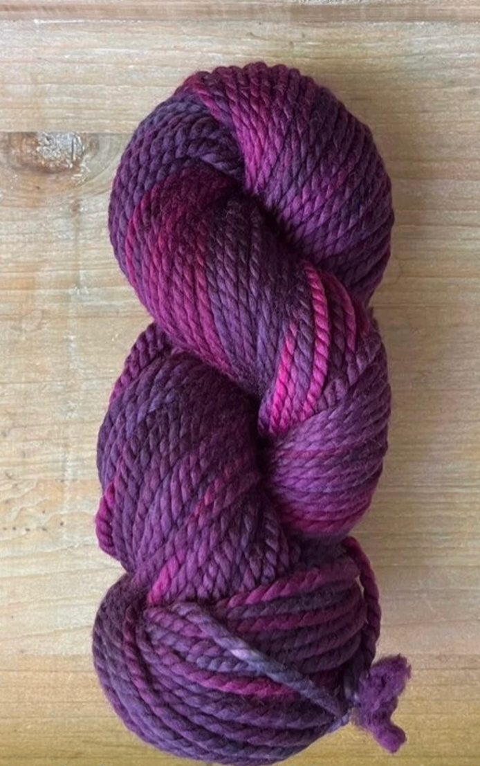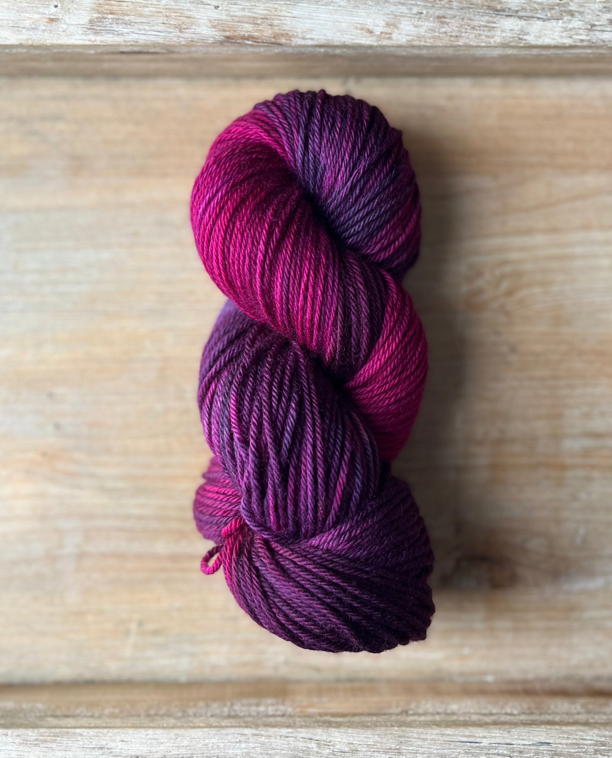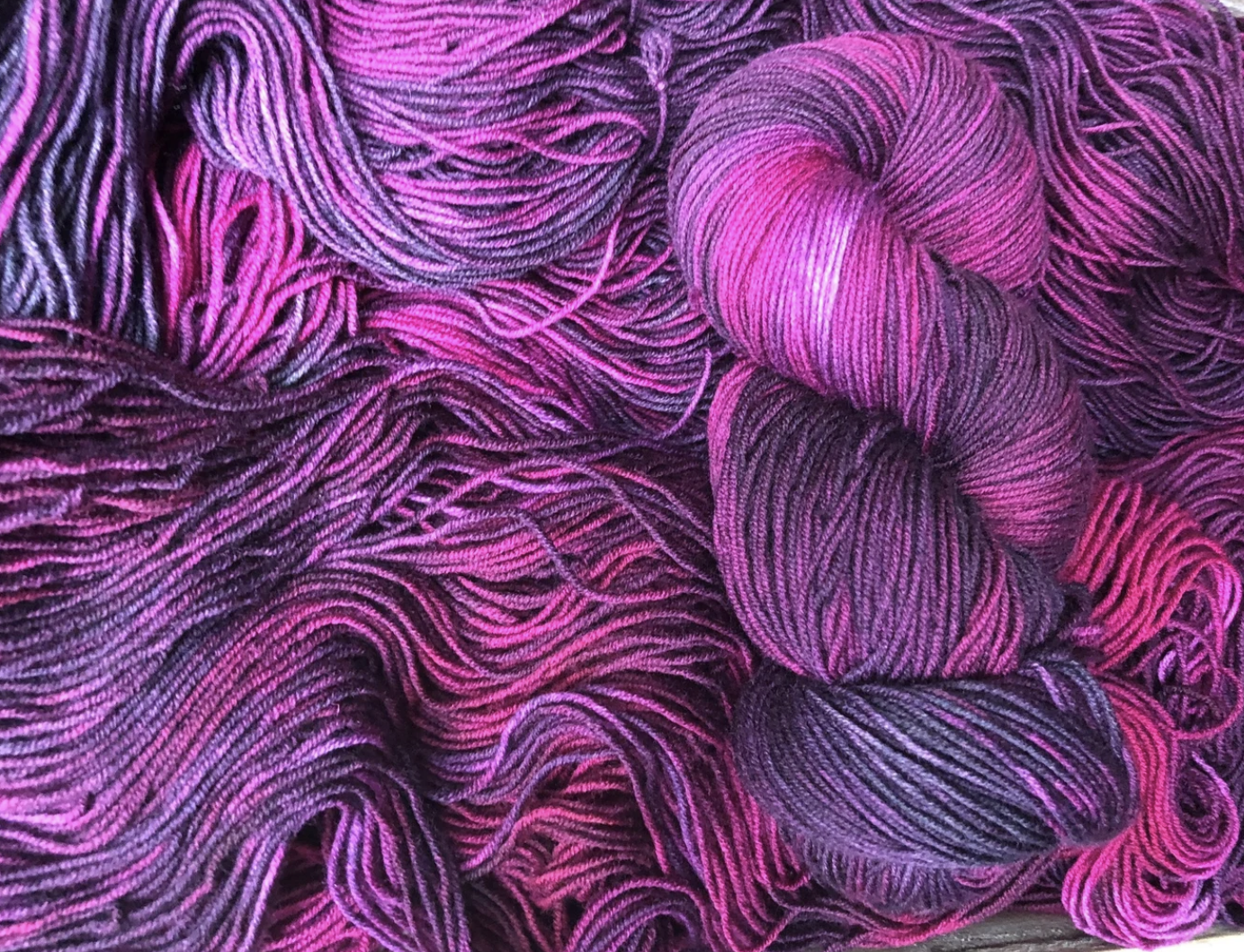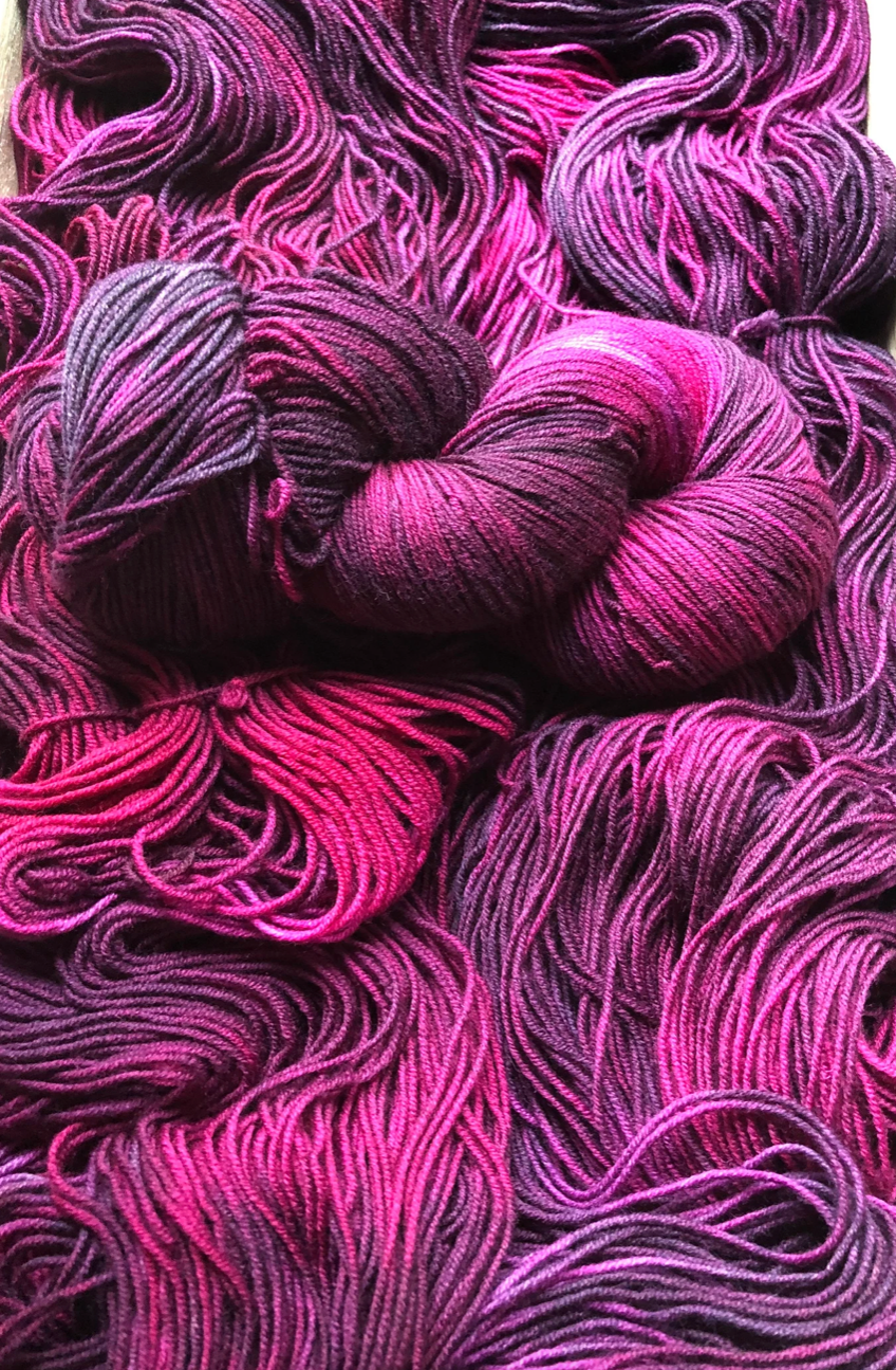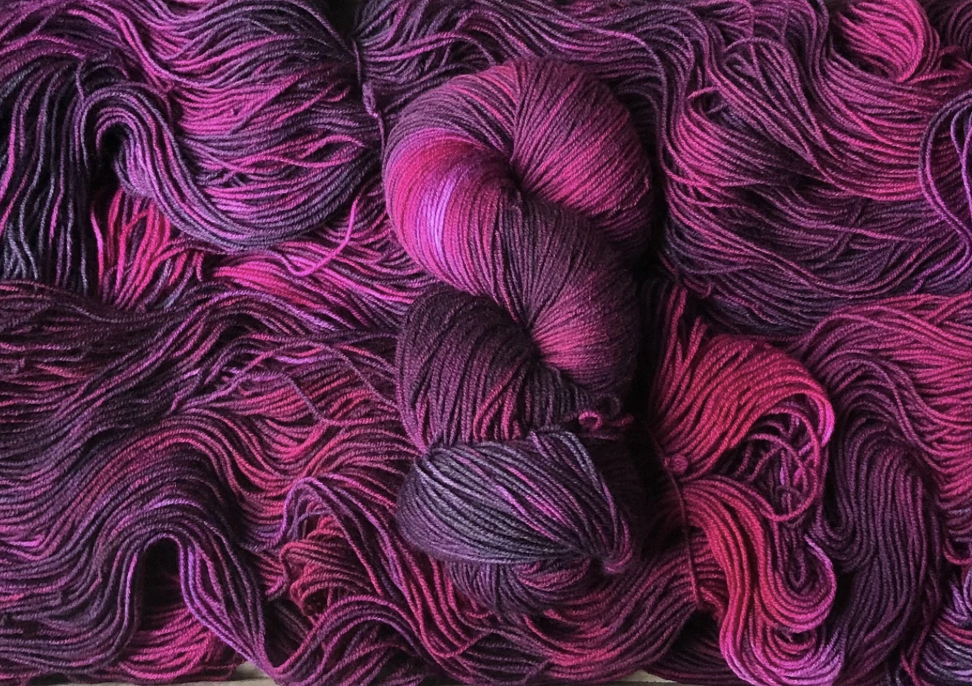 Cherry Bomb is a a dramatic swirling blend of magenta and black. I fear the photos don't quite do it justice, as each skein has so many layers of different hues within it. Magentas, fuchsias, violets, the whole range!