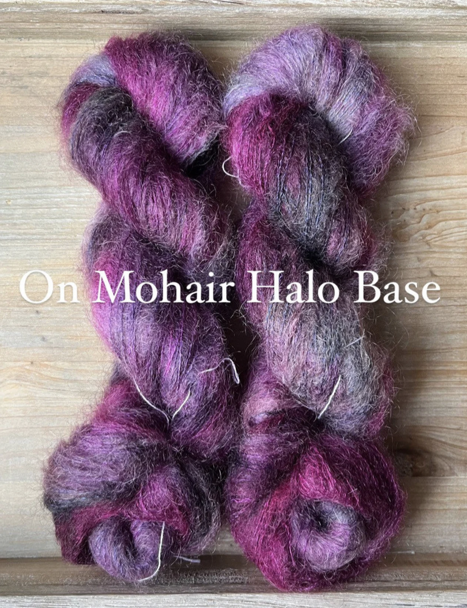 Mohair Halo Base: A delicate, lace weight yarn made up of 72% Superkid Mohair and 28% Mulberry Silk. Each skein is 50 grams and 460 yards, single ply construction. This yarn is lovely on it’s own, but is also amazing when held together with another yarn base. The fuzziness of the mohair creates a halo of colour within your project. Fibres in this base are sourced from South Africa. Hand wash only, lay flat to dry.