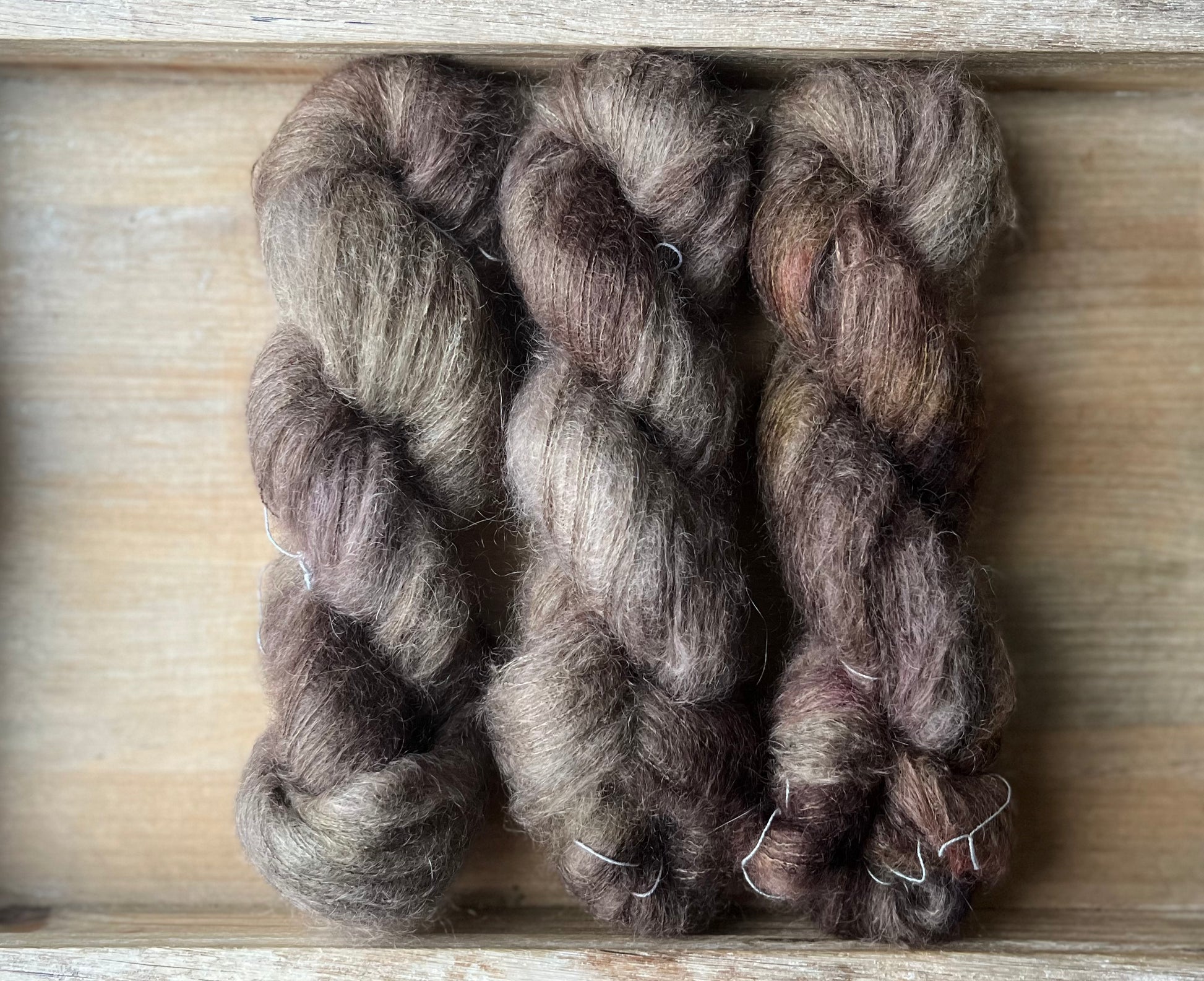Mohair Halo Base: A delicate, lace weight yarn made up of 72% Superkid Mohair and 28% Mulberry Silk. Each skein is 50 grams and 460 yards, single ply construction. This yarn is lovely on it’s own, but is also amazing when held together with another yarn base. The fuzziness of the mohair creates a halo of colour within your project. Fibres in this base are sourced from South Africa. Hand wash only, lay flat to dry.