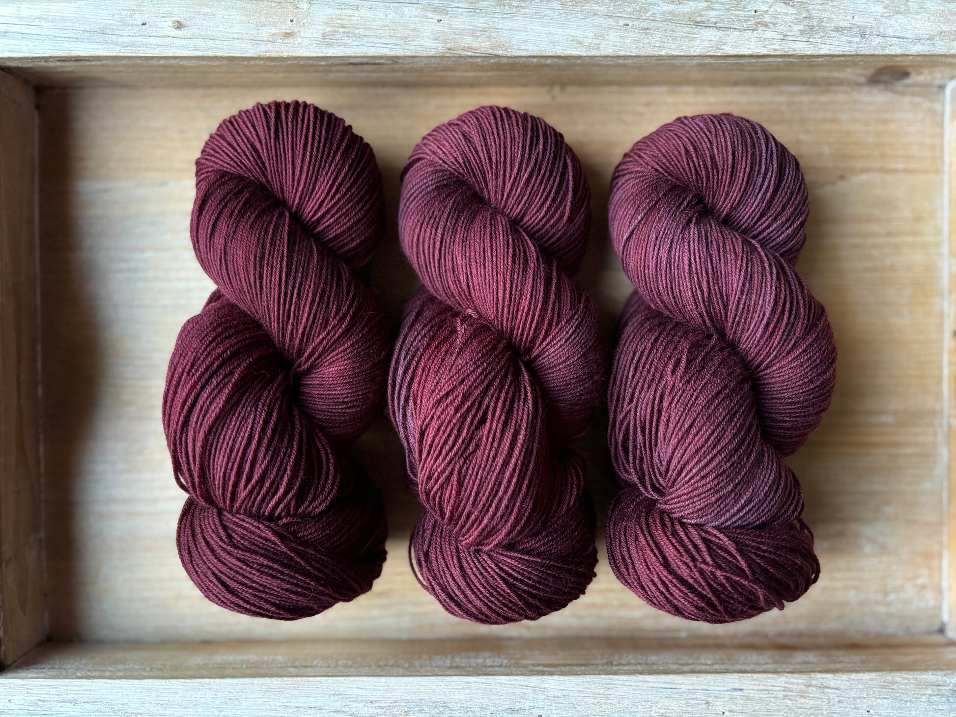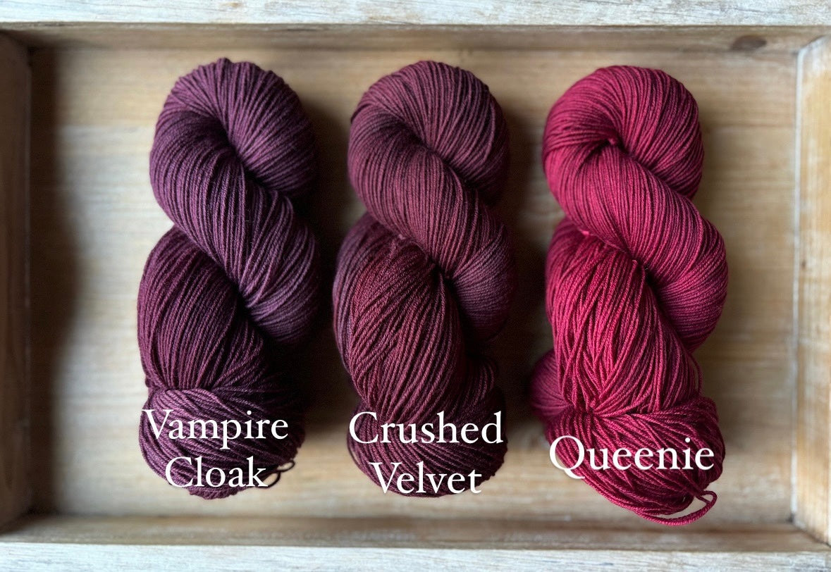 Crushed Velvet is a welcome new addition to the shop, when a batch of Vampire’s Cloak went wrong, but let’s face it, also went sooo right! Swapping out one red for another, this deep berry purple is bringing the mood to your next project! I find the photo of one single skein on its own really highlights this big colour at its best!