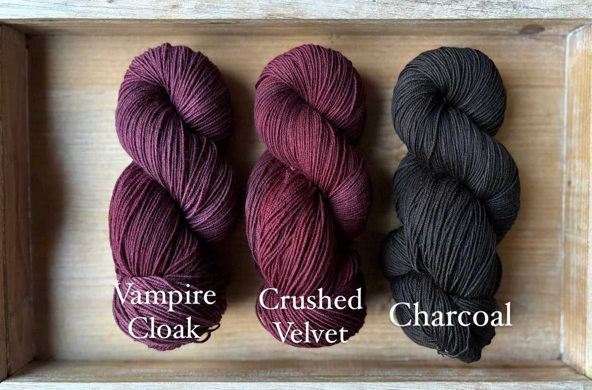Luxe Sock Base: Luxe Sock is made up of 75% Ultra Fine Merino Wool, 15% Mulberry Silk, and 10% Cashmere. Each skien is 100 grams and 437 yards, 2ply construction. This yarn base is heavenly soft against the skin, and perfect for a special project calling for a high end fingering weight yarn. The Mulberry Silk adds drape and lustre, and the cashmere creates a fuzzy halo effect as you work with it. The colours of dye tend to shine through, looking much more striking and rich compared to some of my samples on Superwash bases. Fibres in this base are sourced from Australia, the wool used in this yarn is ethically produced from sheep that have NOT been mulesed. Hand wash only, lay flat to dry.
