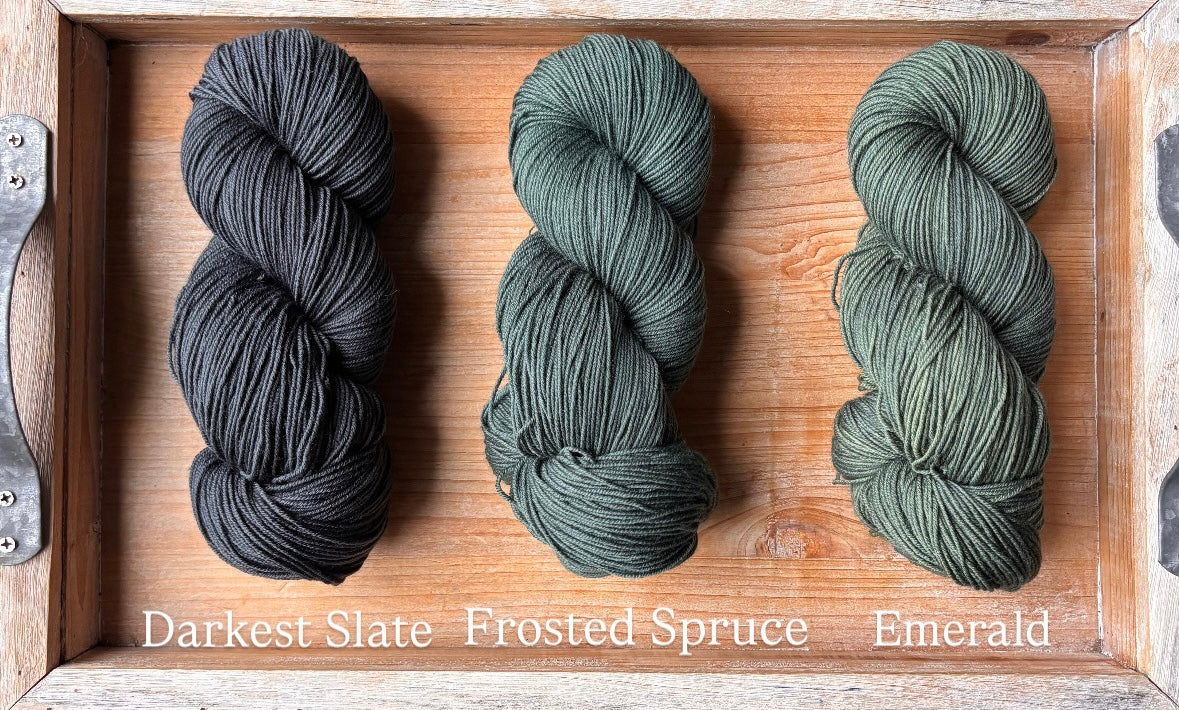 Emerald is a rich, medium green, a true emerald colourway. Similar in some ways to Evergreen Tree Farm, but not the same! This one leans more to the blue, and doesn't have the same variegated effect within it.