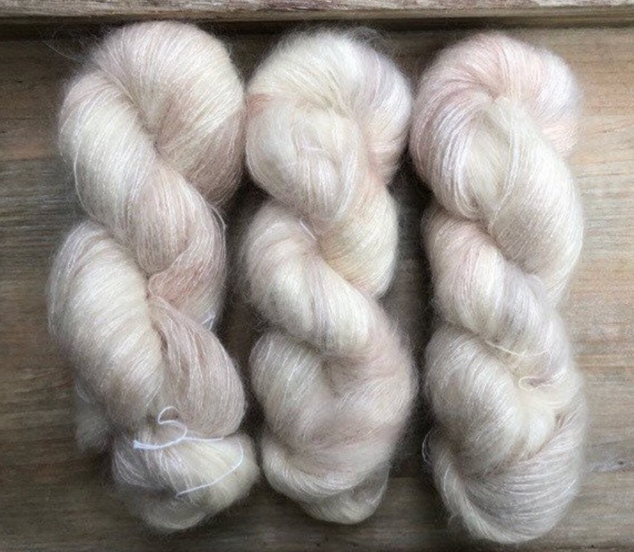 Mohair Halo Base: A delicate, lace weight yarn made up of 72% Superkid Mohair and 28% Mulberry Silk. Each skein is 50 grams and 460 yards, single ply construction. This yarn is lovely on it’s own, but is also amazing when held together with another yarn base. The fuzziness of the mohair creates a halo of colour within your project. Fibres in this base are sourced from South Africa. Hand wash only, lay flat to dry.