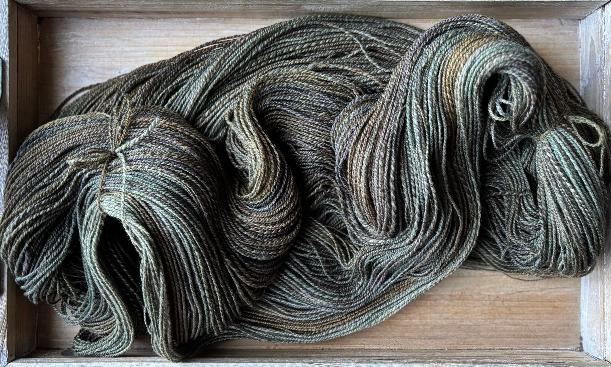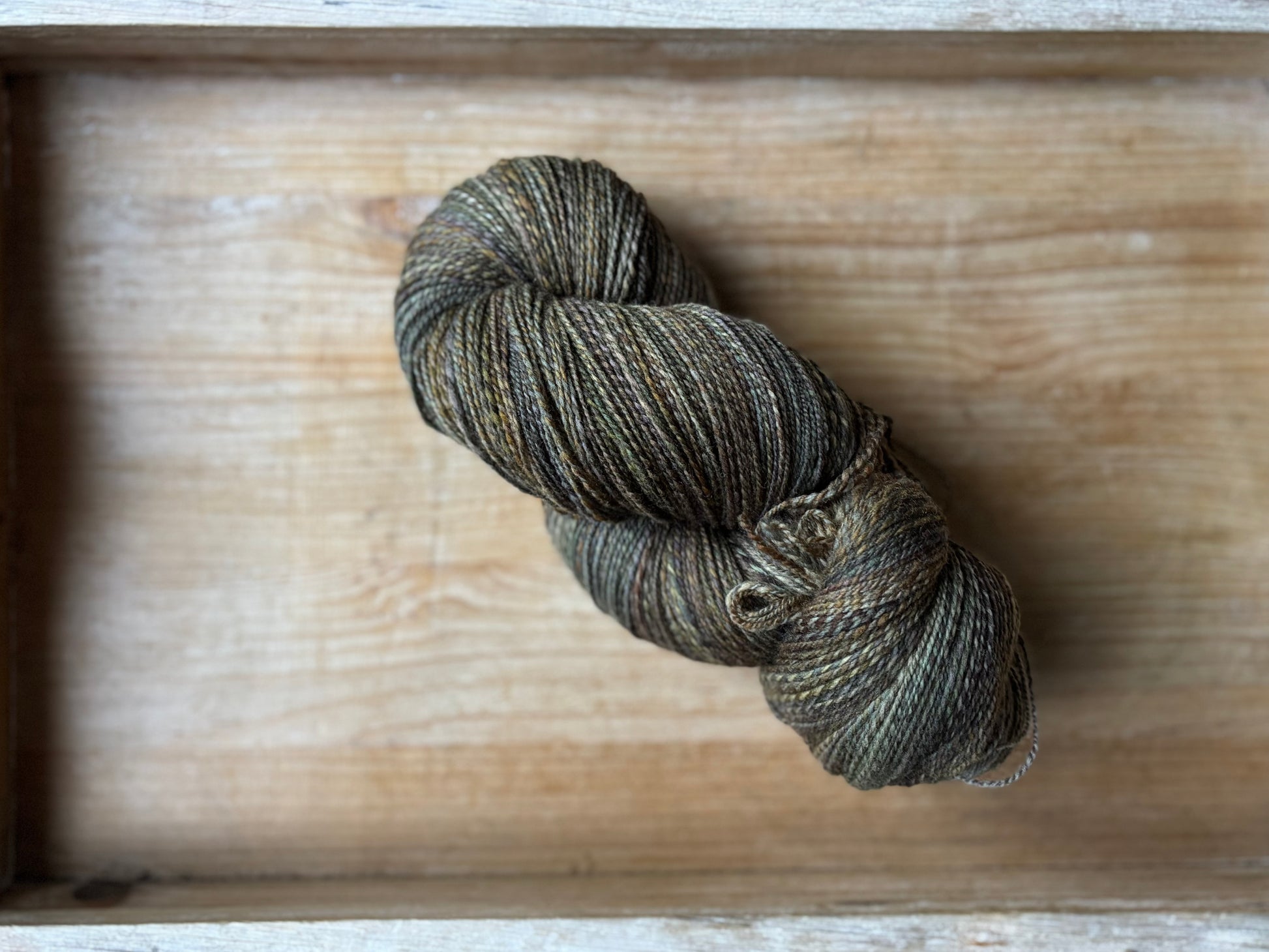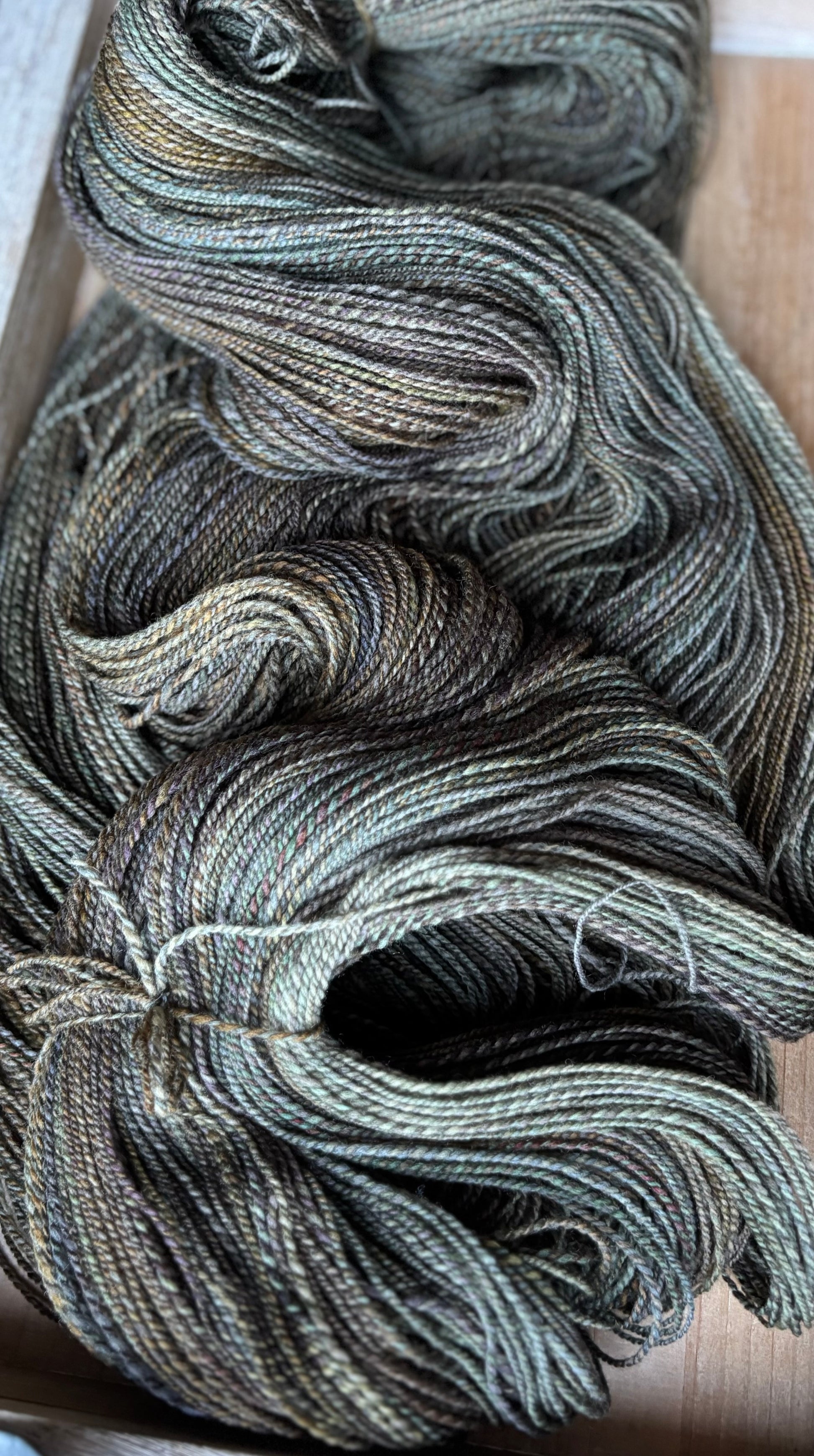 This skein of hand spun yarn has some of my favourite hues within it! Greens, greys, browns and a smidge of golds, make for a fabulous colour palette! I have discounted this skein by 10$ due to a break in the yarn, my swift was spinning a little too fast during the re skeining process and sadly snapped in one place.