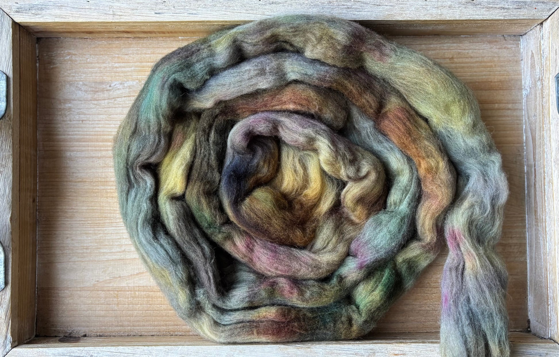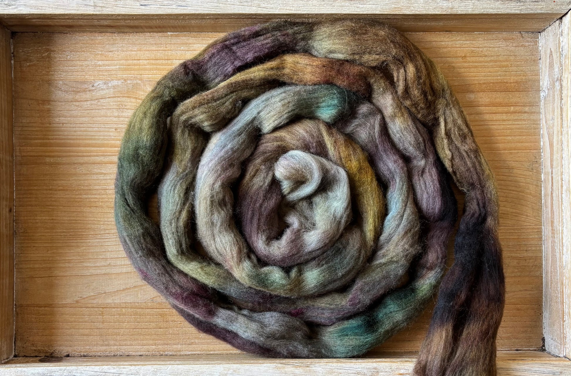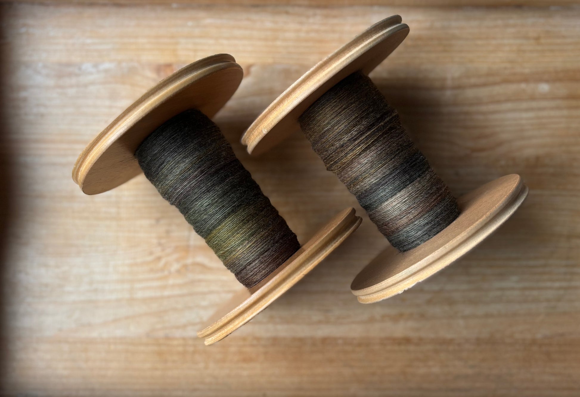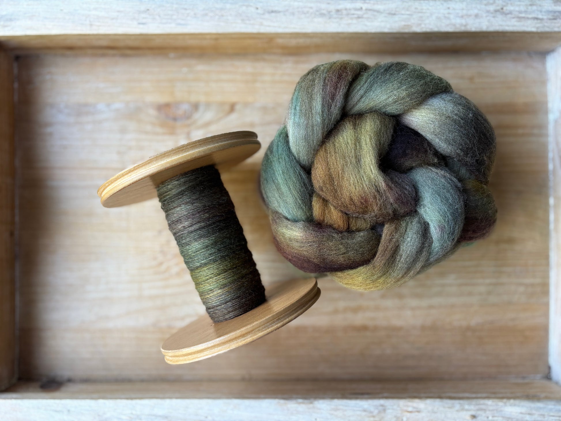 This skein of hand spun yarn has some of my favourite hues within it! Greens, greys, browns and a smidge of golds, make for a fabulous colour palette! I have discounted this skein by 10$ due to a break in the yarn, my swift was spinning a little too fast during the re skeining process and sadly snapped in one place.