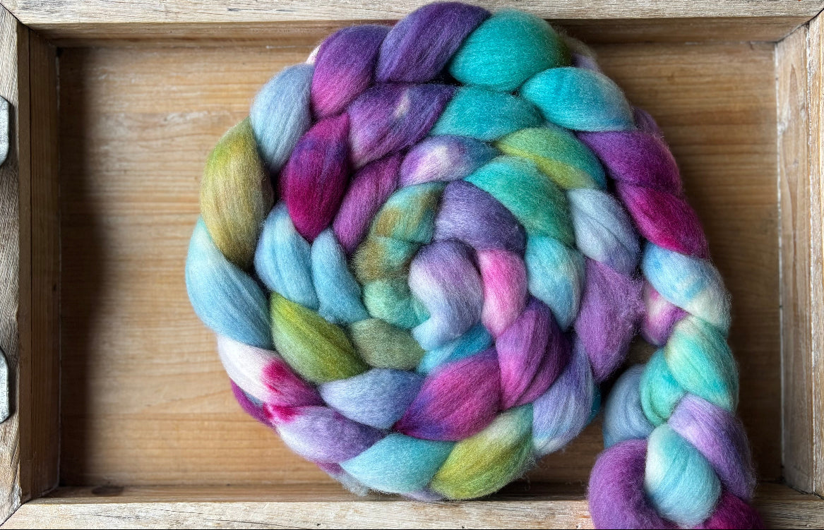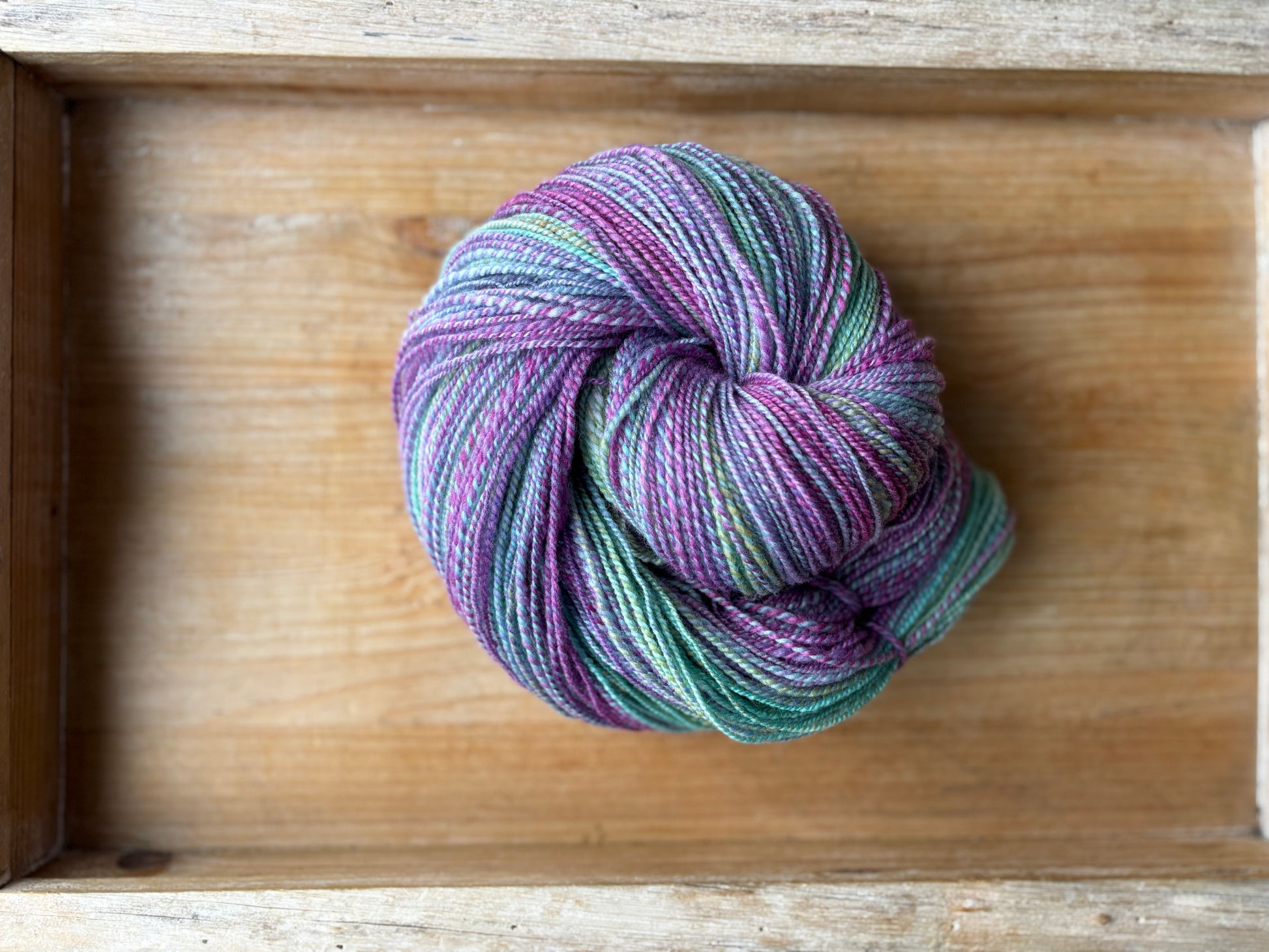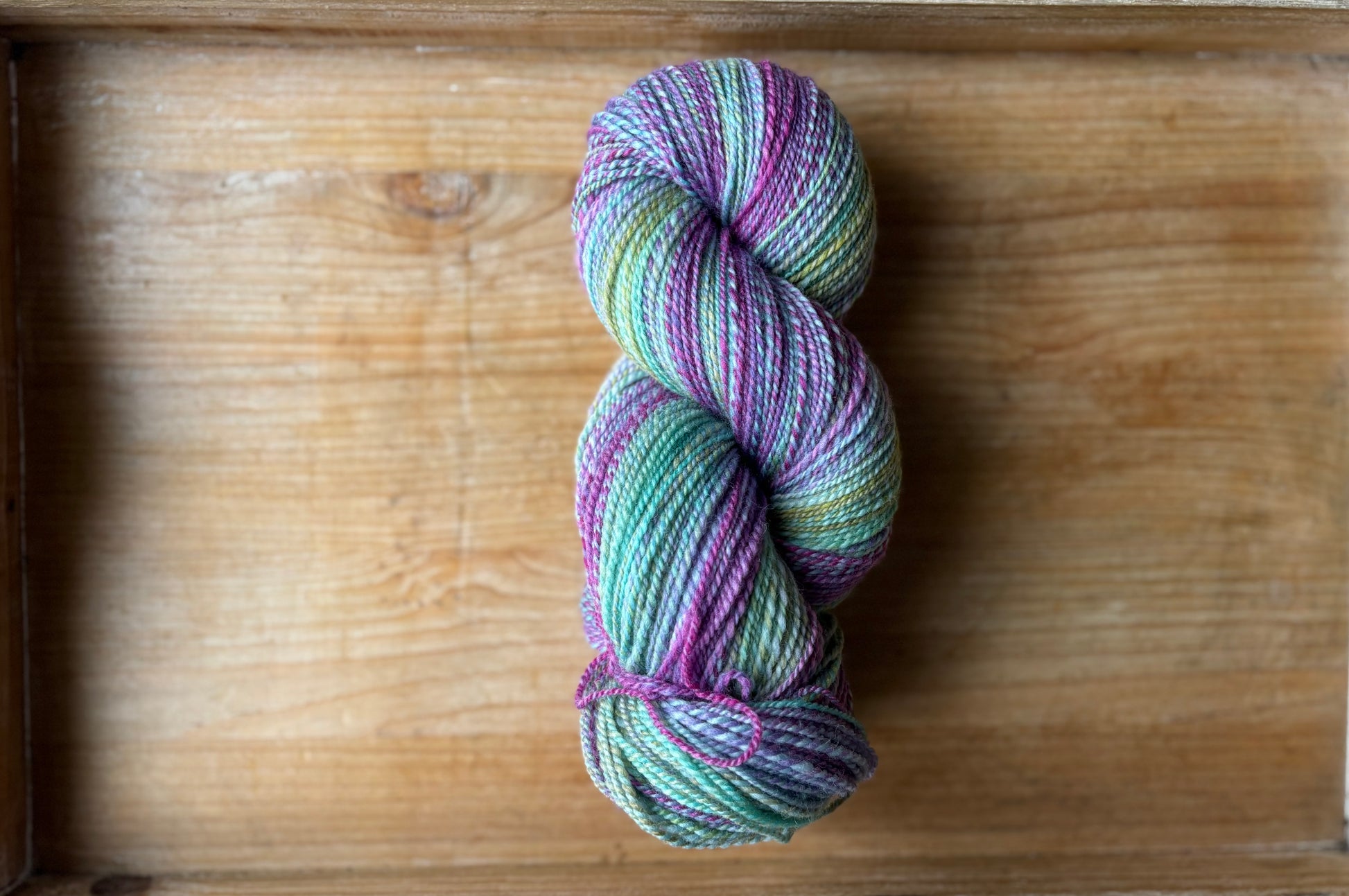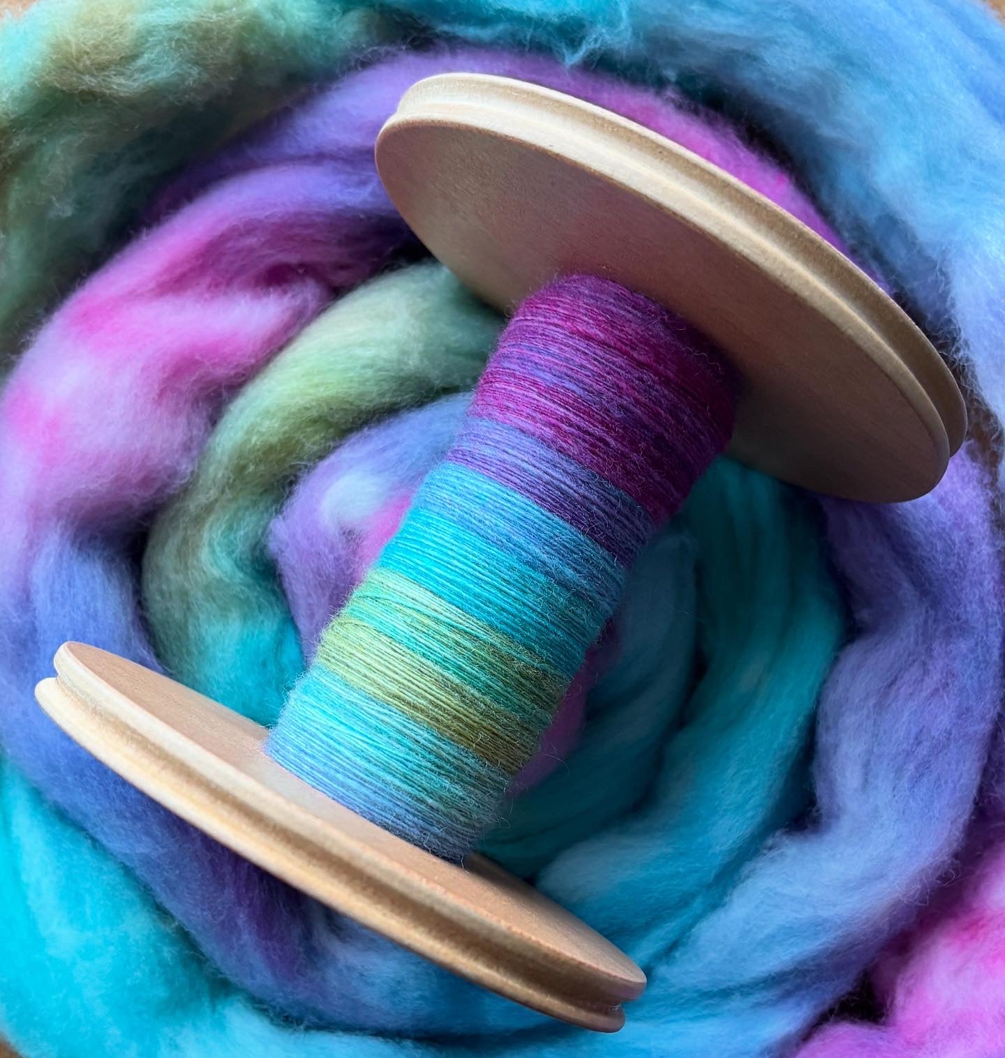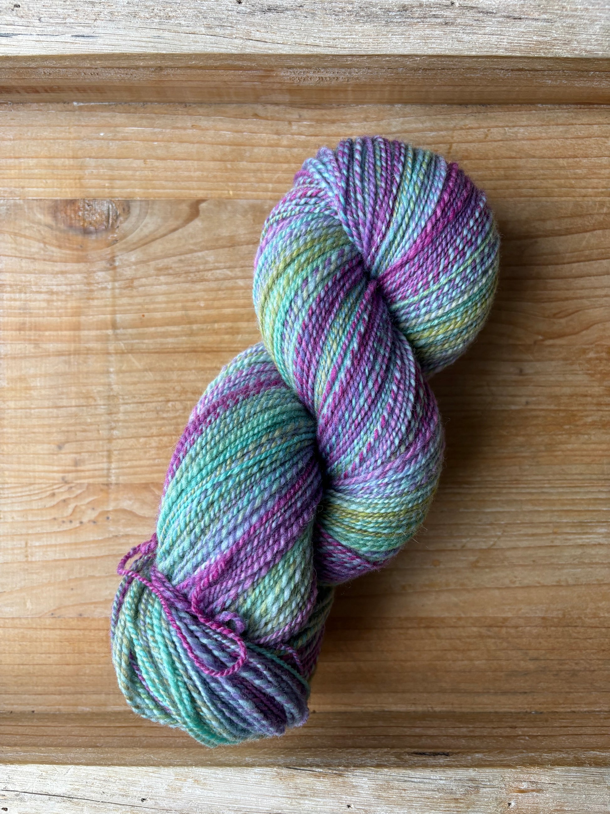 I used 22 Micron Untreated Polwarth Fibre to spin this yarn. You’ll need to be mindful of sharp temperature increases and decreases when washing this yarn, as it could felt if burned with hot water or put in the dryer. Some dye bleeding during the soaking process is normal with untreated wool.