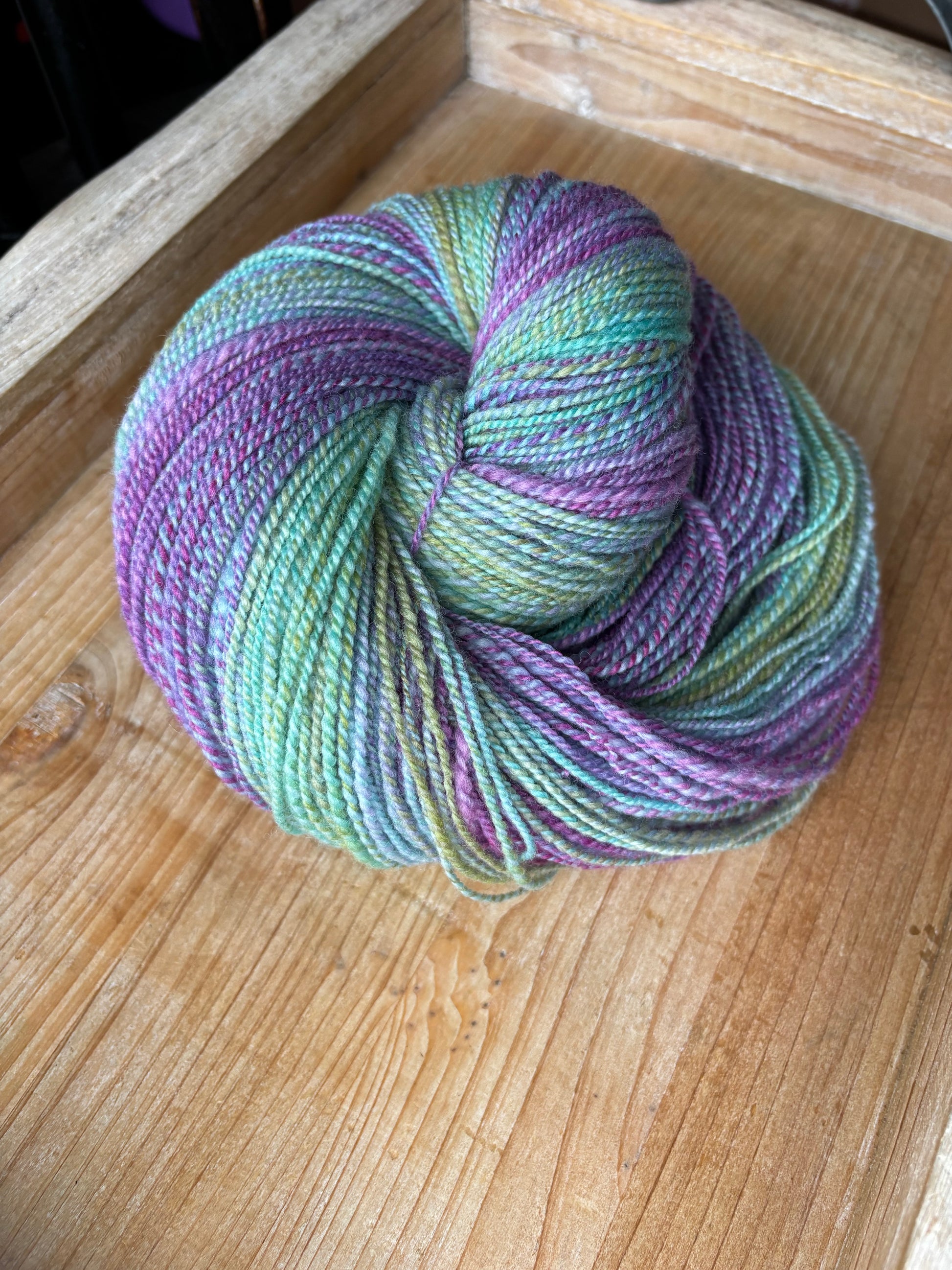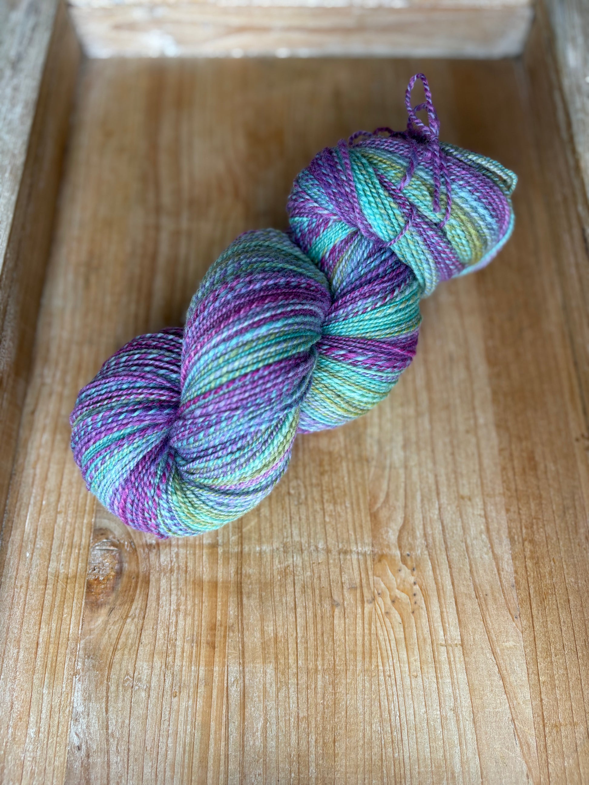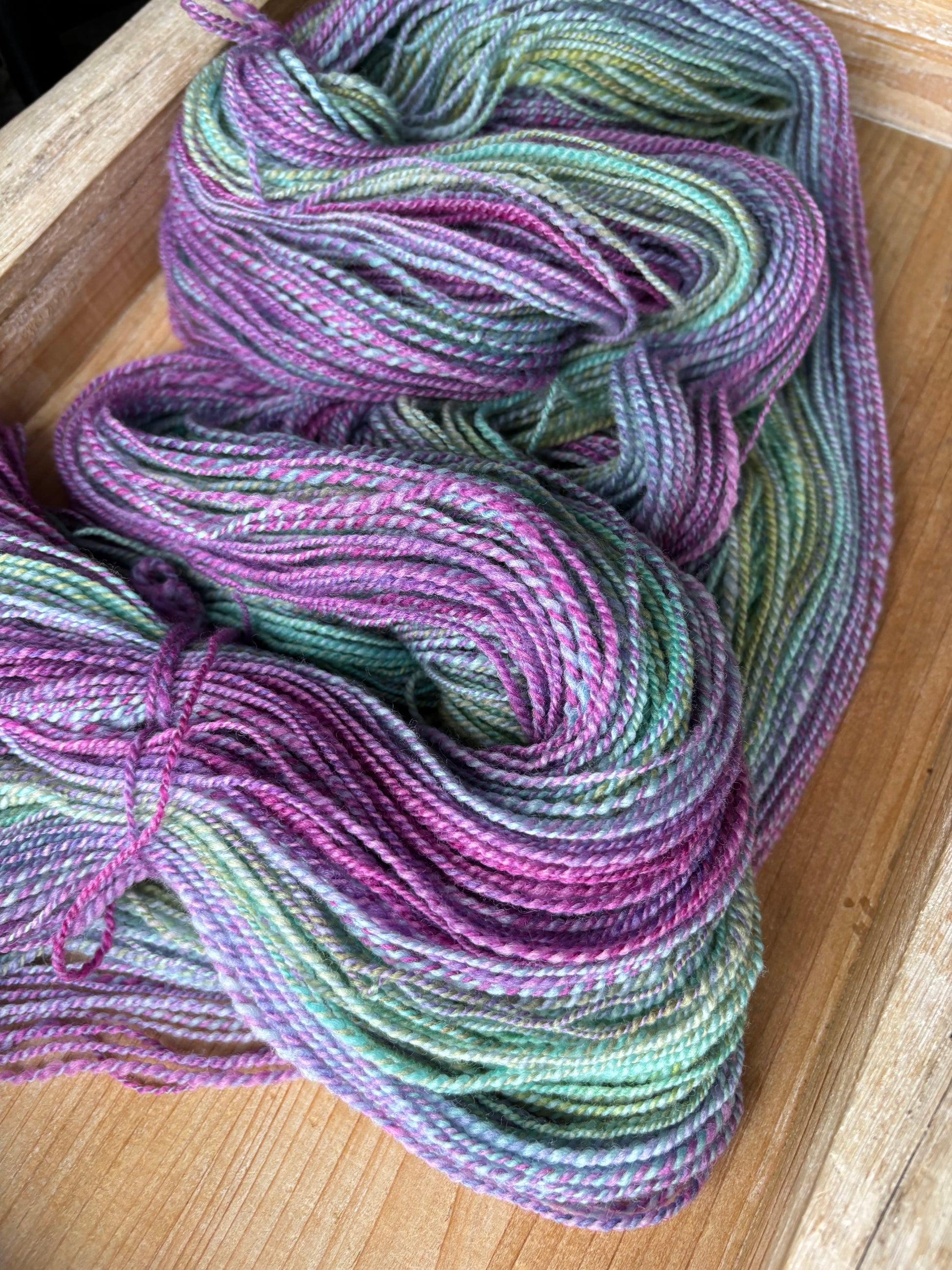 This 100% Untreated Polwarth fibre was spun up into a sport-ish weight, 2 ply yarn, using my Ashford E-Spinner.
