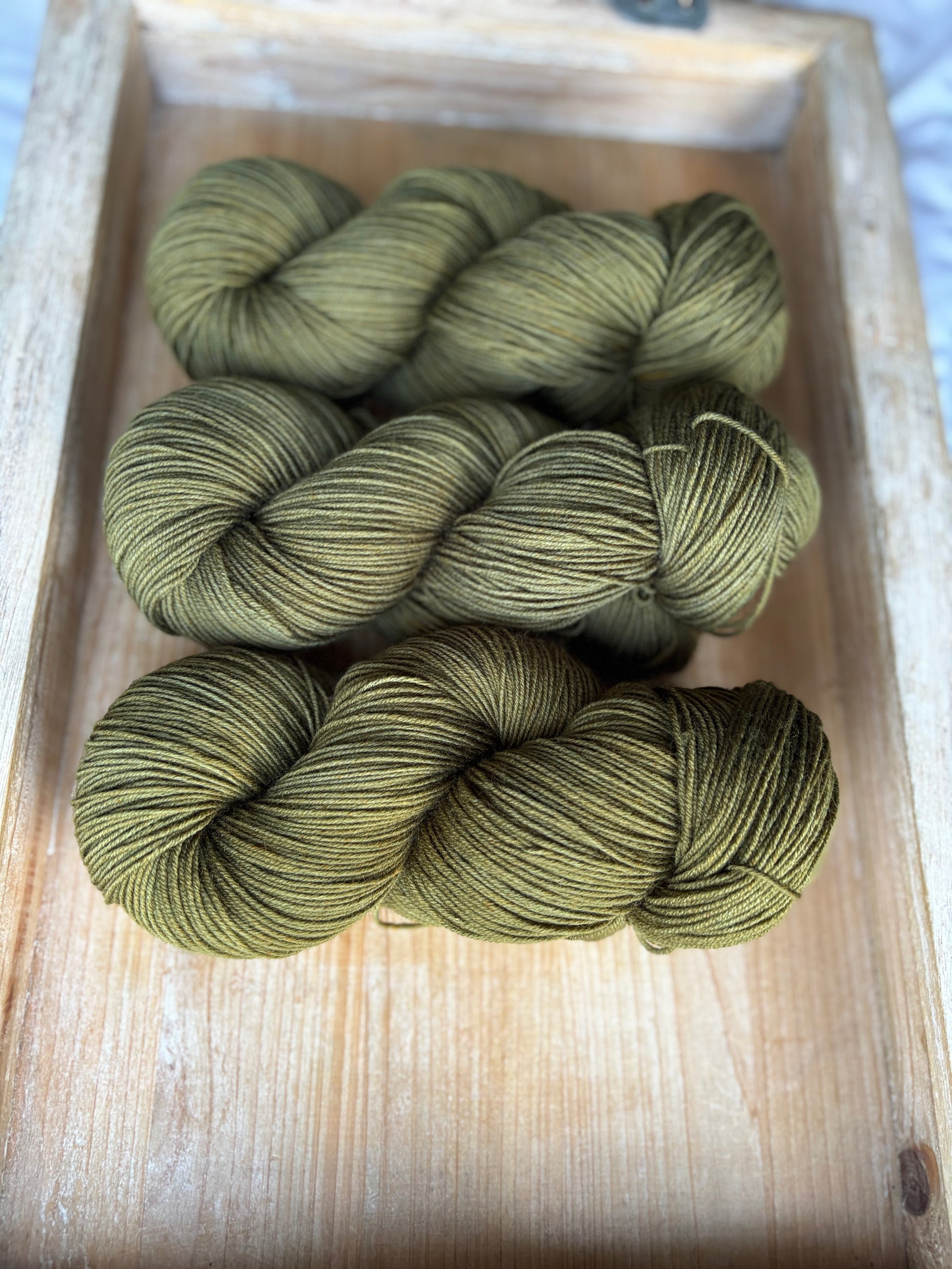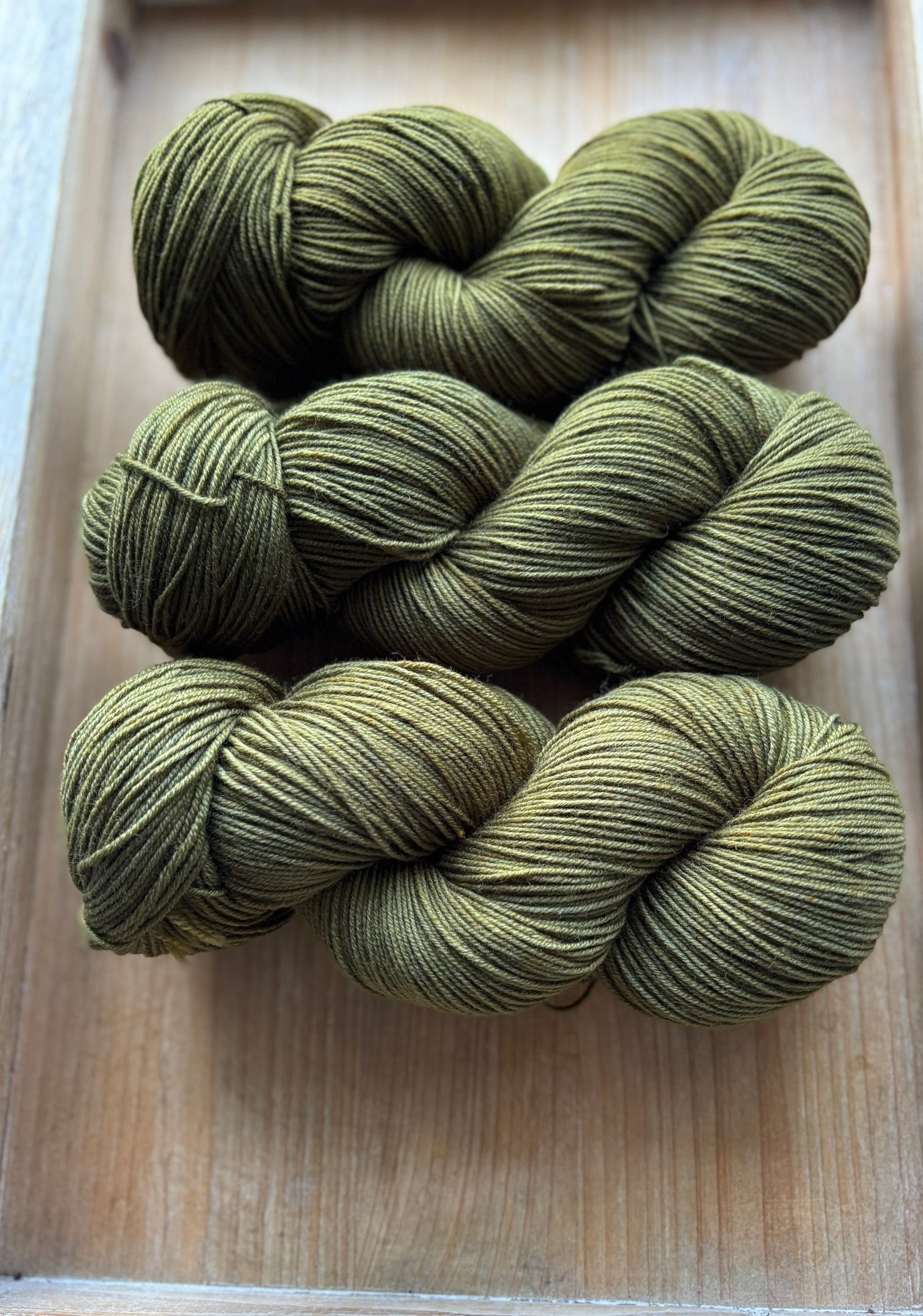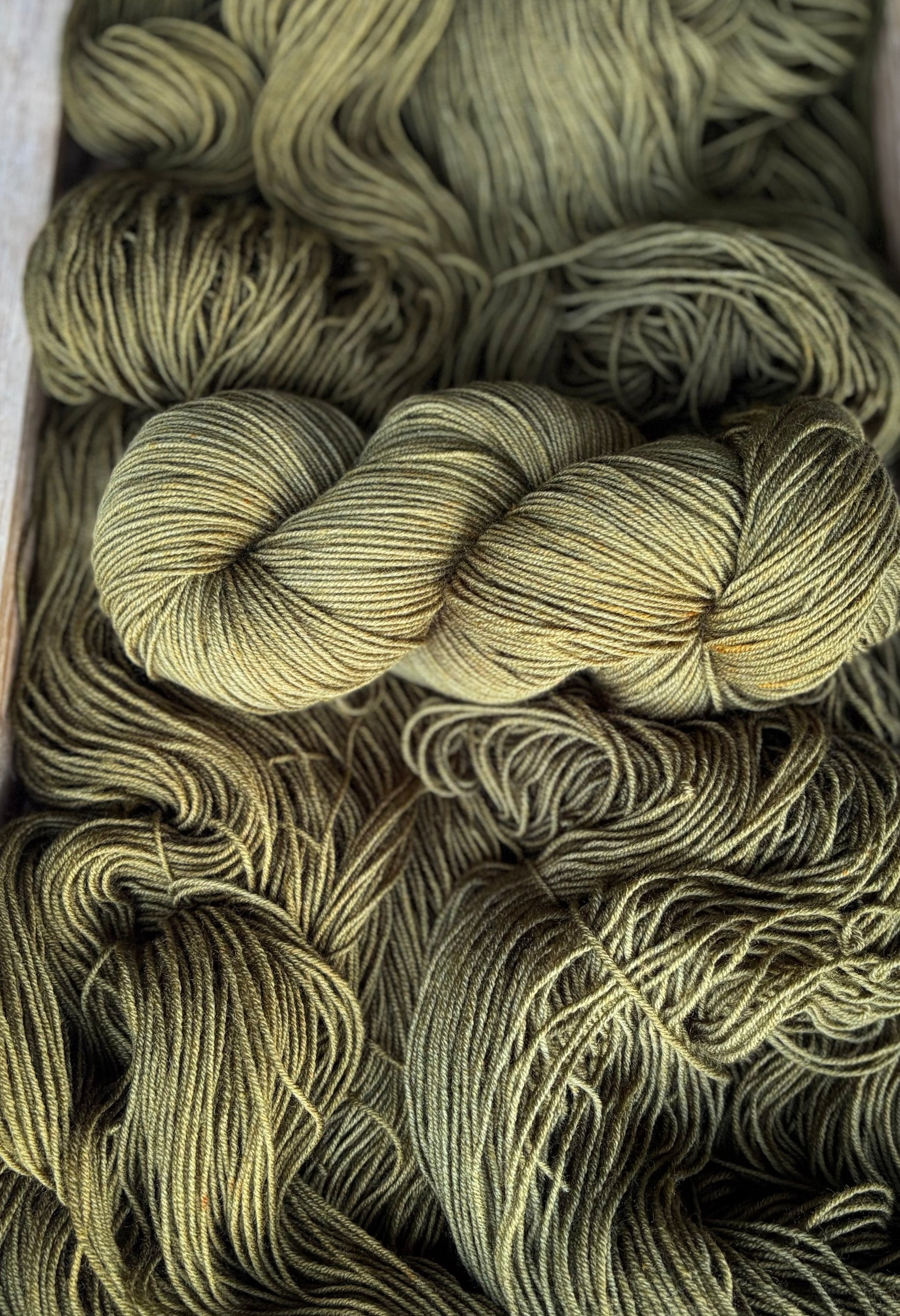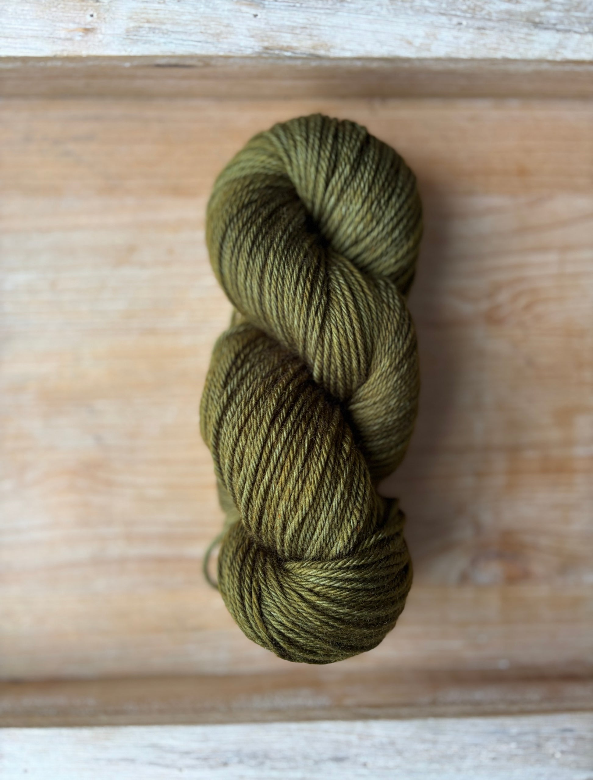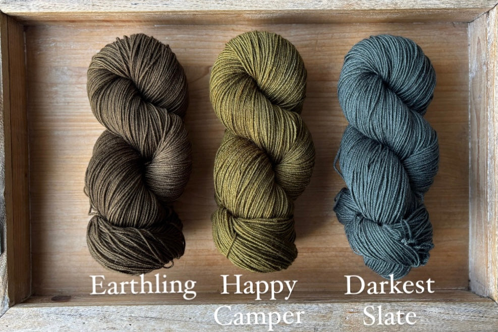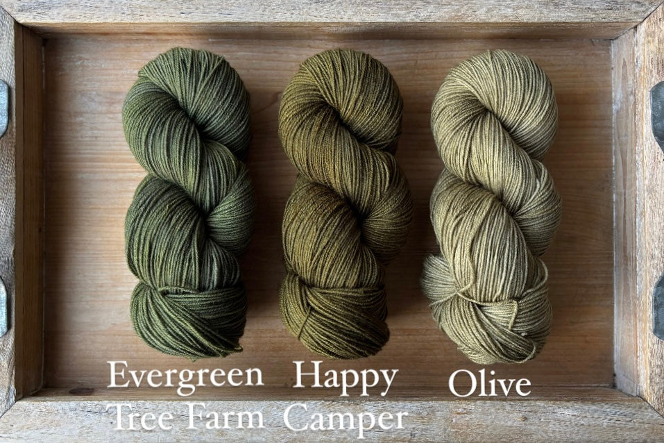 Happy Camper is a dark and bold shade of green! More of an army green by comparison to some others I have in the listings, but less brown than Earthling. Happy Camper will bring the joy to your next knit, with it's lively energy!