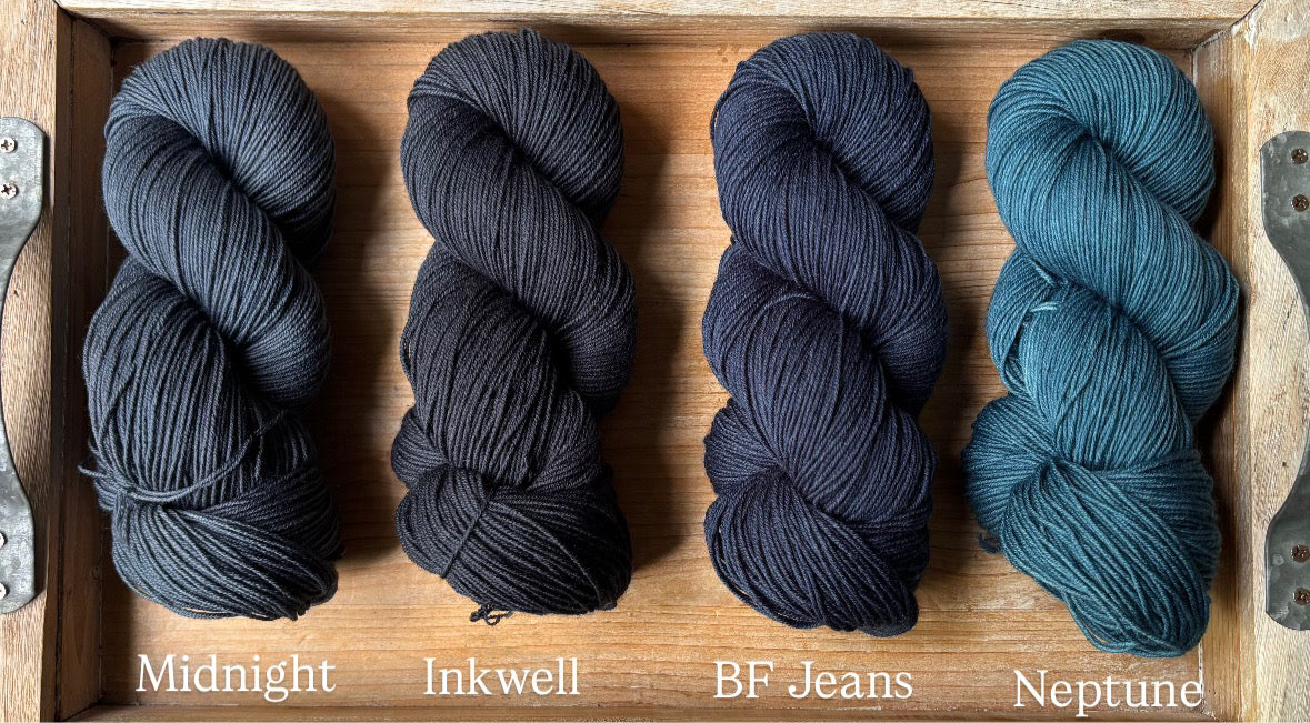 Inkwell is a deep, dark blue colour. Because of the large amount of dye used to create this colour, bleeding may occur. I do my best to avoid this, but it can happen with colours like Inkwell.