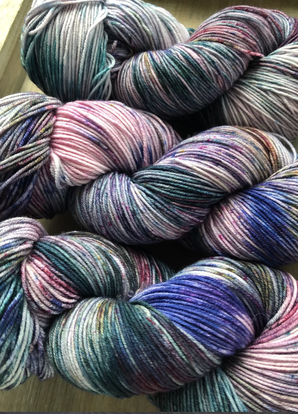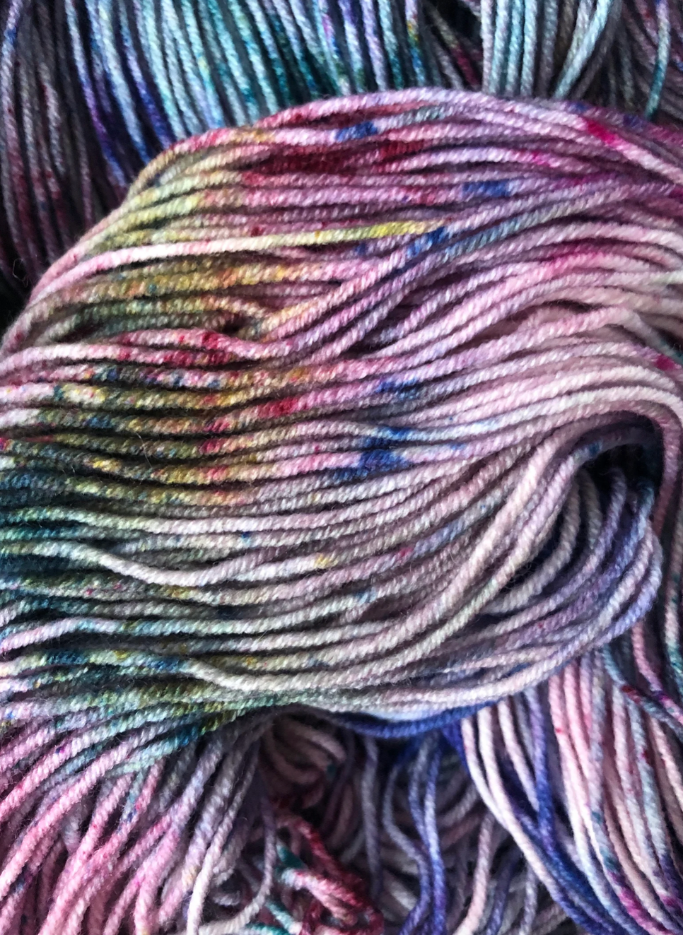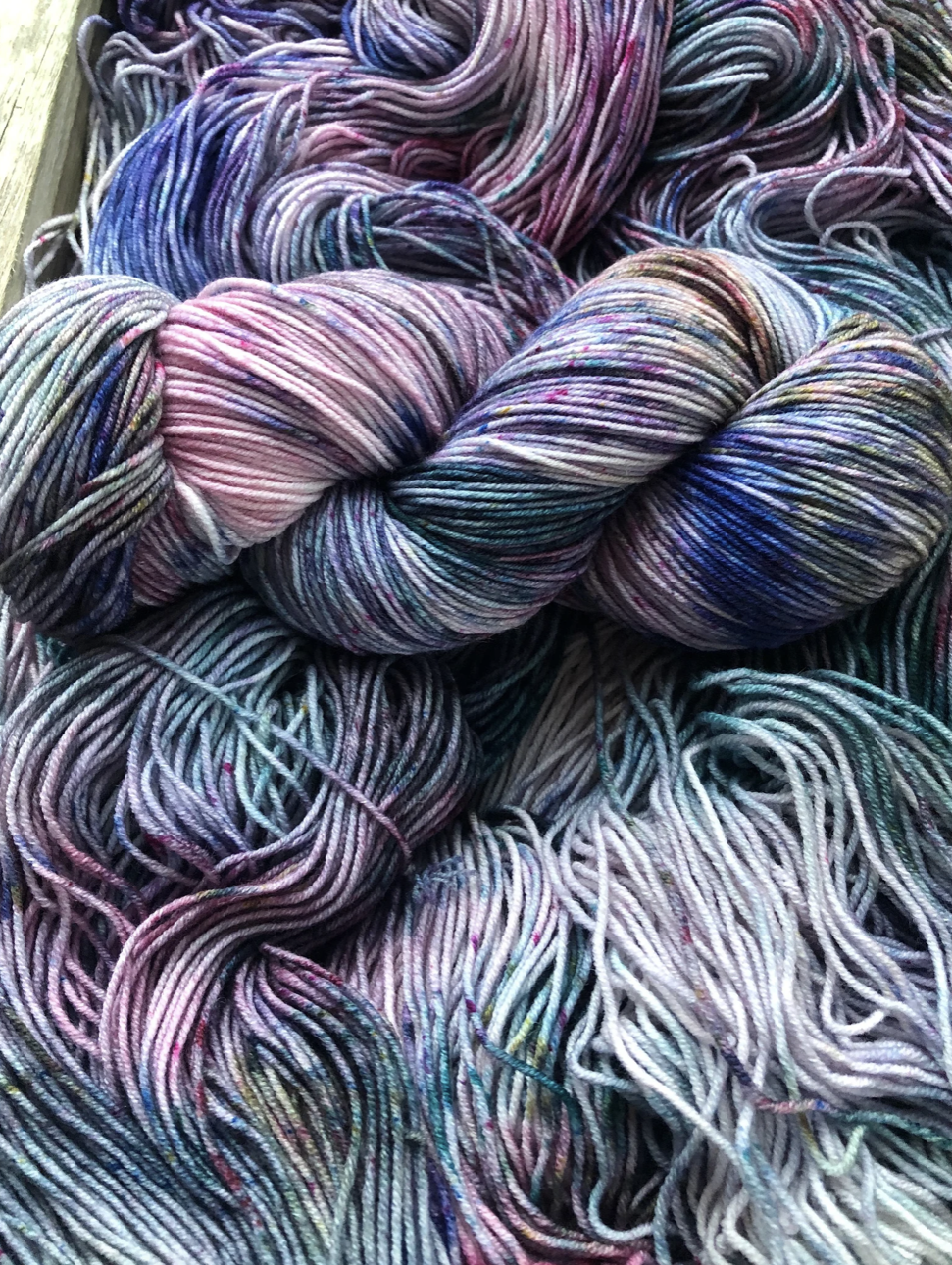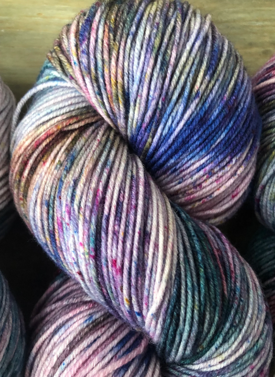 Moondance is truly something special. Photographing these colourways was challenging, because it's difficult to capture how truly unique each skein is. Even when dyed in the same batch, in the same pan, each skein is truly one of a kind. And once twisted into a skein, we loose a lot of visibility of the swirling blends of colours and speckles. Once you unwrap the yarn, all the beauty is released and you can really see how special these colourways are. Alternating skeins in between rows is suggested when using any hand dyed yarn like this