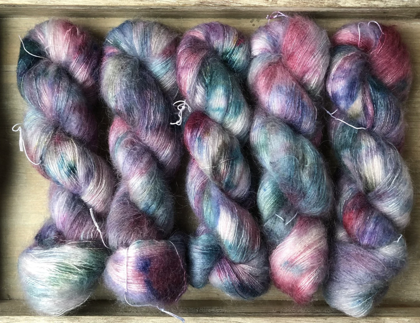 Yes, Suri! Lace Base: Take your project to the next level of luxury with this gorgeous lace weight yarn base! Made up of 75% Brushed Baby Suri Alpaca, and 25% Mulberry Silk, each 50 gram skein comes with 328 yards of fluffy magic. This base can be somewhat of a wild card when it comes to dye recipe consistency, as is often the case with Alpaca blends, so please do not hesitate to reach out to me as I’m always happy to send ‘preview photos’ before shipping, just to make sure we get it right! Yes, Suri! is significantly softer than Mohair Halo and is a great choice for anyone who wants something less itchy for next to skin wear. This base has a bit more drape and creates a less stiff fabric than Mohair Halo. Fibres in this yarn base are sourced from South America. Hand wash only, lay flat to dry, and colour bleeding is quite typical for the first few washes, so swatching to test for colour transfer is recommended