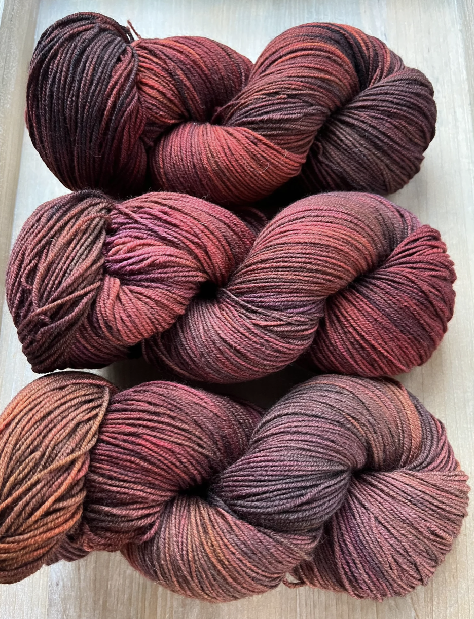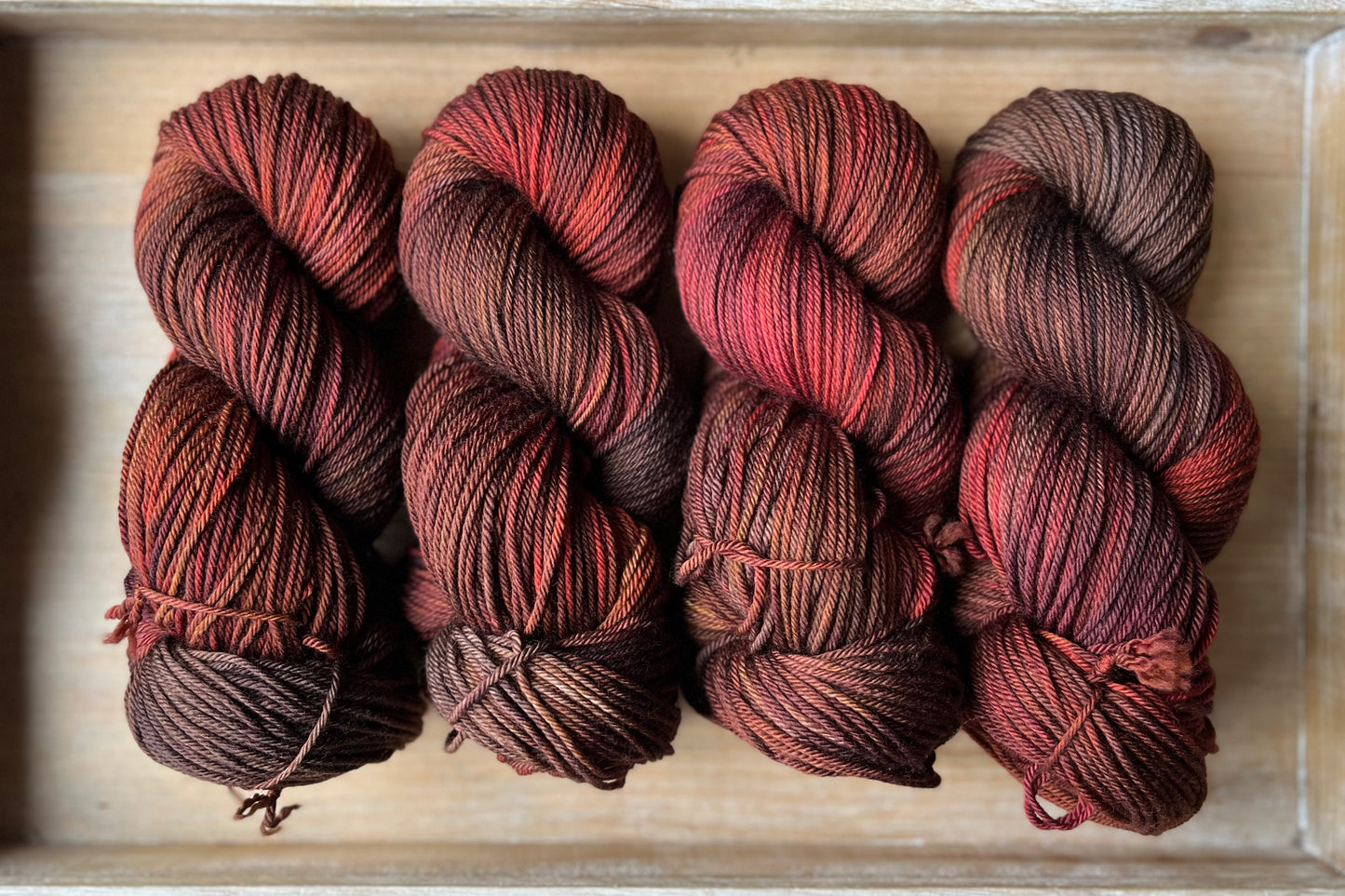 This ultra rich, moody red is such a beautiful colourway. Browns, crimsons, a touch of rusty orange, hints of mauve. This colorway has stolen my heart, and I hope you fall in love with it too.