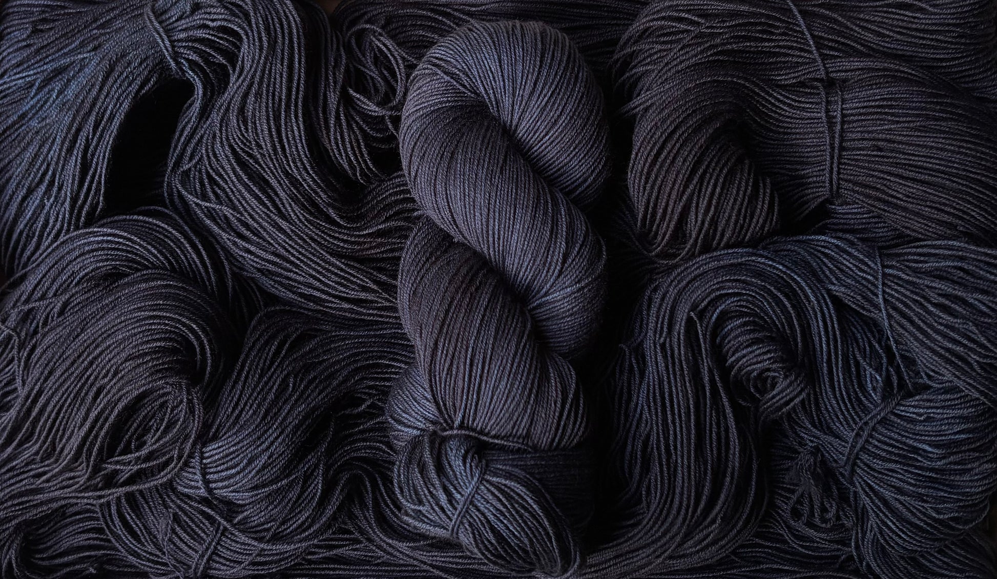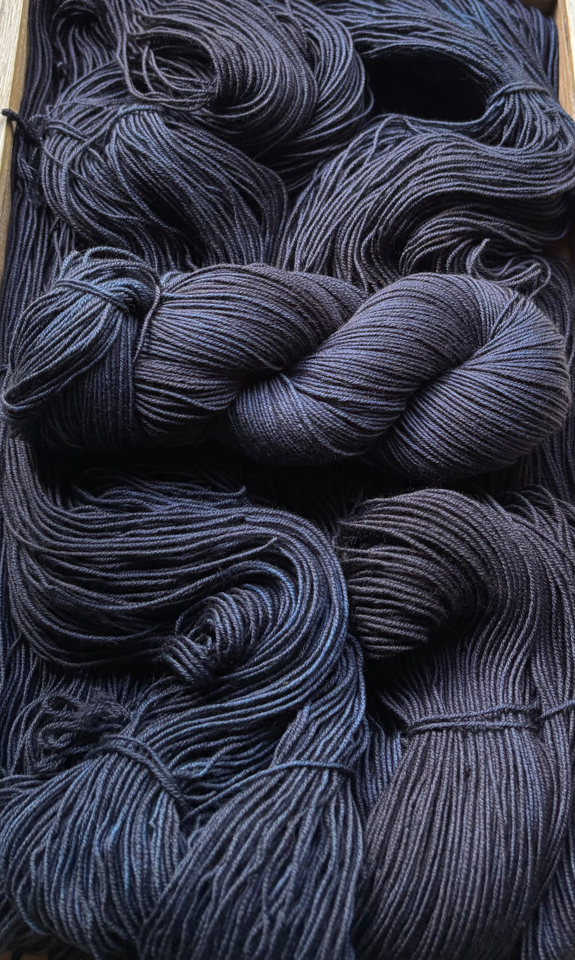 Nightshade is a super deep, almost black, shade of blue, with subtle hints of purple in the mix. This 'semi tonal' is dyed in layers, so there is some gentle variegation within each skein, that fans of hand dyed yarn will love and appreciate!
