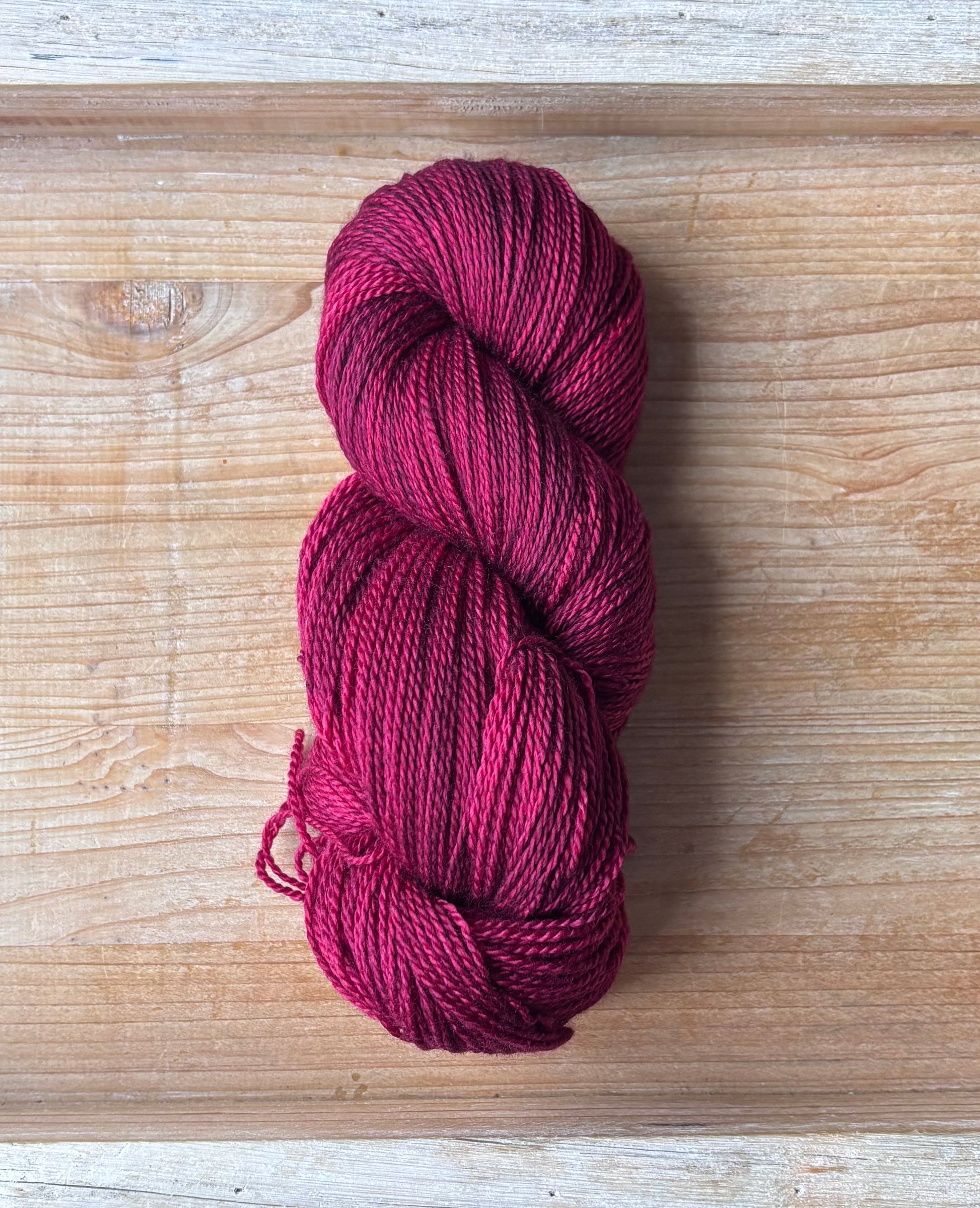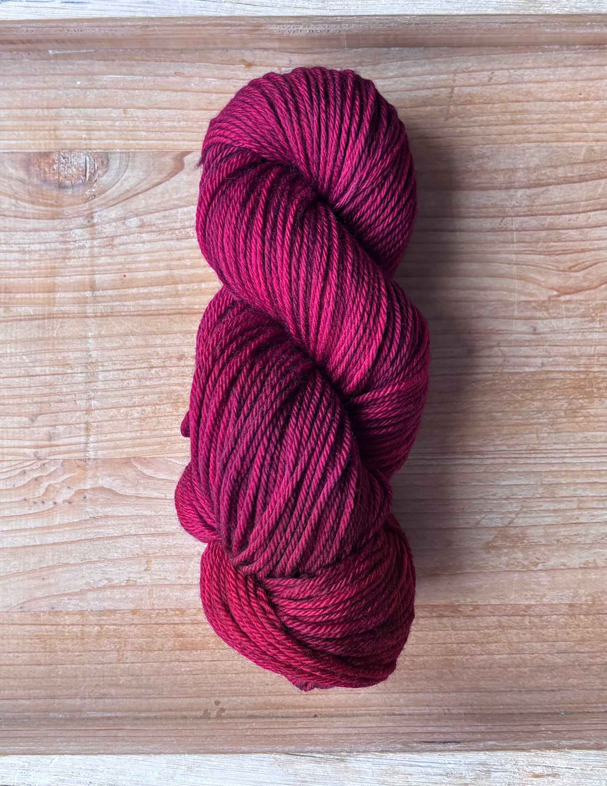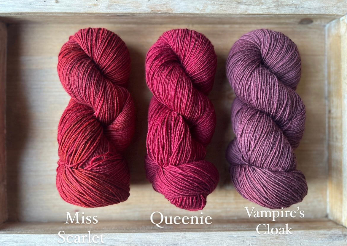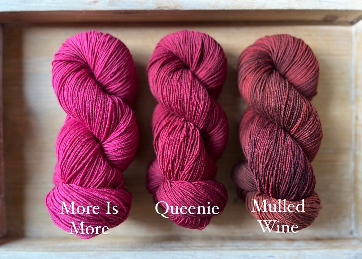 Queenie is an incredible, rich shade of berry red. Leaning more to the purple side of red, this colourway is so deep and saturated, it is often tricky to capture the big hues on camera. You have to see it to believe it! This magnificent dye recipe uses a ton of colour to achieve this rich tone, you may find colour bleeding more prevalent with Queenie. Please add a dash of white vinegar to the dye bath to help settle the dyes within the yarn base.