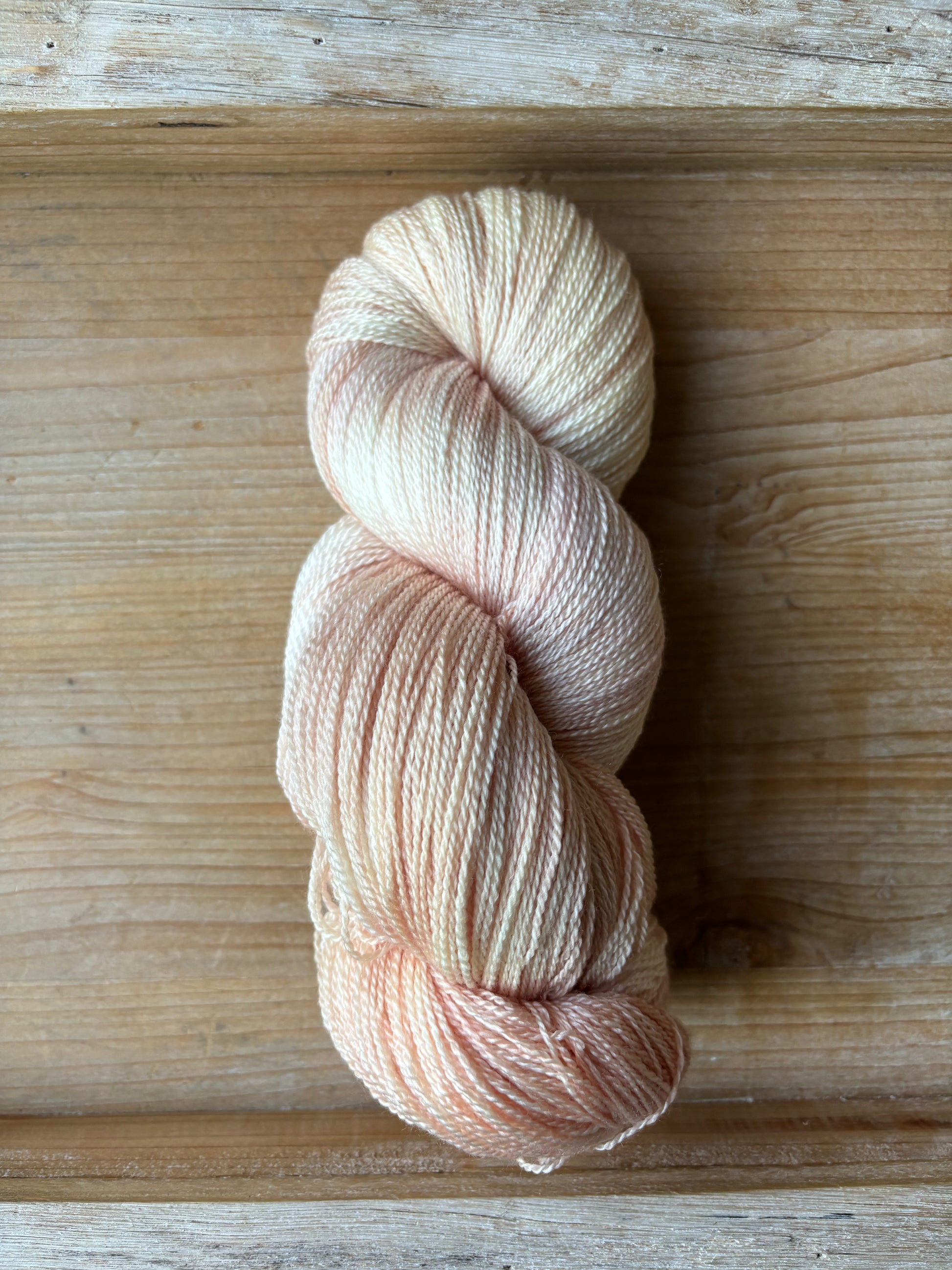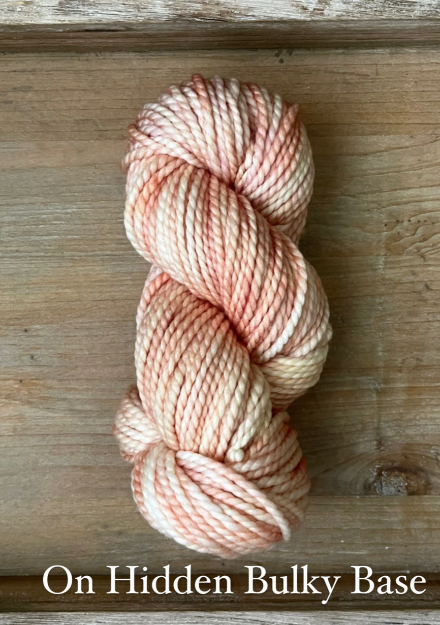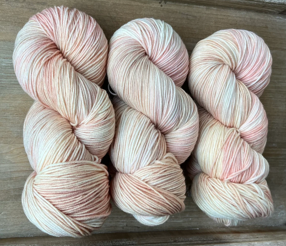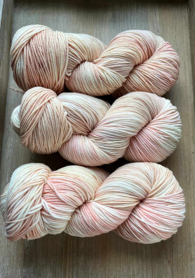 She Sells Seashells is the softest blend of peachy oranges and wisps of pinks, very much like you would find inside a seashell. This colourway pairs gorgeously with Double Cream, Antique Treasures or Grandmothers Pearls. After dyeing many batches of this colourway, it has to be noted, each dye lot is so incredibly different. Sometimes this colourway looks more peachy or more coral-y or more pink. It’s such a delicate, light mix of colours, that the slightest change can throw the whole thing off. I always do my best to strive for consistency, but please note, that the photos shown are only from one dye lot and might not look exactly the same as what you receive if you order this colourway.