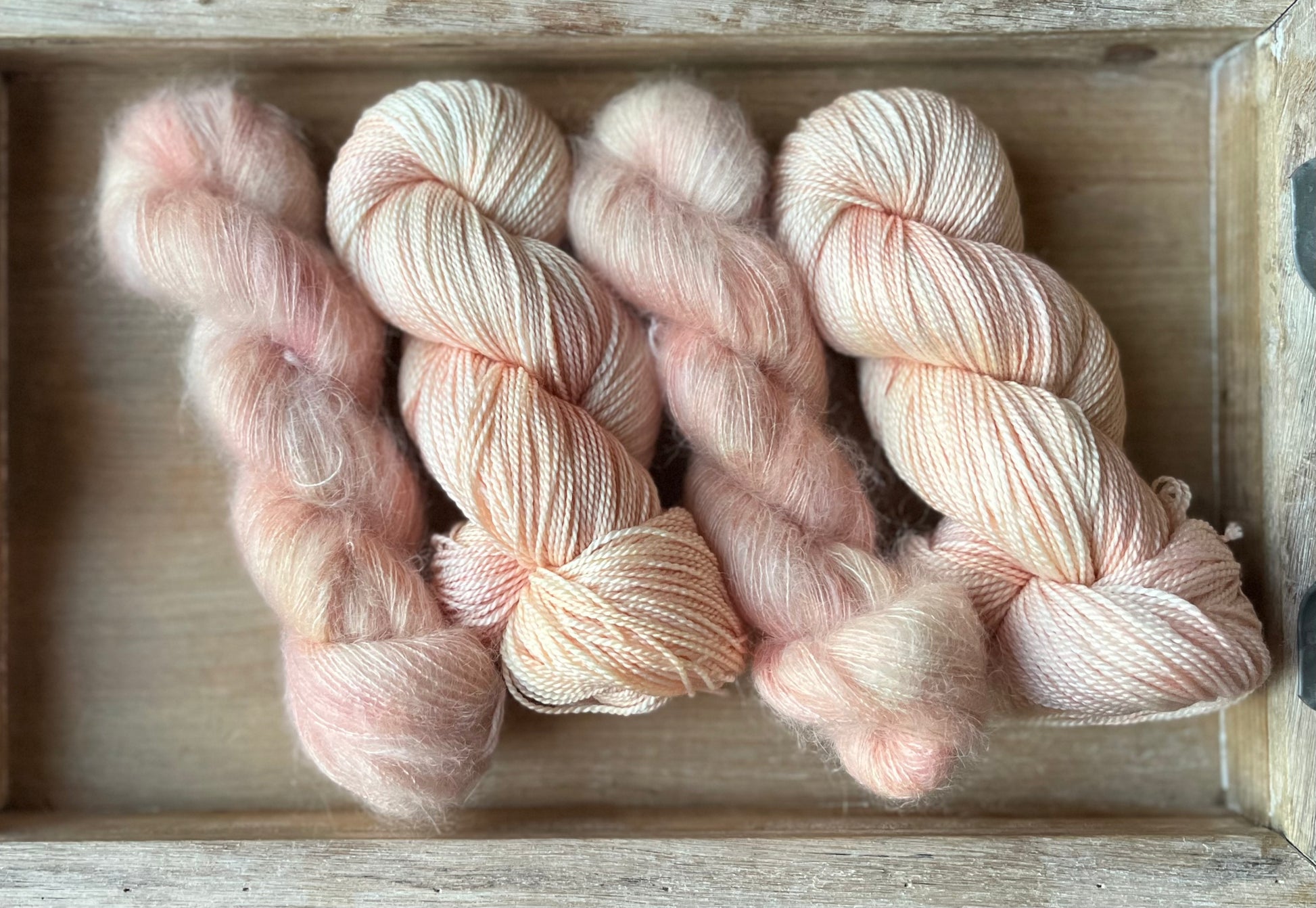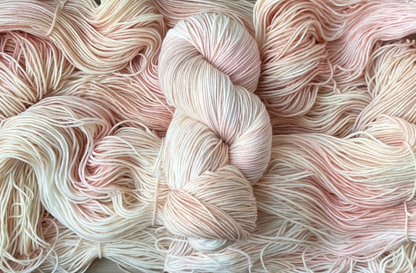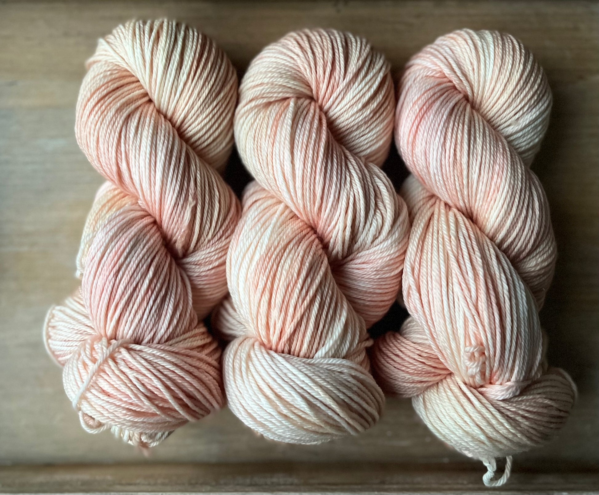 She Sells Seashells is the softest blend of peachy oranges and wisps of pinks, very much like you would find inside a seashell. This colourway pairs gorgeously with Double Cream, Antique Treasures or Grandmothers Pearls. After dyeing many batches of this colourway, it has to be noted, each dye lot is so incredibly different. Sometimes this colourway looks more peachy or more coral-y or more pink. It’s such a delicate, light mix of colours, that the slightest change can throw the whole thing off. I always do my best to strive for consistency, but please note, that the photos shown are only from one dye lot and might not look exactly the same as what you receive if you order this colourway.