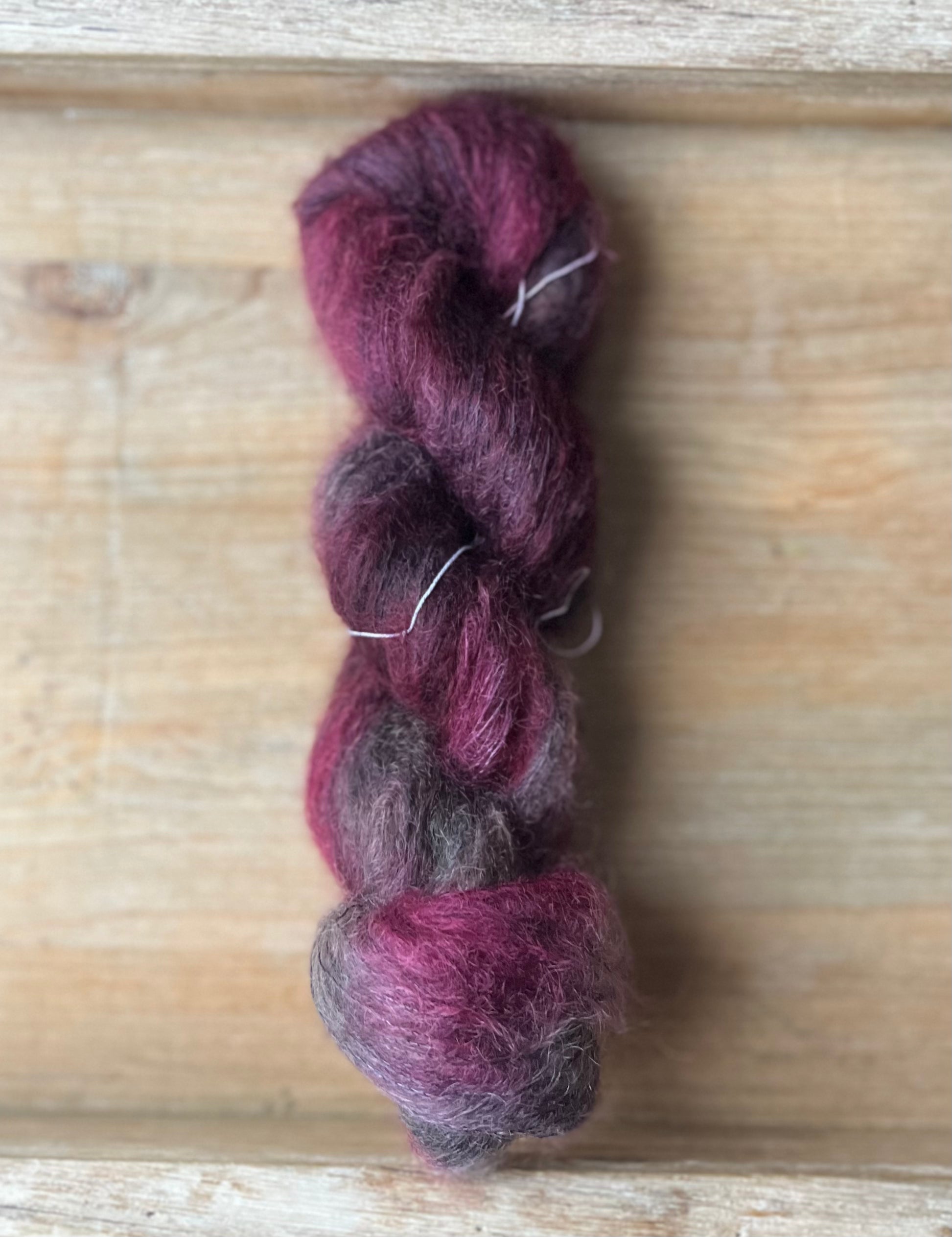 Mohair Halo Base: A delicate, lace weight yarn made up of 72% Superkid Mohair and 28% Mulberry Silk. Each skein is 50 grams and 460 yards, single ply construction. This yarn is lovely on it’s own, but is also amazing when held together with another yarn base. The fuzziness of the mohair creates a halo of colour within your project. Fibres in this base are sourced from South Africa. Hand wash only, lay flat to dry.