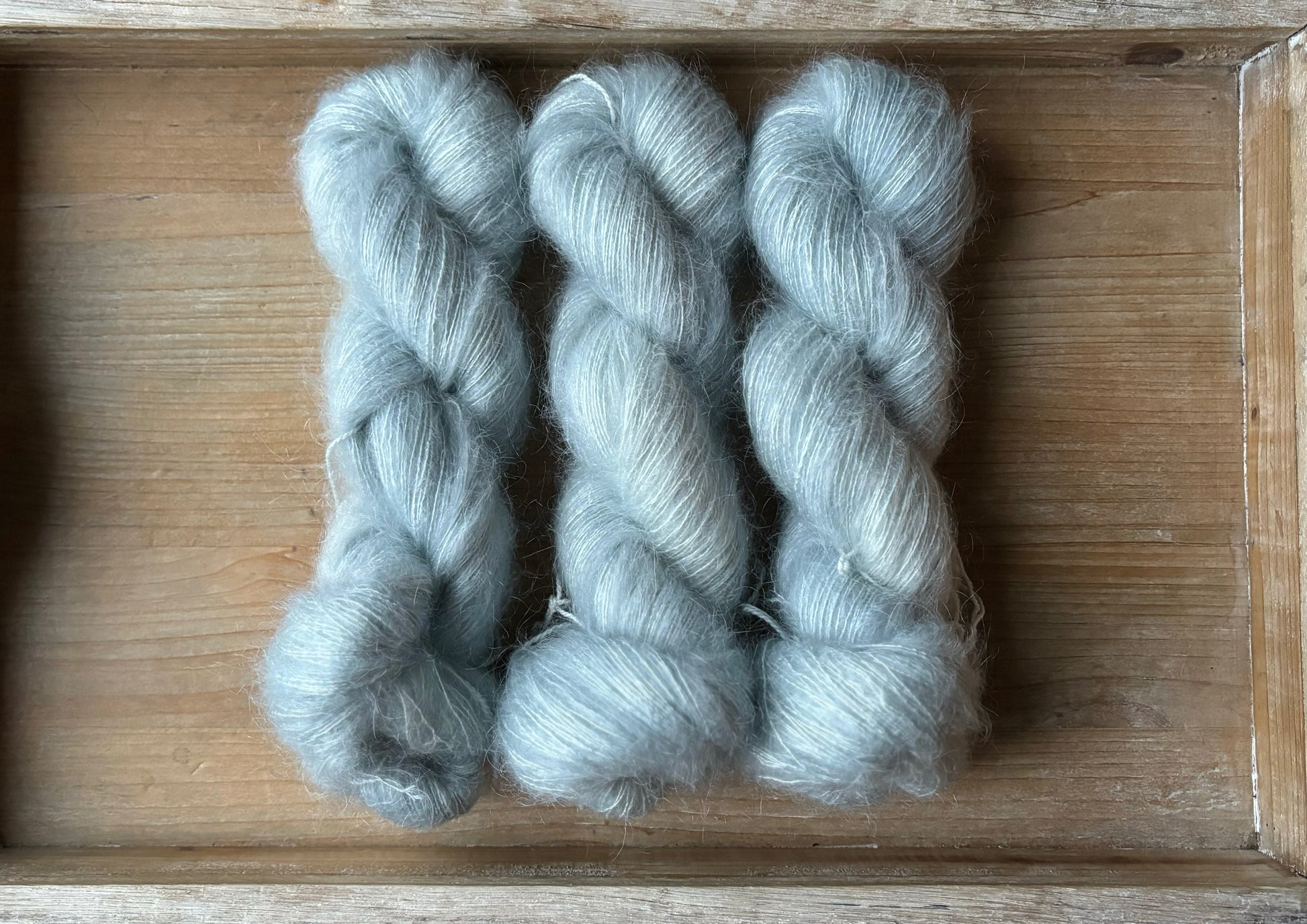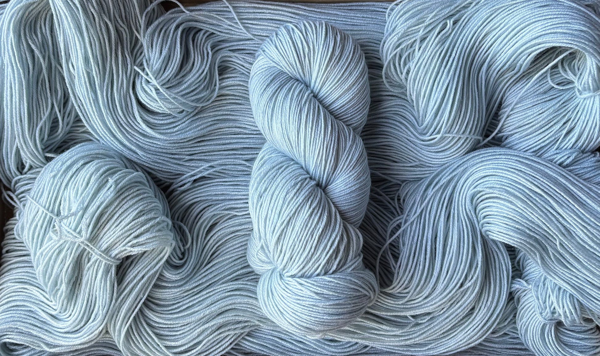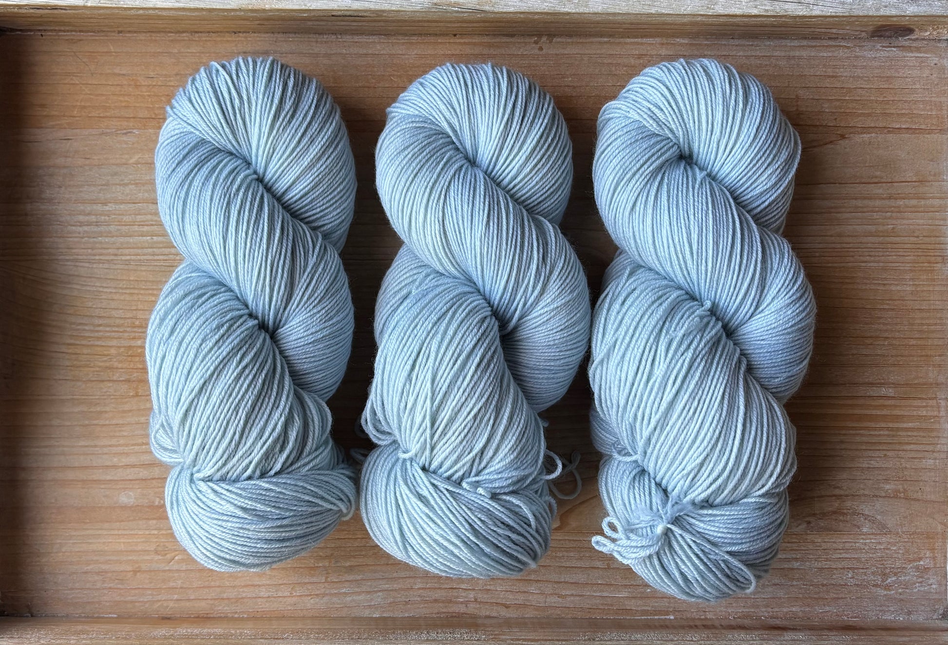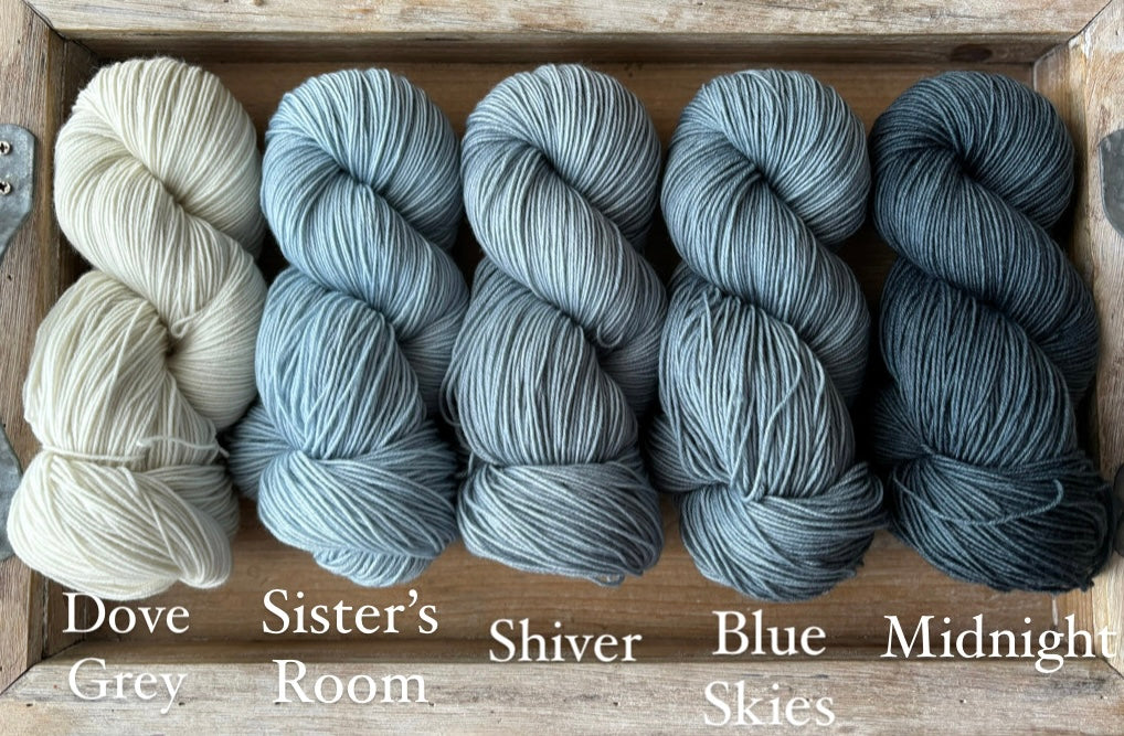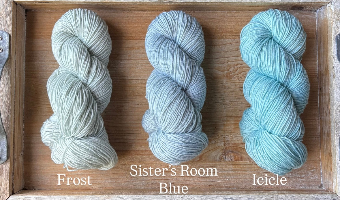 Sister's Room Blue is a light, airy baby blue. This fresh colour pairs beautifully with variegated colourways like Oh Baby and Head In The Clouds, as well as yellows and any other pastel colour. This colourway is super tricky to photograph, it looks much more grey in the photos than it does in person. The most accurate photo of this colourway is the one of the three skeins side by side!