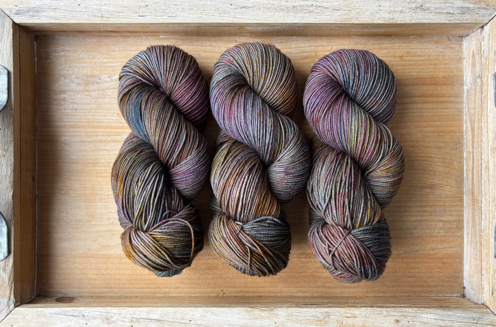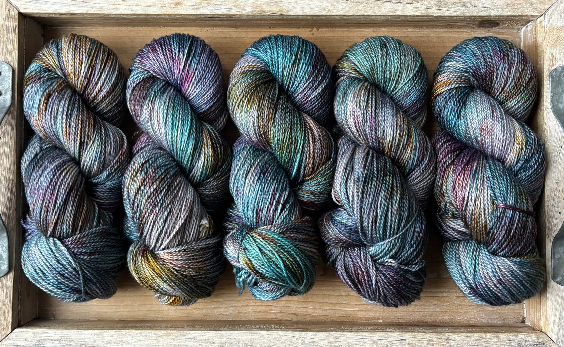 Luxe Sock Base: Luxe Sock is made up of 75% Ultra Fine Merino Wool, 15% Mulberry Silk, and 10% Cashmere. Each skien is 100 grams and 437 yards, 2ply construction. This yarn base is heavenly soft against the skin, and perfect for a special project calling for a high end fingering weight yarn. The Mulberry Silk adds drape and lustre, and the cashmere creates a fuzzy halo effect as you work with it. The colours of dye tend to shine through, looking much more striking and rich compared to some of my samples on Superwash bases. Fibres in this base are sourced from Australia, the wool used in this yarn is ethically produced from sheep that have NOT been mulesed. Hand wash only, lay flat to dry.