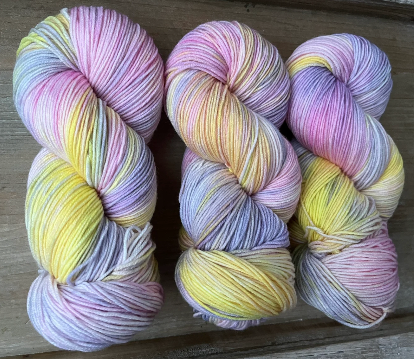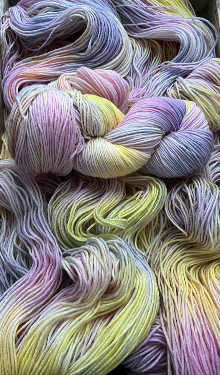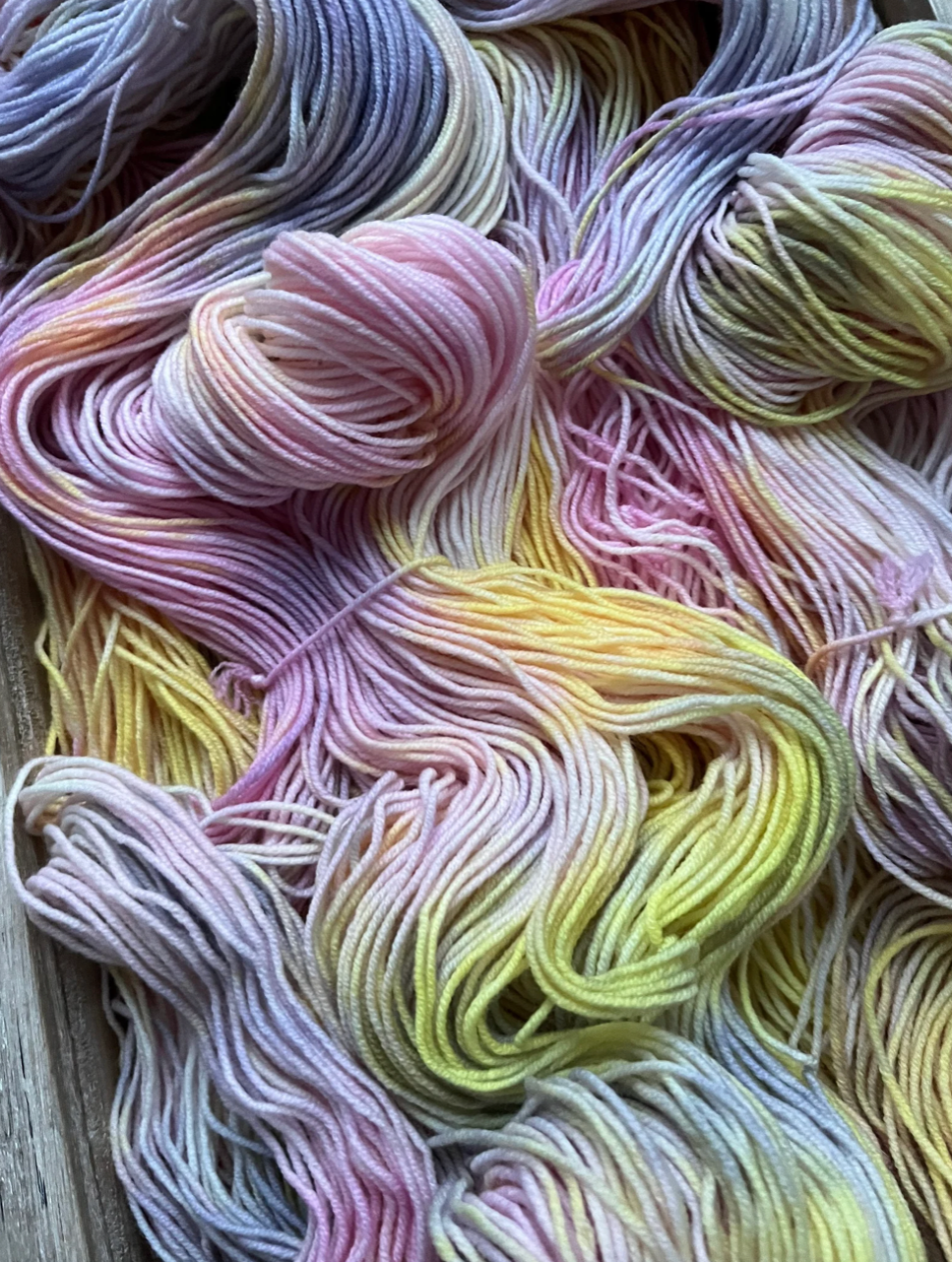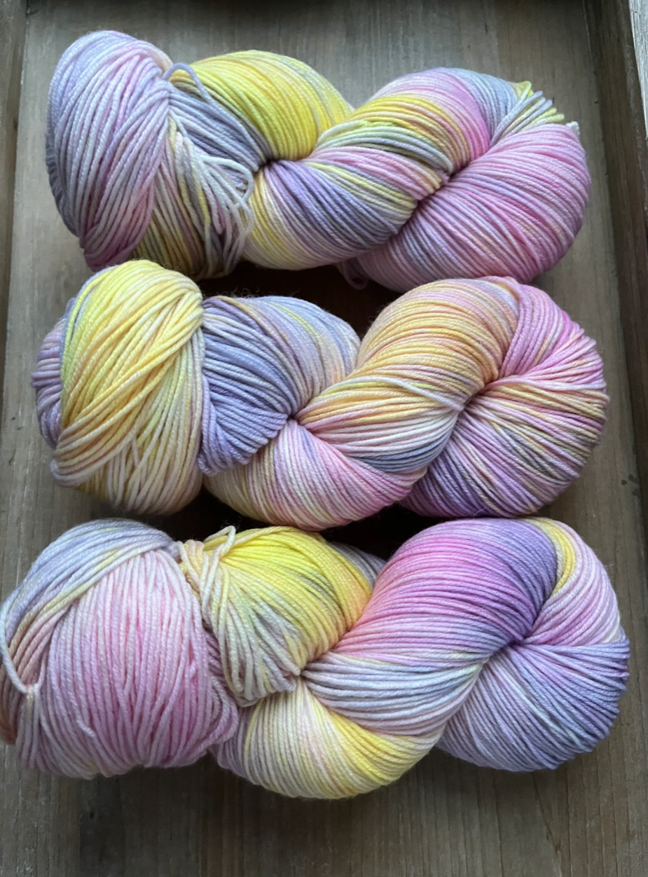Spring Flowers is a soft yet eye catching blend of purples, pinks, and yellows, with subtle hints of orange where the colours meet, this colourways is so delightful yet easy on the eyes!