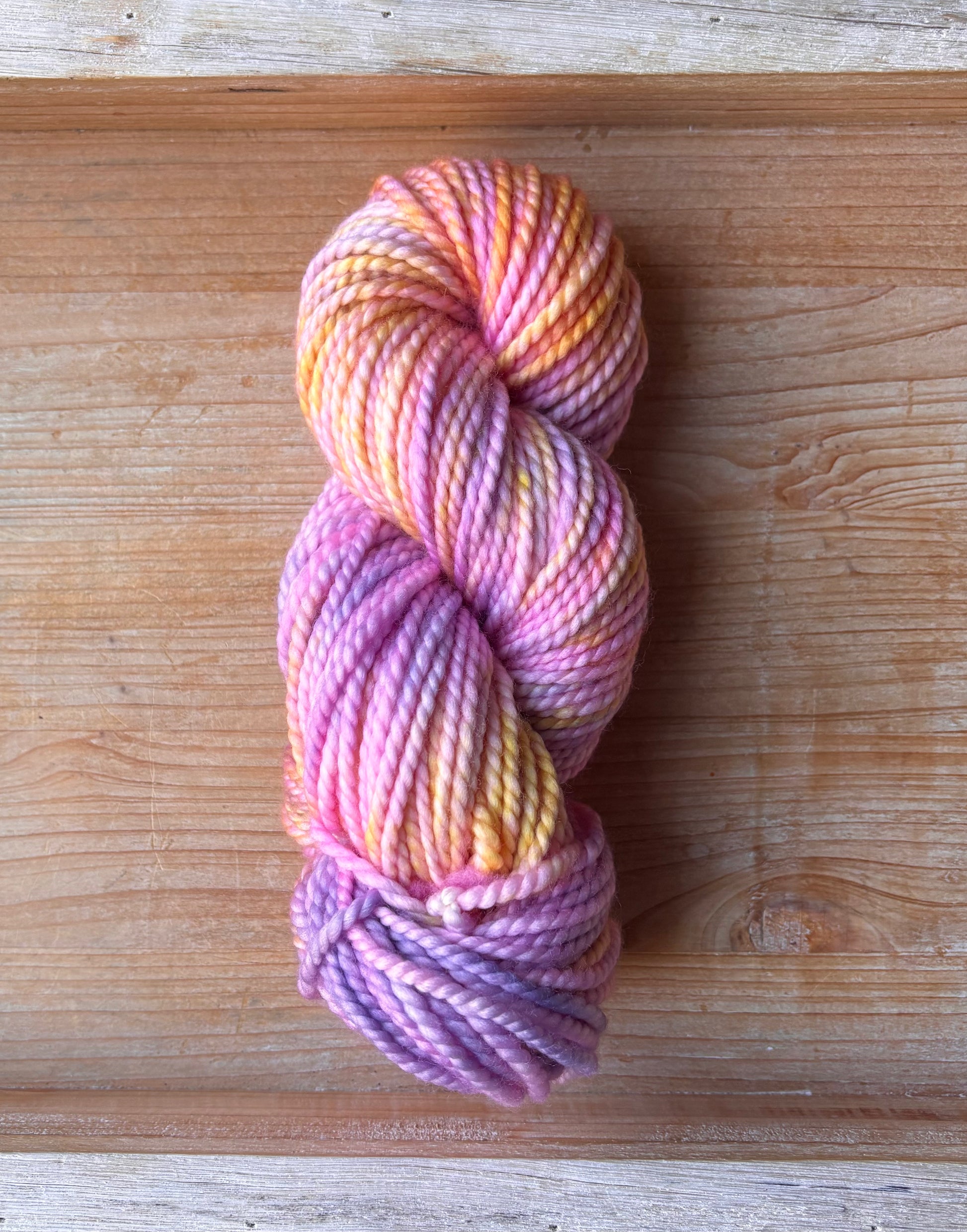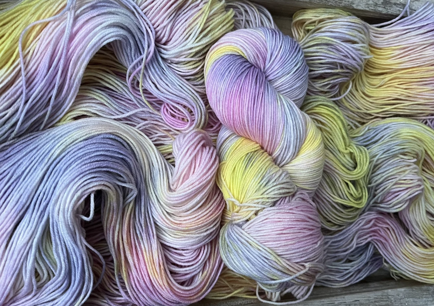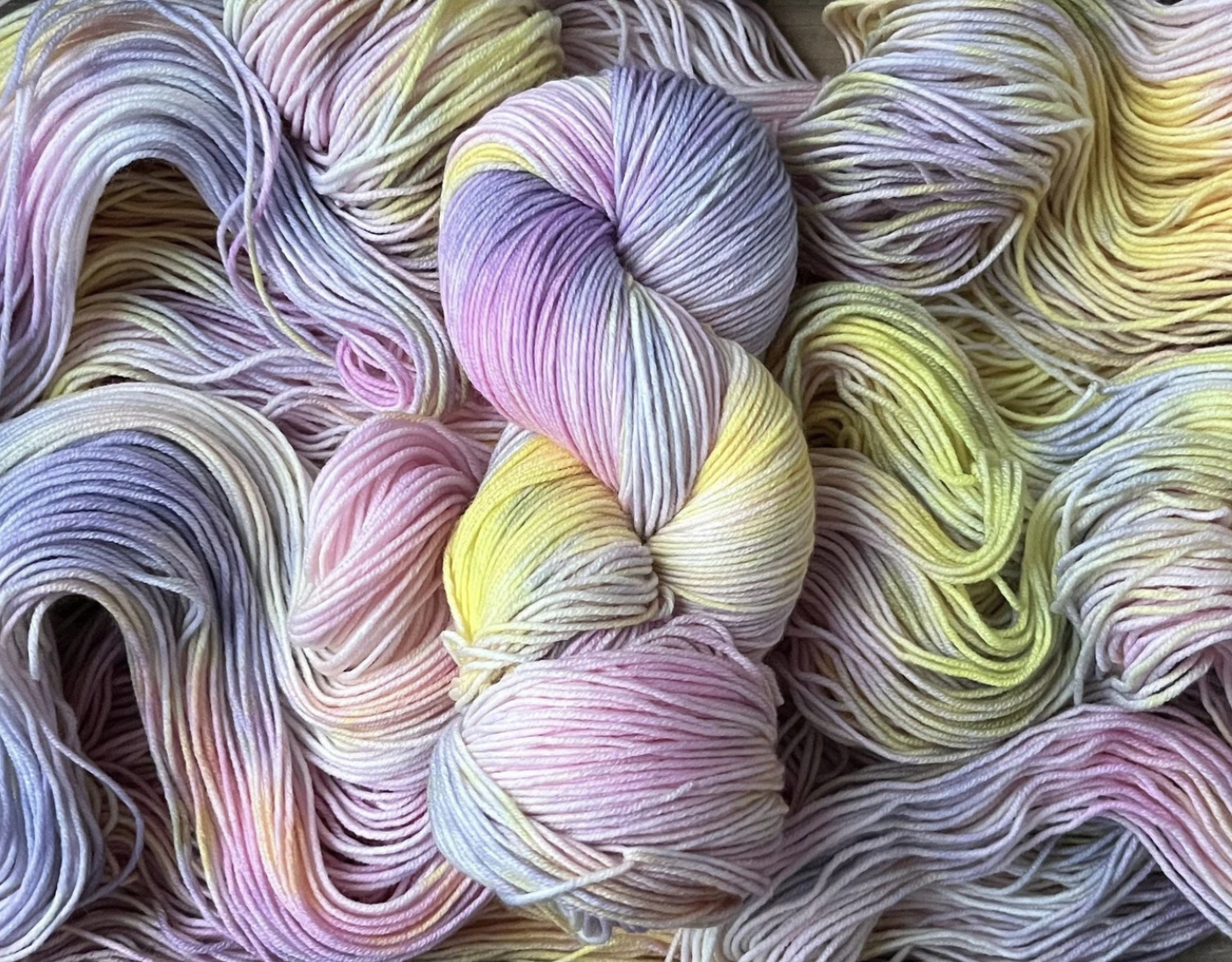 Spring Flowers is a soft yet eye catching blend of purples, pinks, and yellows, with subtle hints of orange where the colours meet, this colourways is so delightful yet easy on the eyes!