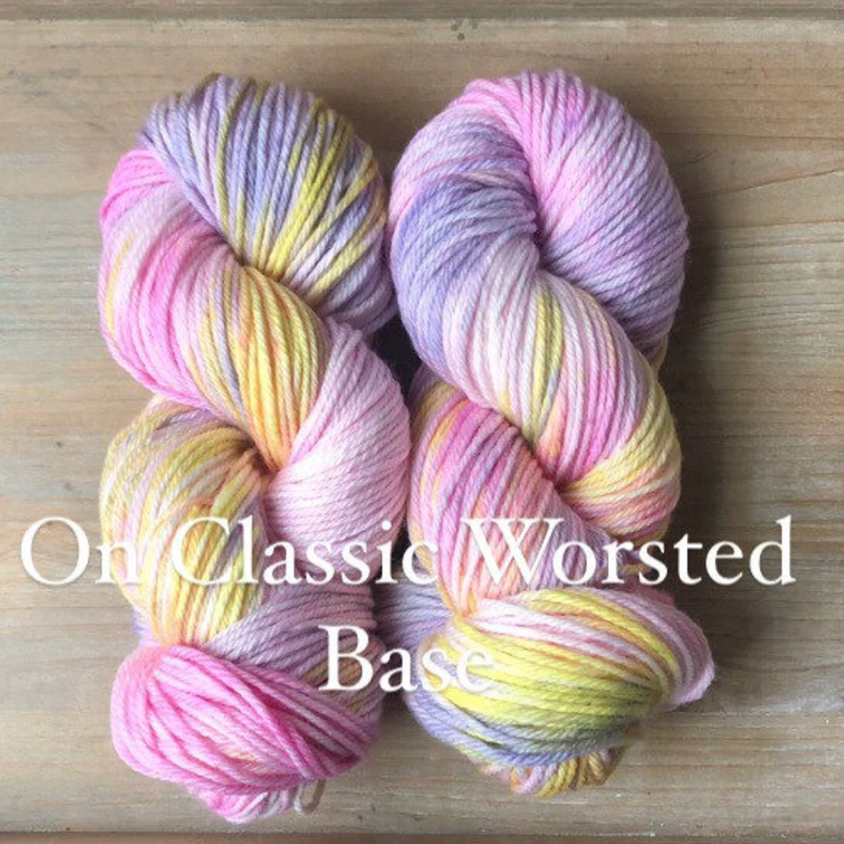 Classic Worsted Base: A soft and full Worsted Base yarn, made up of 100% Superwash Merino Wool. Each skein is 110 grams and 205 yards, with a 4 ply construction. It is plush, and versatile, with terrific stitch definition. And thanks to it’s superwash treatment, it is also machine washable on a delicate cycle. A great, practical choice for any project calling for a Worsted Weight base. Fibres in this base are sourced from Australia.
