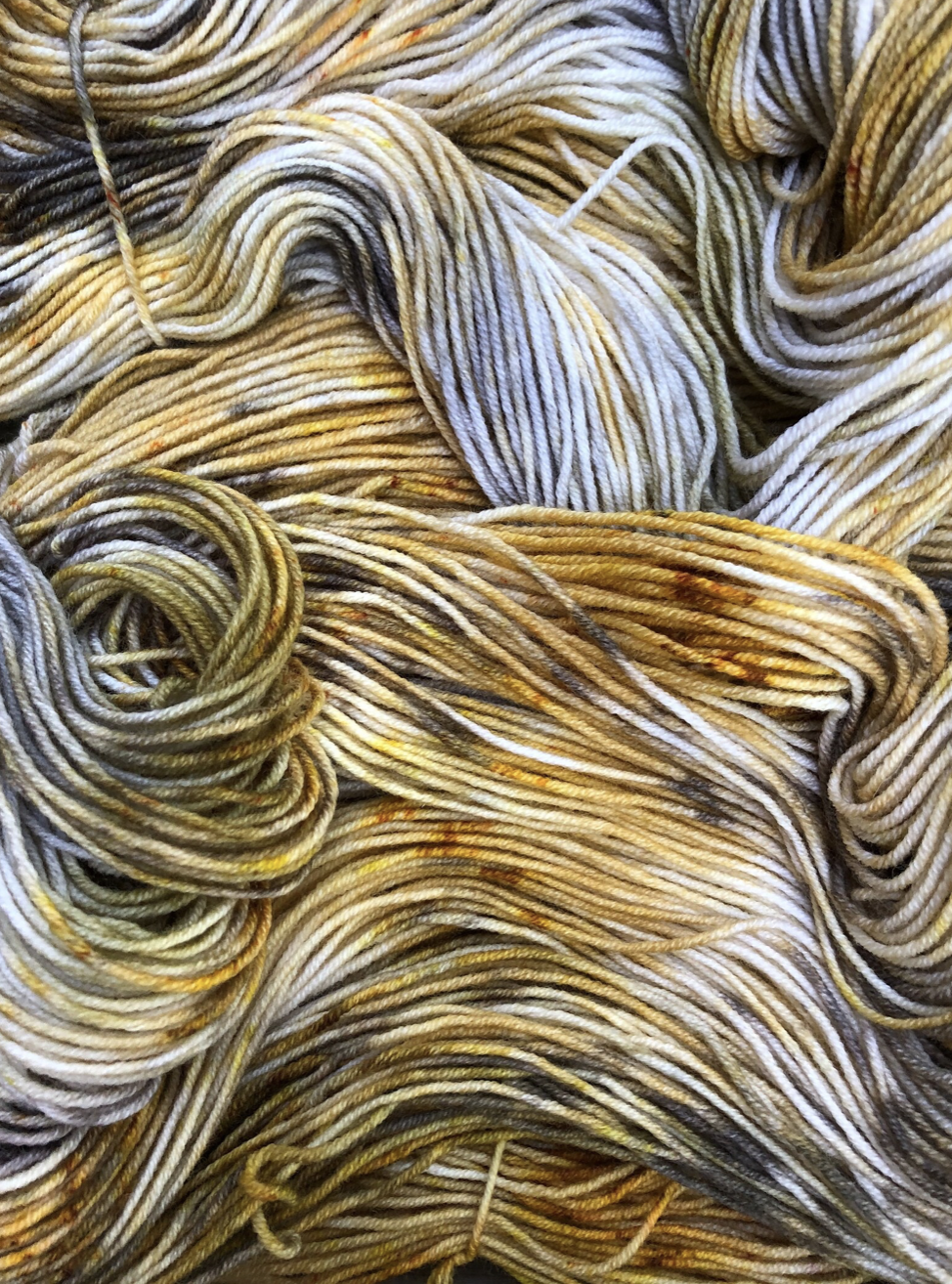 Sunflower is a wonderfully fun variegated colour way. Lots of greys, yellows, and white with speckles of golden hues throughout